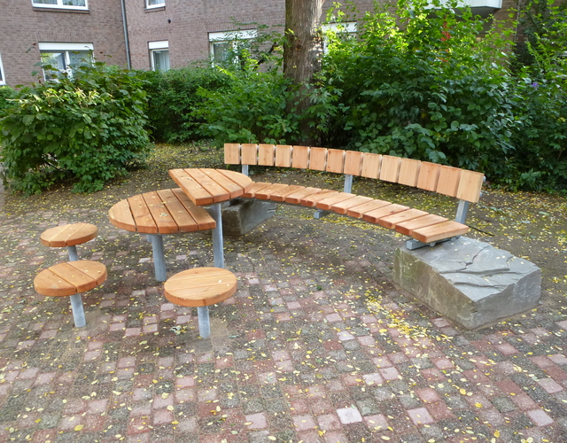 Groß und Klein sitzen hier an einem Tisch: Die geteilte Tischplatte mit ihren unterschiedlichen Höhen ist passend für Erwachsene und Kinder. Das Design wirkt dabei sehr einladend, und so finden alle leicht ihren Platz.