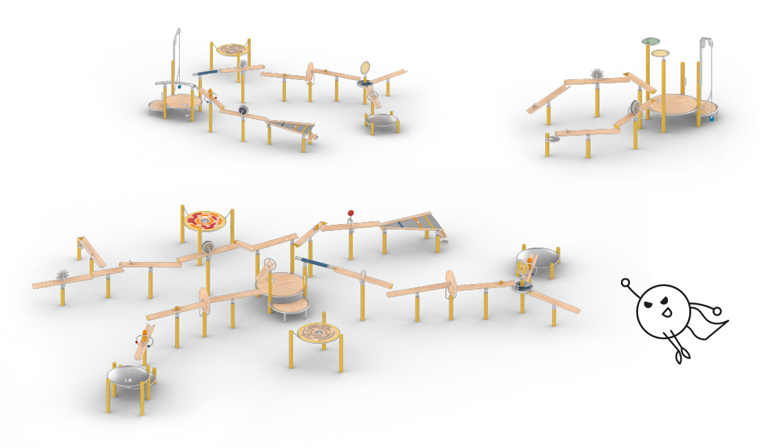Mit verschiedenen Kurven, Röhren, Tunneln und Schalen wird jedes Abenteuer zu einer aufregenden Reise für die Sinne. Kinder jeden Alters können ihre eigenen Wege gestalten, während sie die Gesetze der Physik erkunden und verstehen lernen. Sie können sich – für wenig Geld – eine Murmel aus dem Spender ziehen, diese behalten und immer wieder verwenden.