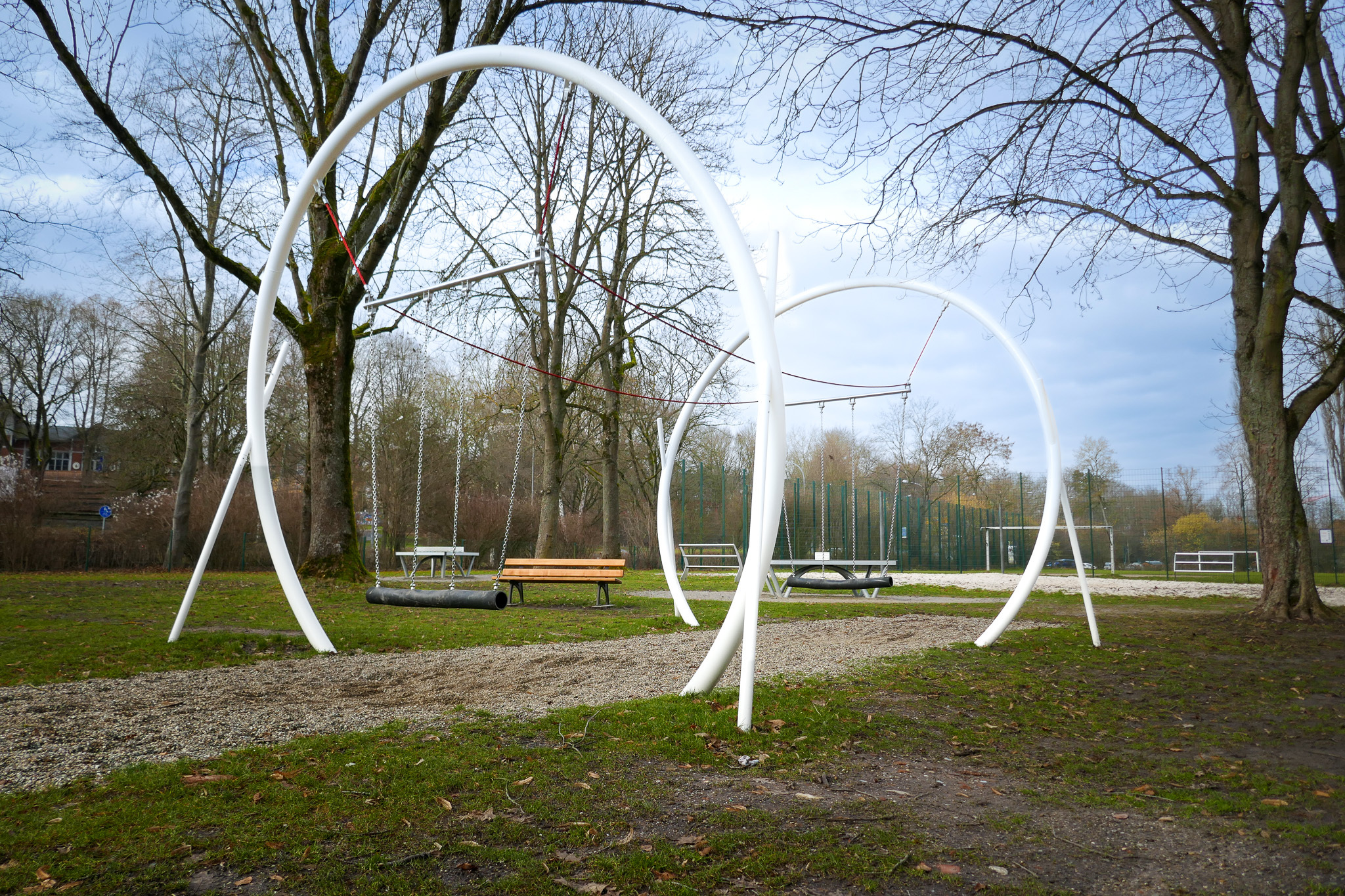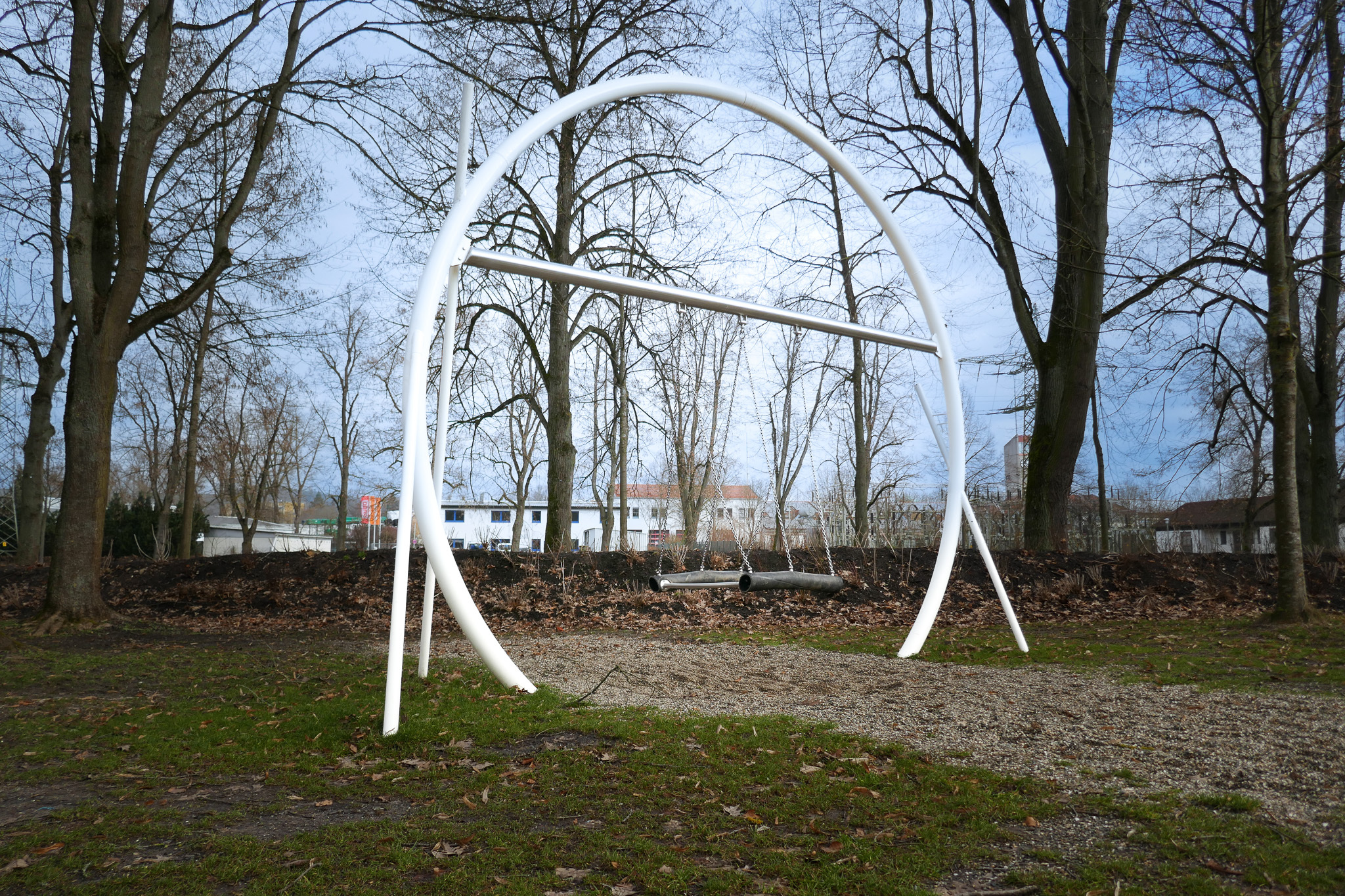 Eine Schaukelwelt mit fünf verschiedenen Schaukeln aus unserem Hause ergänzt den Spielplatz an der Hindenburgstraße in Bayreuth.