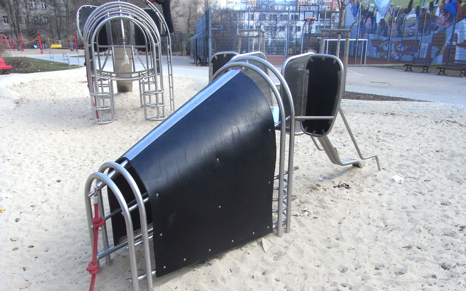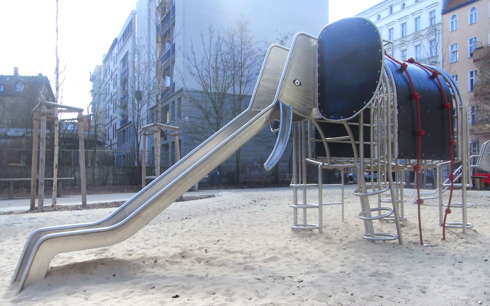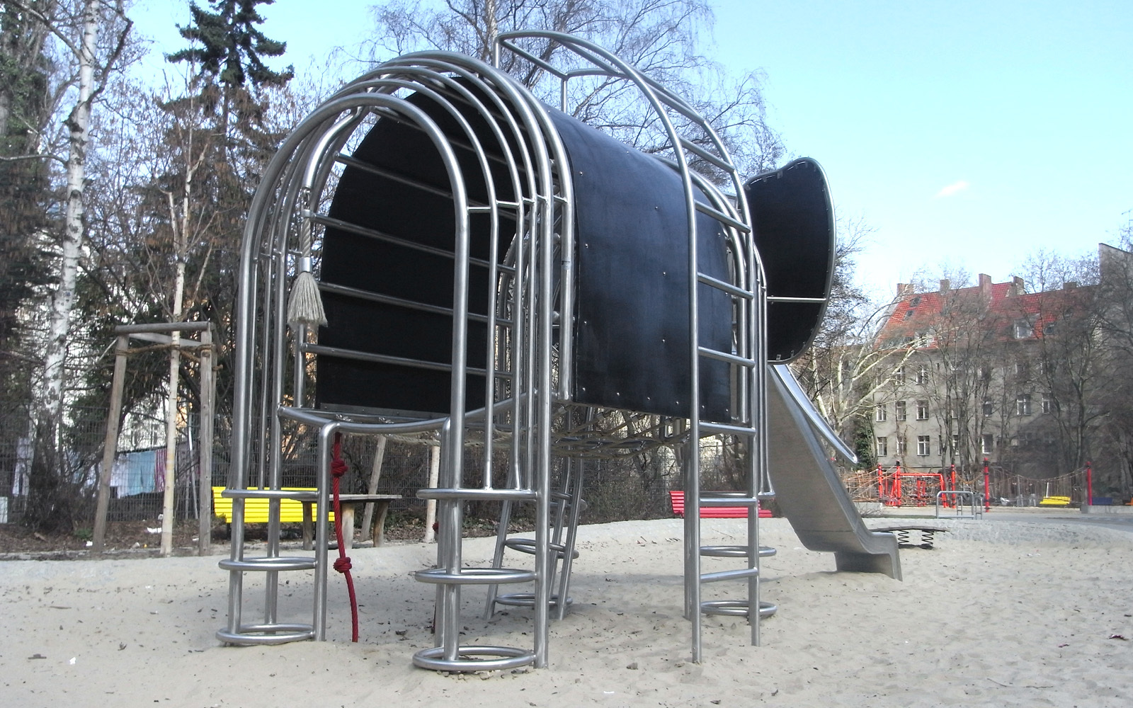 Der Spielplatz in der Adolfstraße von Berlin ist um zwei Attraktionen reicher: zwei Elefanten. Die Grundkonstruktion der Elefanten besteht aus Stahlrohren in den Durchmessern 34 und 48 mm und erfüllt die normgerechte Funktion eines Klettergerüstes. Die Kletterelefanten aus Edelstahl vereinen verschiedenste Spielangebote in einem Gerät. So sind die Rüssel zur Rutsche geformt; der große stehende Elefant erhielt eine Kastenrutsche und der Rüssel des kleinen, sitzenden Elefanten ist eine Stangenrutsche. Die Schwänzchen der stählernen „Dickhäuter“ sind als Knotenkletterseile eine weitere Möglichkeit des Erklimmens. Jeder Elefant erhielt einen Sattel aus Stahlcordgummiband, aus diesem Material sind auch die Ohren. Zusätzlich befindet sich im Bauch des großen Elefanten ein Liegenetz aus Herkulesmaterial.
