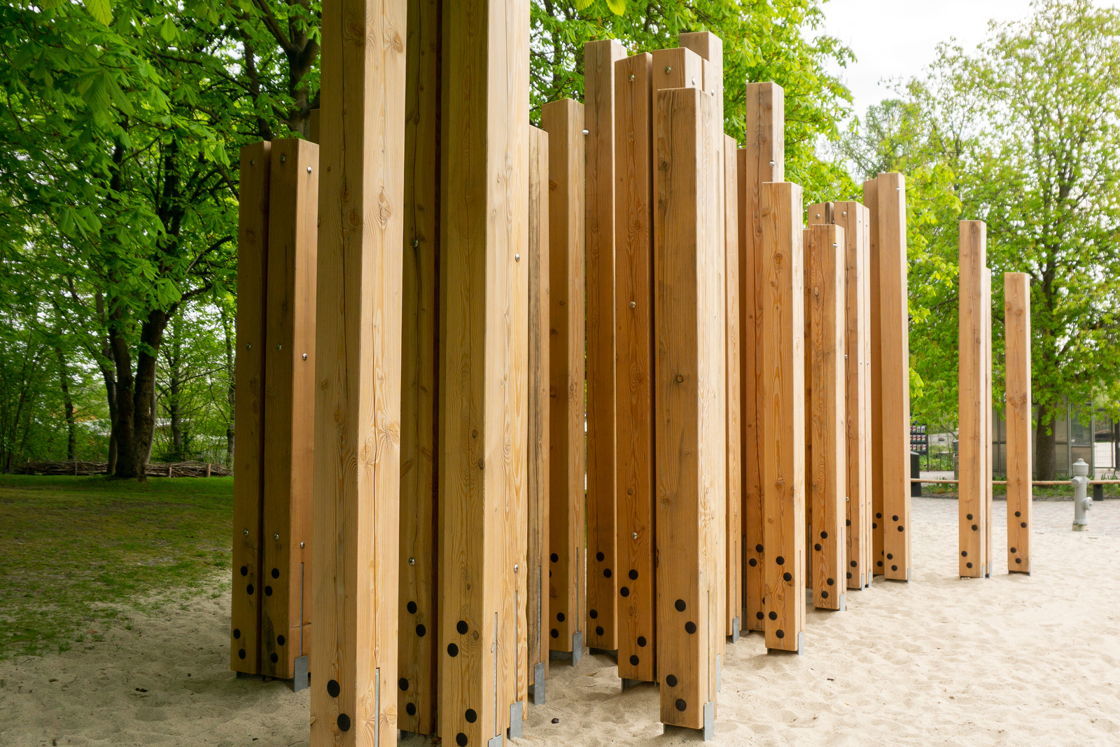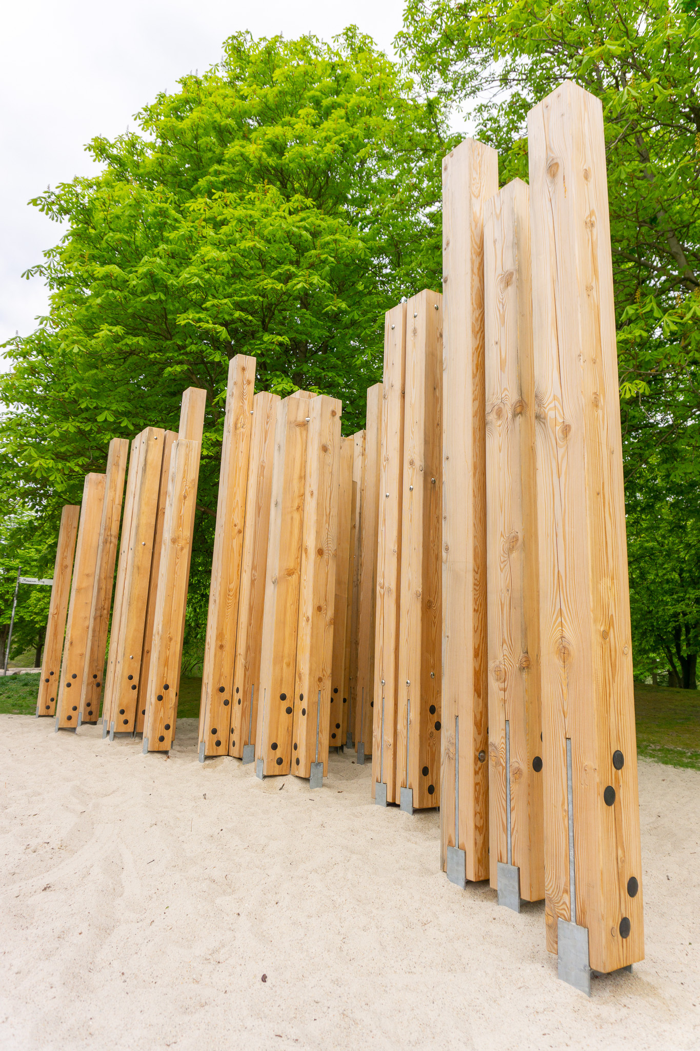 Auf einer Fläche von ca. 35 qm2 ist das Labyrinth in moderner Optik zurückgekehrt. Insgesamt 58 Stelen aus Douglasienholz wurden einzeln, in Zweier- oder Vierer-Gruppen positioniert. Durch die besondere Anordnung der Kanthölzer entstehen labyrinthartige Zwischenräume, die Möglichkeit zum Fang- und Versteckspiel bieten.