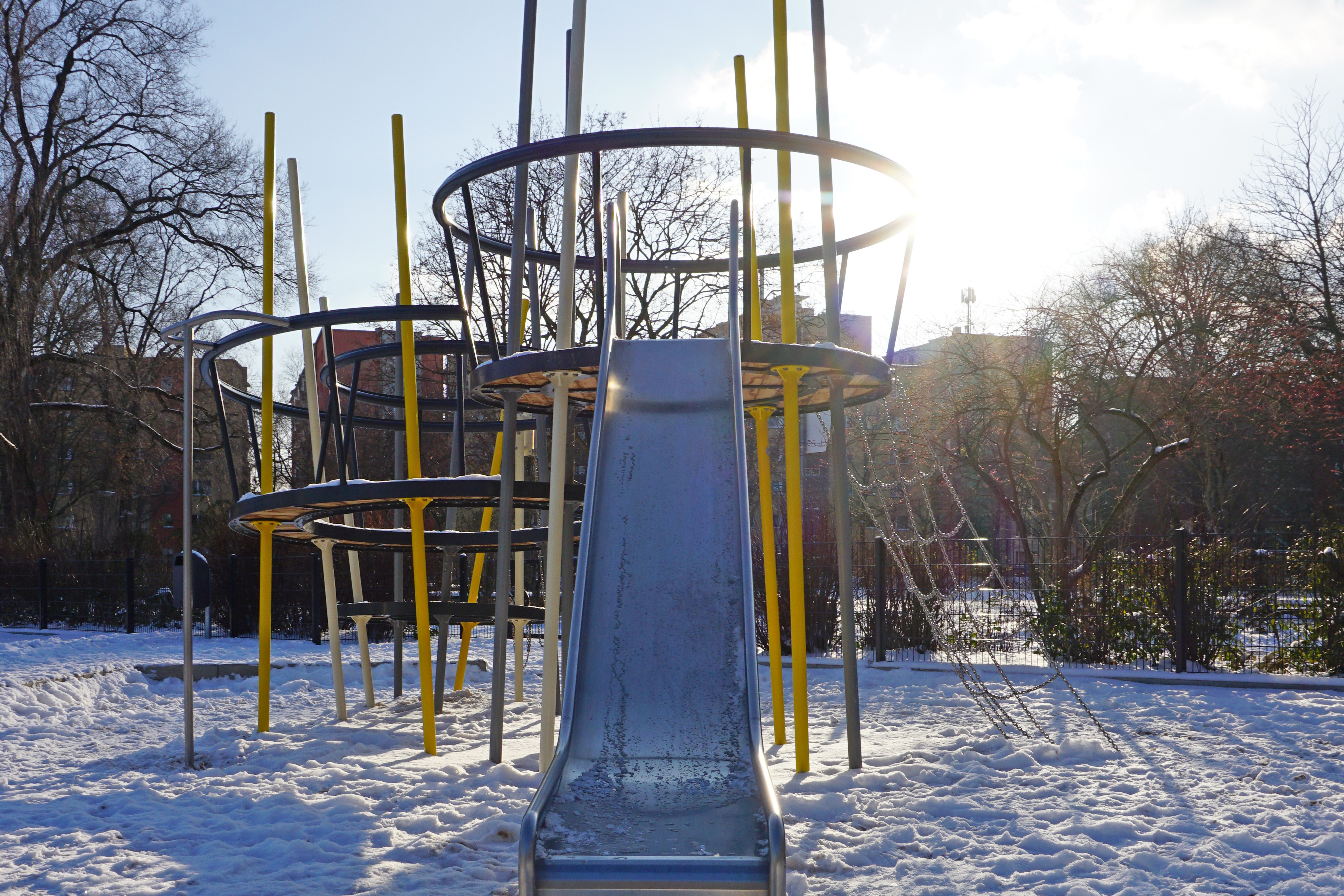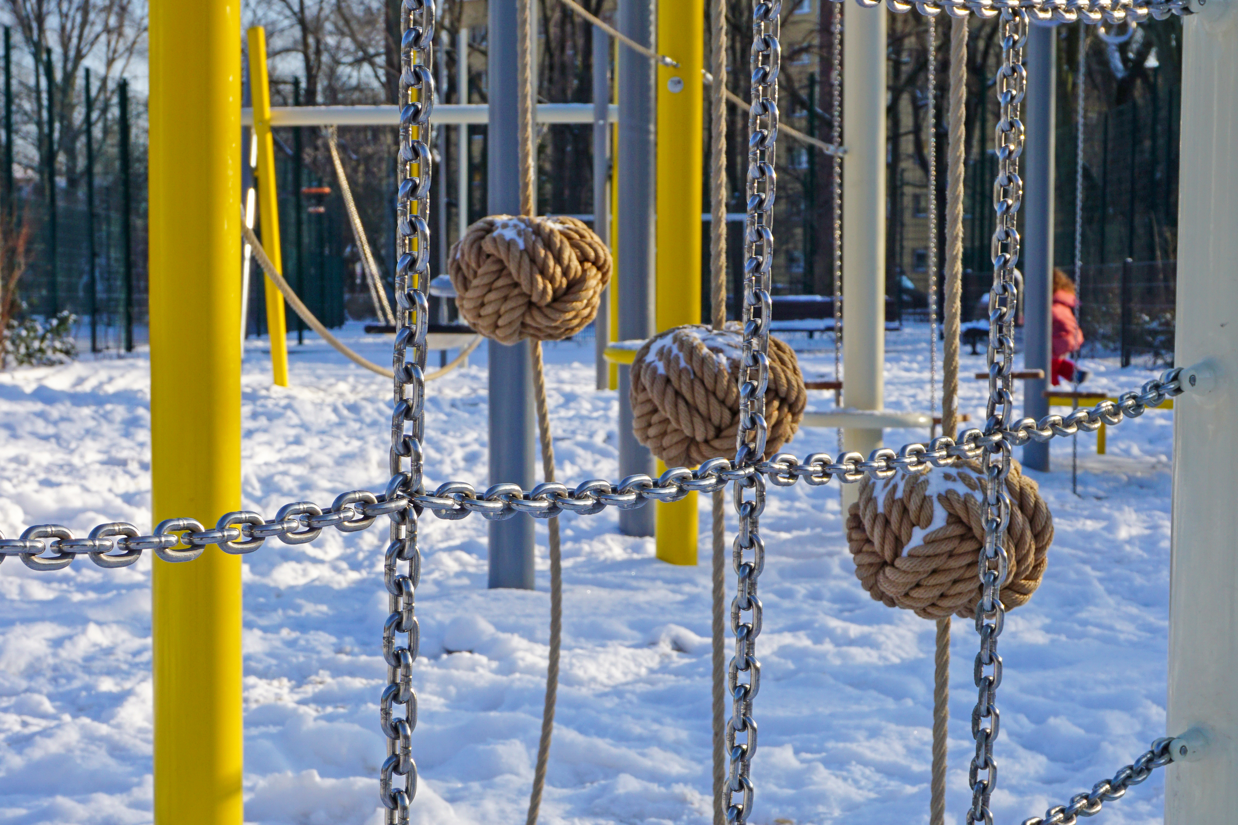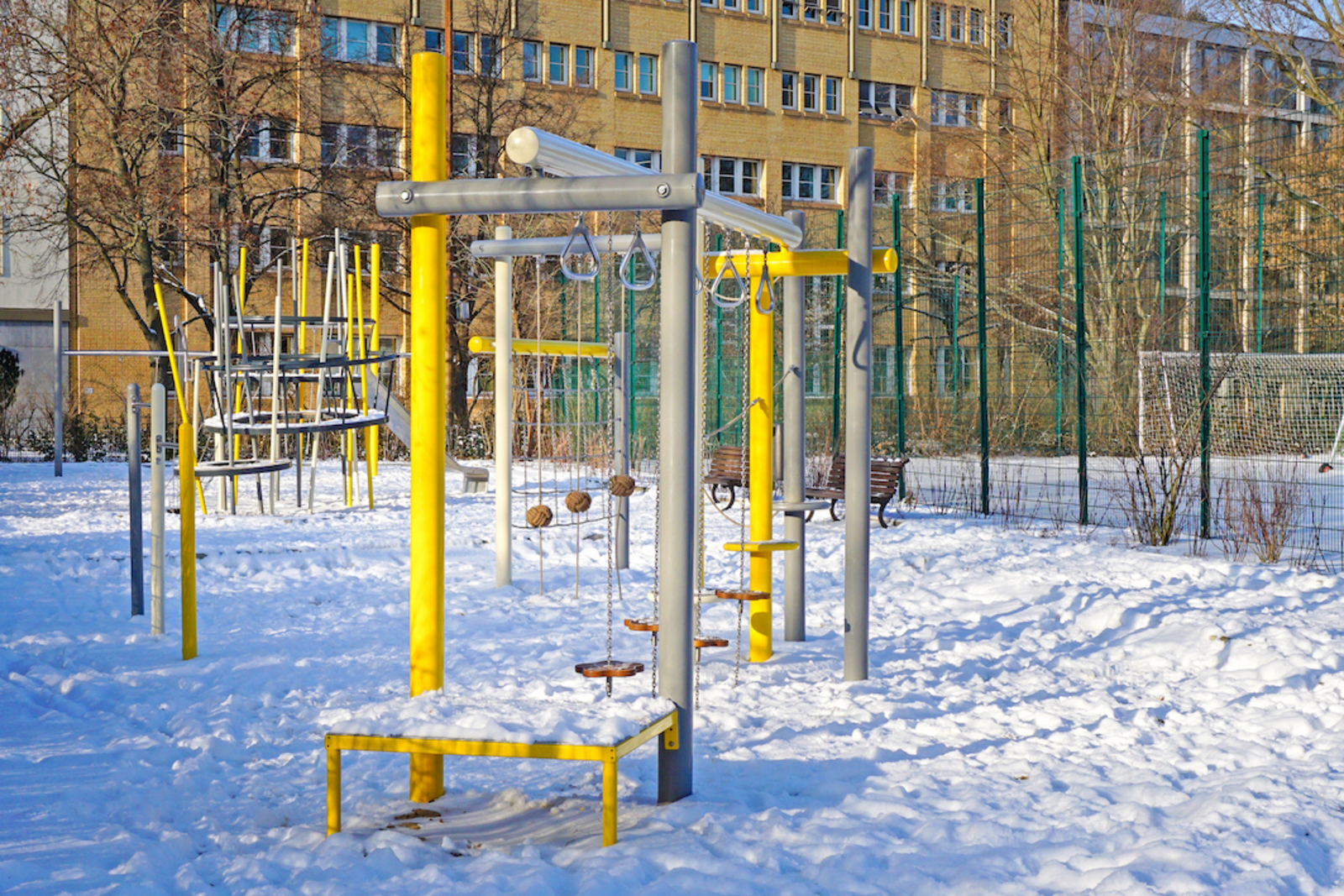 "Nicht den Boden berühren!" - die Kletter- und Hangelanlage mit unterschiedlichen Schwierigkeitsgraden verleitet im Sommer wie Winter zum Bespielen.
