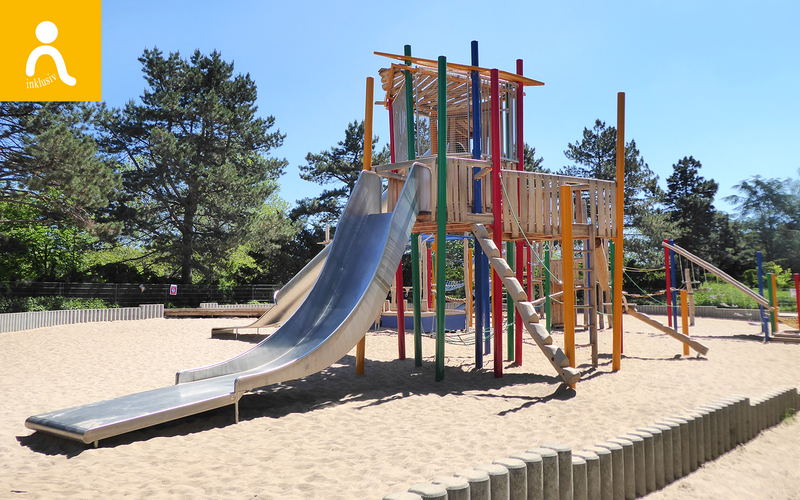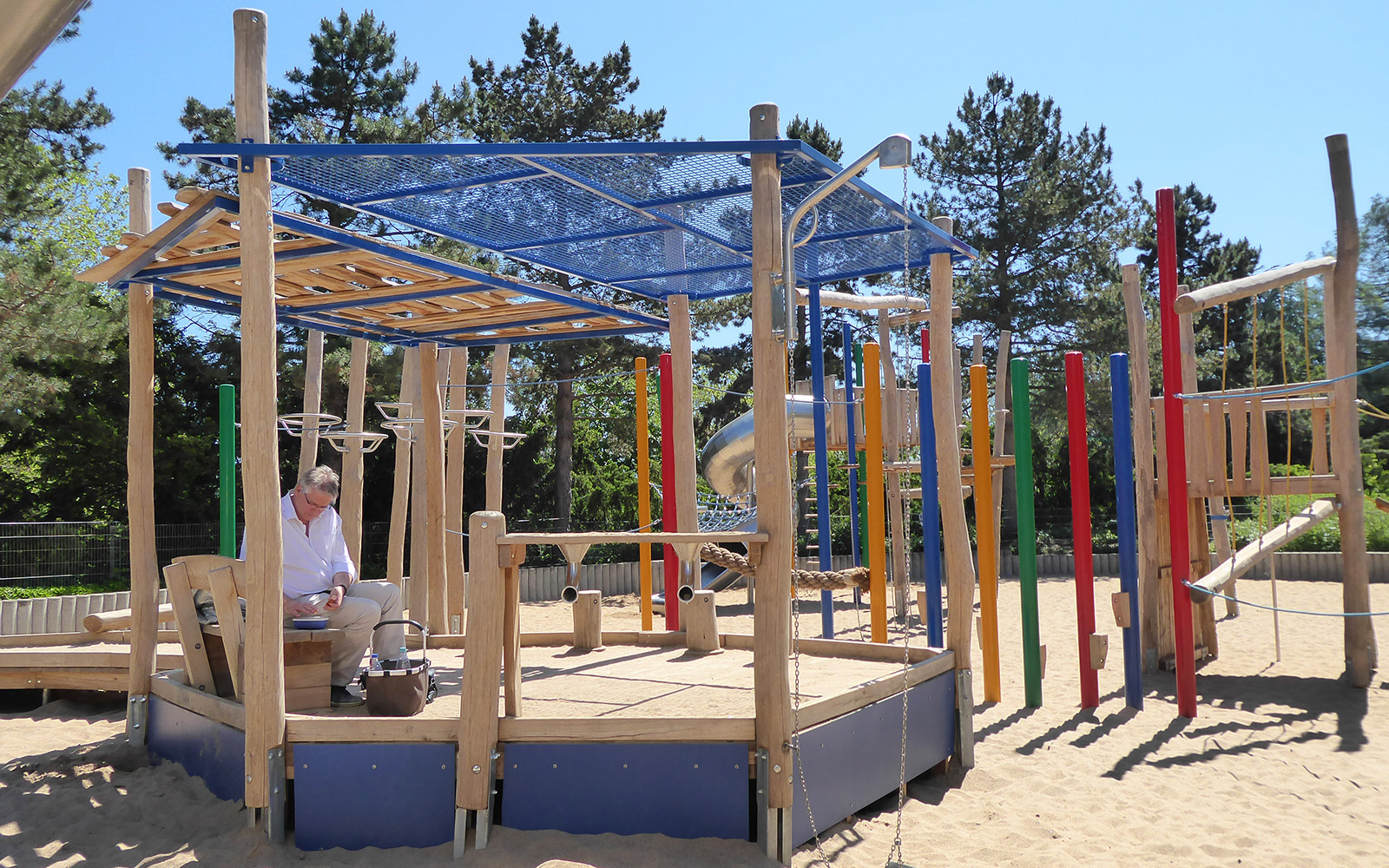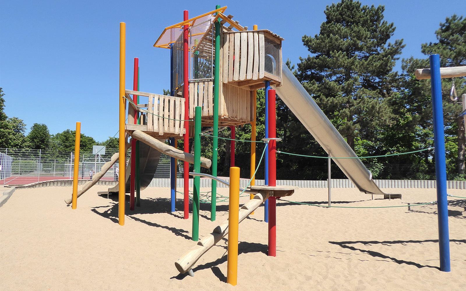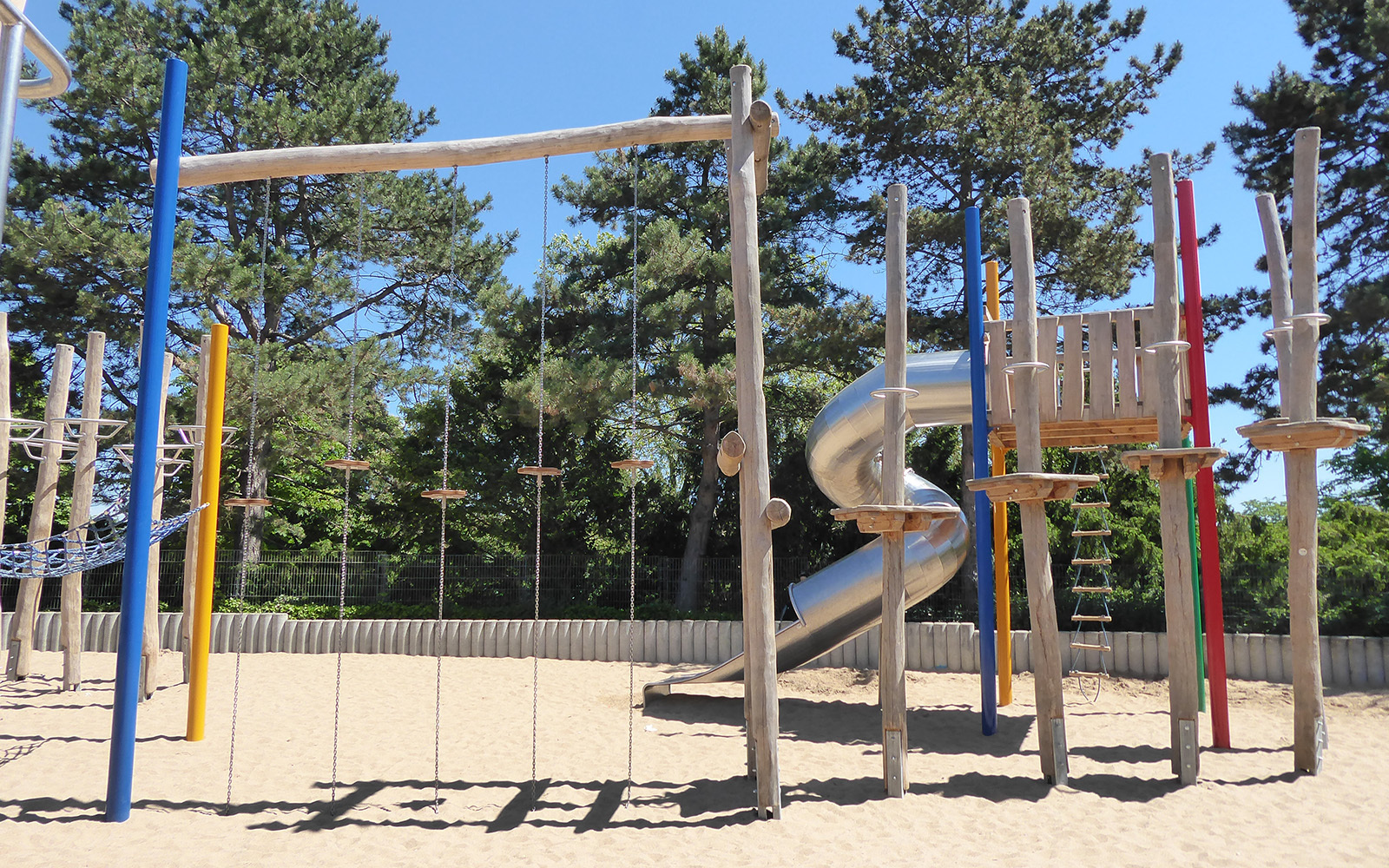 Hier ist wirklich für jedermann was dabei! Der große Spielplatz verfügt über eine hohe Anzahl von Kletter- und Balanciermöglichkeiten, Sandspielelementen, Plätze zum Ausruhen und Verweilen sowie verschiedene Rutschen. Die Themen Inklusion und Barrierefreiheit spielen ebenfalls eine große Rolle und schaffen so einen Raum zum gemeinsamen Spielen. Bunte Farben, die gute Laune machen, und eine Materialkombination aus Robinienholz und Stahl zeichnen diesen Spielplatz aus.