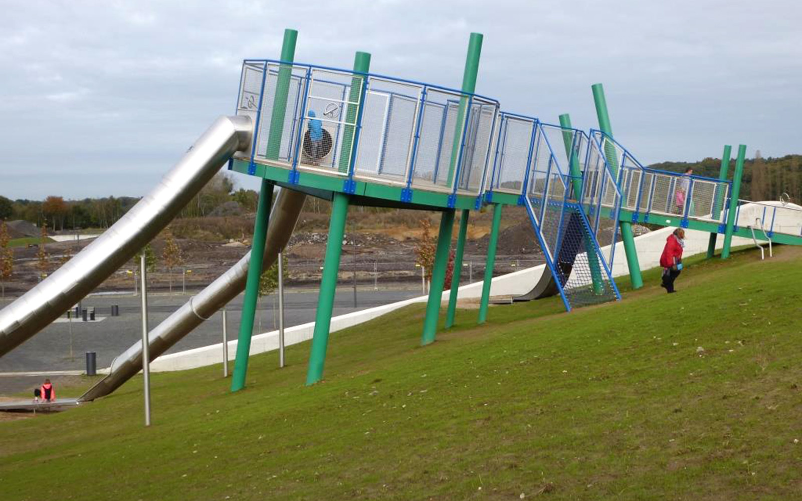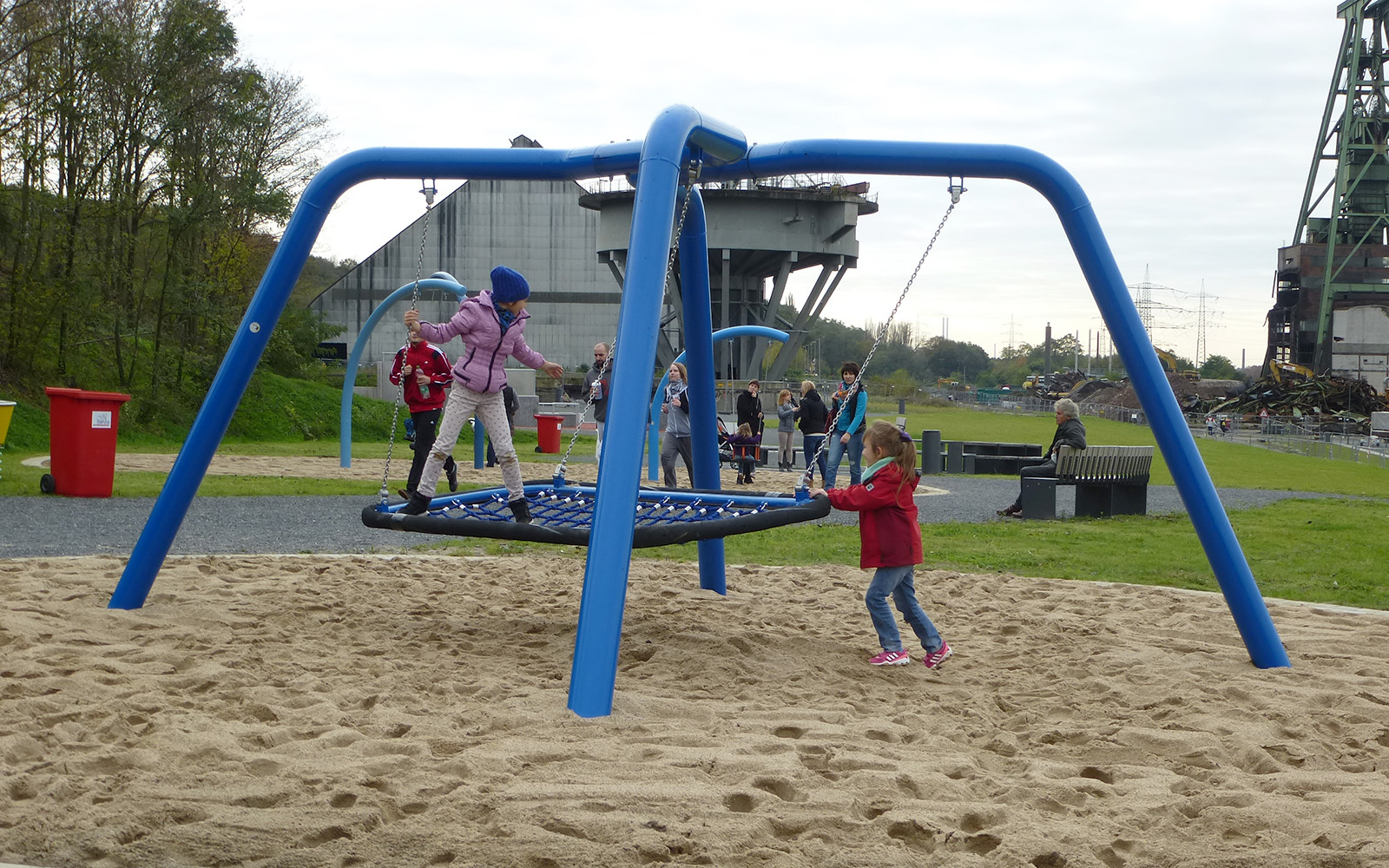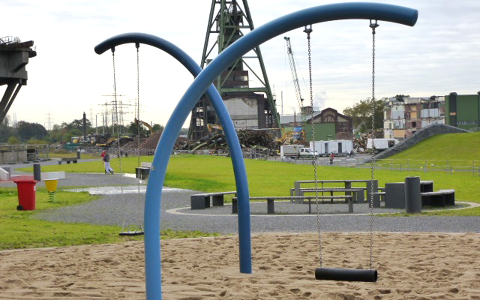 Ganz schön futuristisch ist die Spielanlage an der Zeche Lohberg in Dinslaken. Im Fokus steht der Skywalk auf dem Groß und Klein – wie der Name bereits verrät – fast in den Himmel laufen können. Dabei ändert sich durch den schrägen Verlauf des Skywalks stets der Blickwinkel zum Horizont.