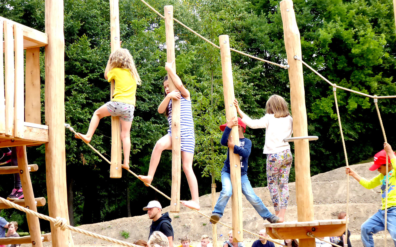 Naturnahe Optik, viele Robinienstämme, die kreuz und quer liegen und an das alte „Holzbenden“ erinnern: Dies waren grob die Vorgaben nach einer Kinderbefragung und den Vorstellungen der Landschaftsarchitekten. Entstanden ist eine große Kletterlandschaft mit unterschiedlichen Schwierigkeitsgraden, die auf einen Turm hinaufführt. Hier wartet das Highlight einer langen Röhrenrutsche sowie einer Freifallrutsche. Wer genug geklettert hat, auf den warten Wippe und Schaukel: Besondereres Highlight hier der Kinderland-Schaukelsitz Groß und Klein®. Hängematten und ein barrierefreier Kleinkindbereich runden das spannende Spielangebot im Park Holzbenden ab.