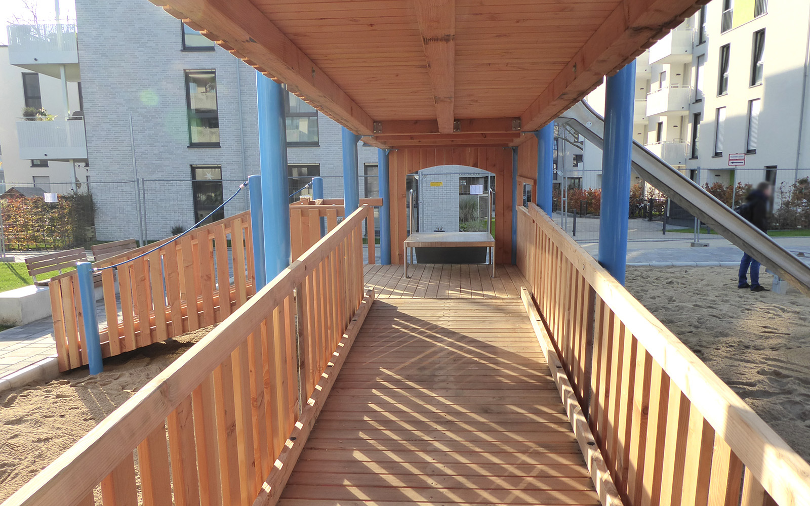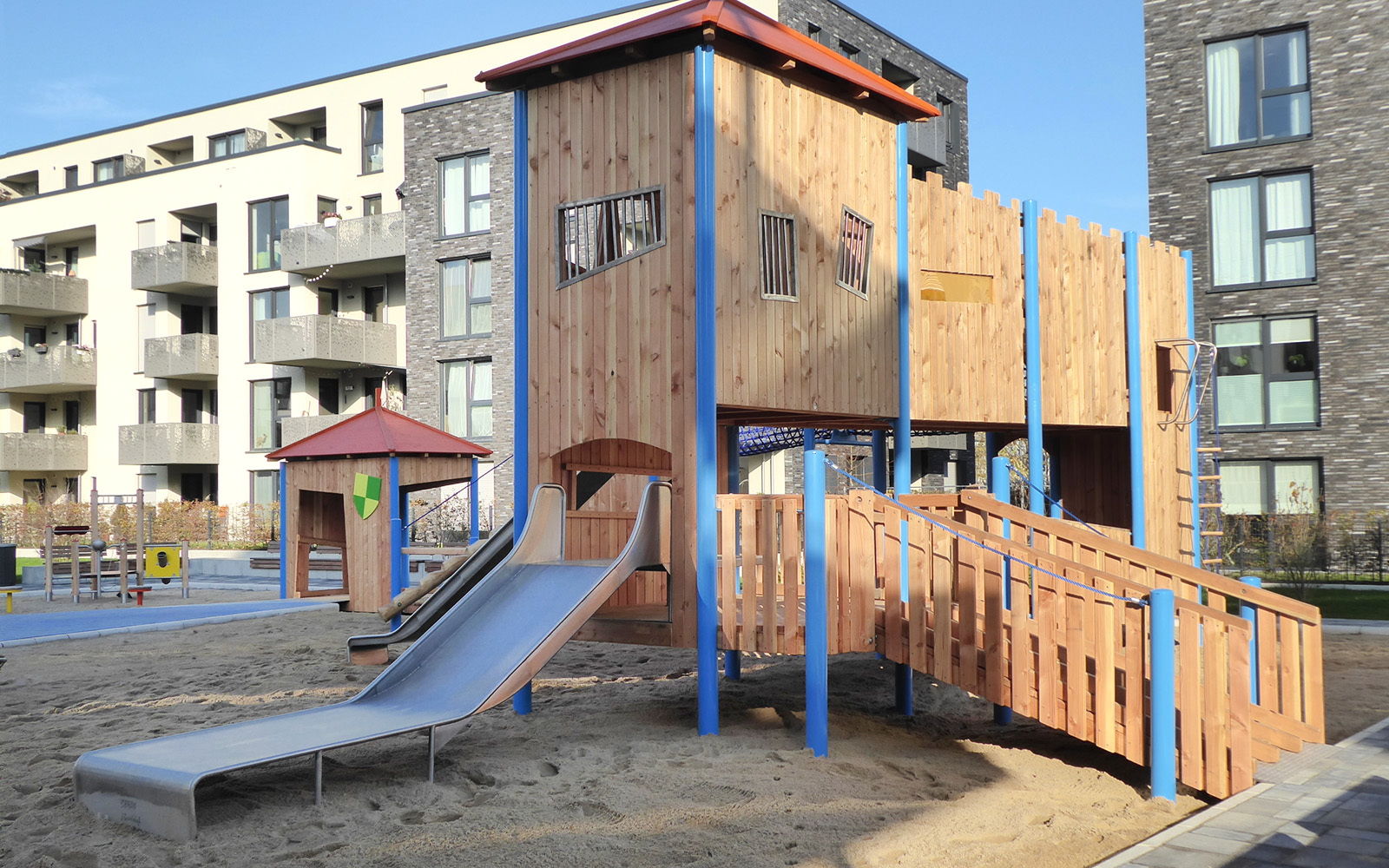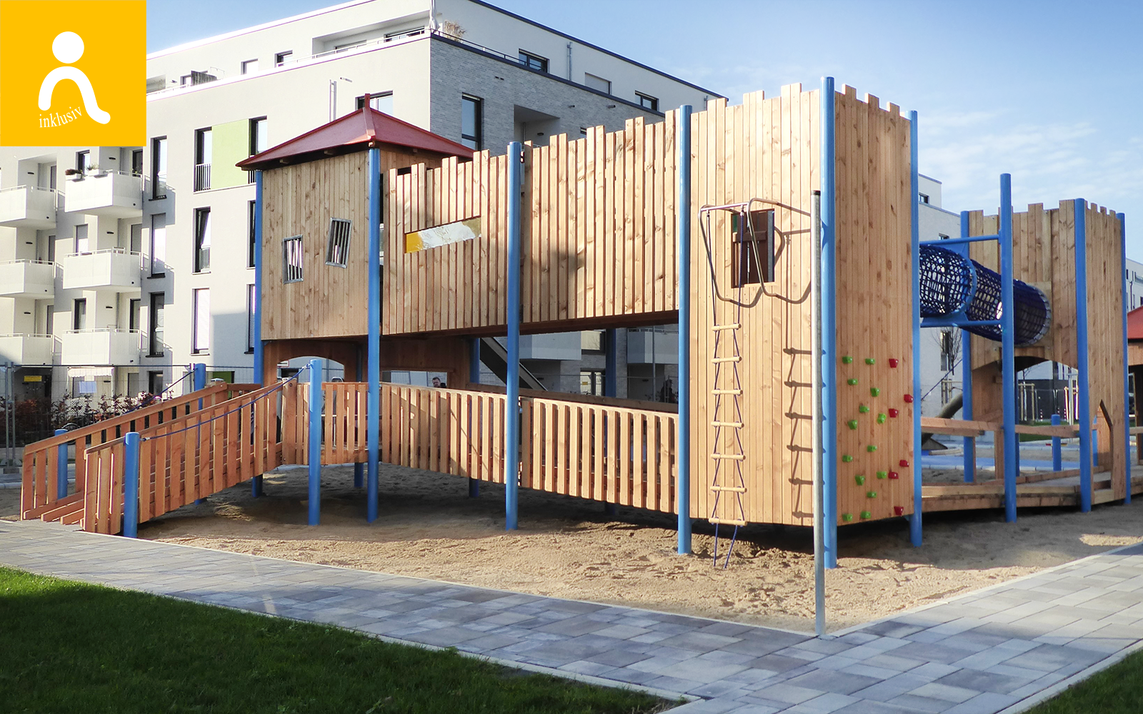 In Düsseldorf kann ab sofort unsere neue Ritterburg erobert werden. Die barrierefreie Anlage kann im unteren Bereich komplett mit dem Rollstuhl befahren werden. Auf dieser Ebene ist ebenfalls eine Rutsche mit Podest und barrierefreiem Ein- und Ausstieg angebracht. Die verschiedenen Türme können mithilfe eines Netztunnels auf der zweiten Ebene erreicht werden. Auf dieser Ebene befindet sich ebenfalls eine große Rutsche. Von außen sind Klettergriffe angebracht, die ein Erobern der Burg von "fremden" Rittern ermöglichen.
