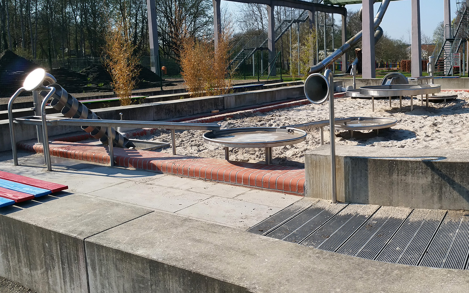 Die unterschiedlich hohen Wasserbecken, Wasserrinnen und Matschtische bieten allen Besuchern die Möglichkeit zum gemeinsamen Matschen, Spielen und Entdecken.