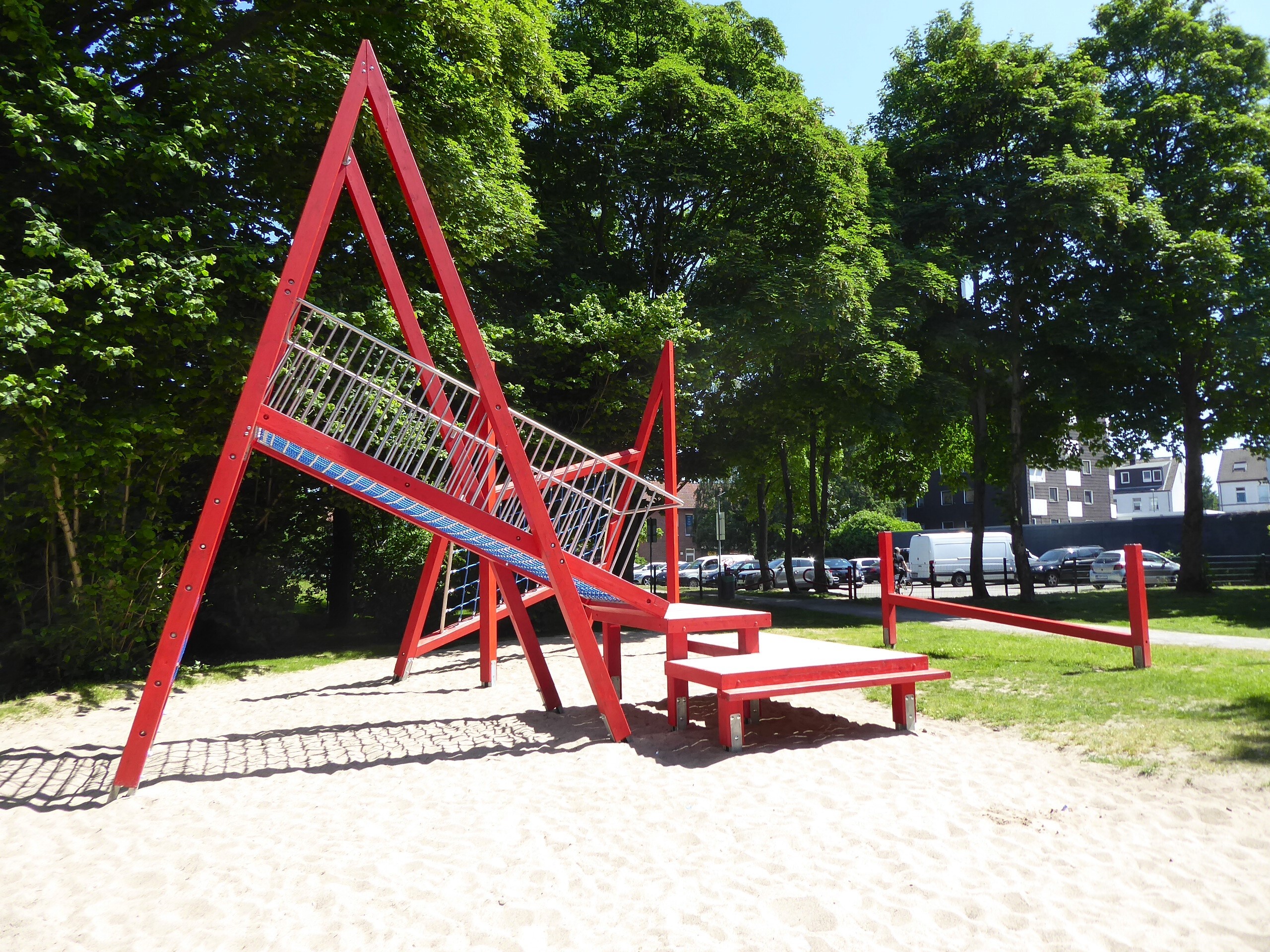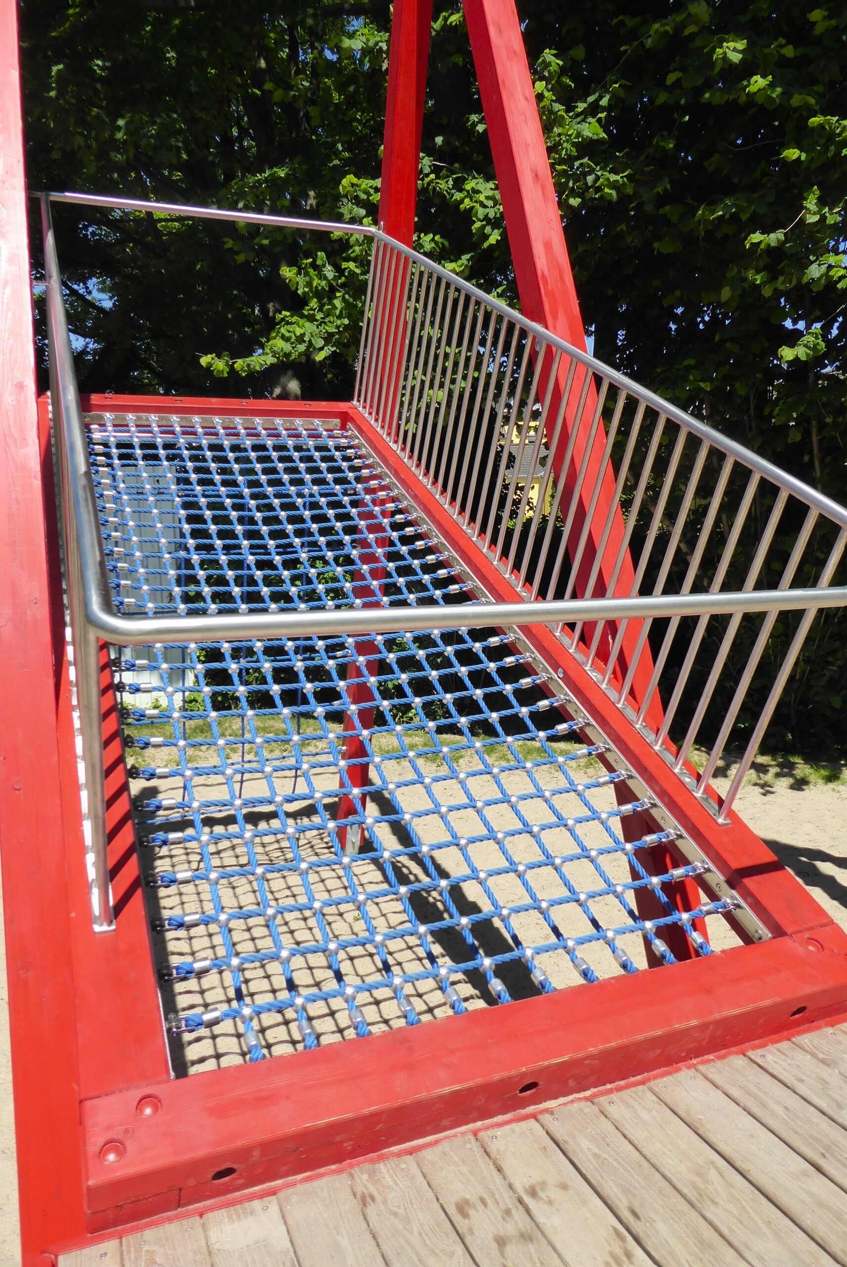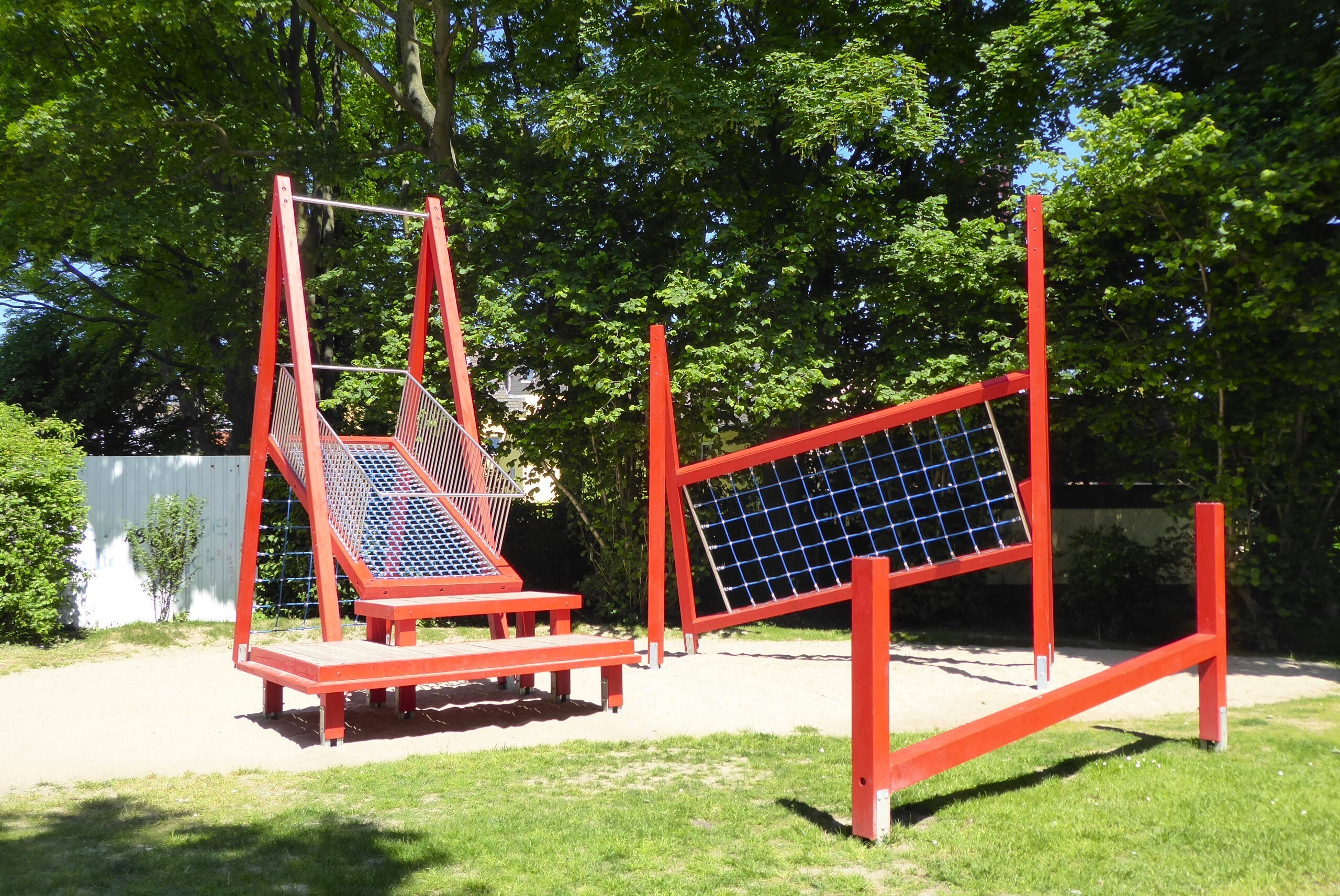 Im Zuge der Aufwertung wurde der Spielplatzabschnitt für die älteren Kinder und Jugendlichen von uns mit einem einzigartigen Sitz- und Kletterobjekt ausgestattet. Das Spielobjekt „Schief mit Netzen“ (GAT-040100-XT-0-000) bietet mit einem senkrechten Kletternetz und zwei schrägen Kletternetzen, sowie einem separaten Balancierbalken vielseitige Anreize zur Bewegung im Freien. Gleichzeitig ist es aber auch Rückzugs- und Beobachtungsort für die Jugendlichen, an dem sie sich treffen und austauschen können.