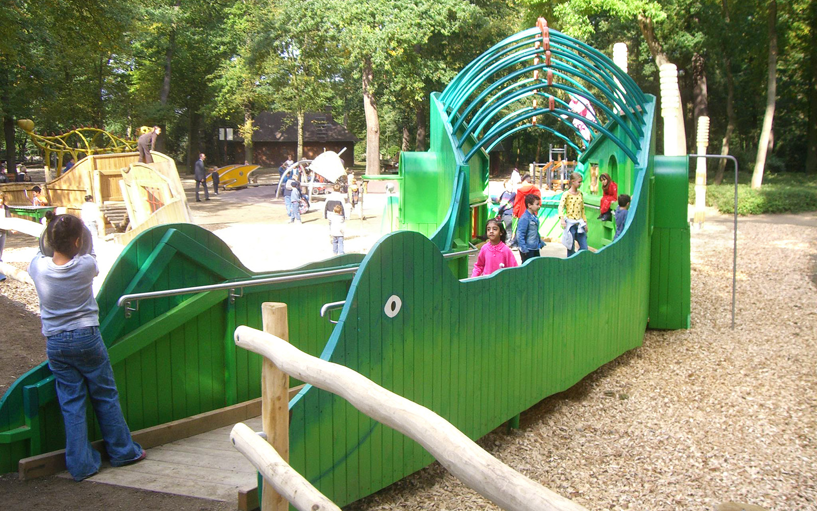 Das Thema des Spielplatzes ist: Dinosaurier. Auf diesem Spielplatz gibt es unter anderem eine Vulkanlandschaft, eine Dino-Netzschaukel und einen Spiel-Brontosaurus, hergestellt durch Kinderland Emsland Spielgeräte. Die künstlerischen Entwürfe dazu kamen von den Diplomdesignern Susanne und Matthias Schiffke.