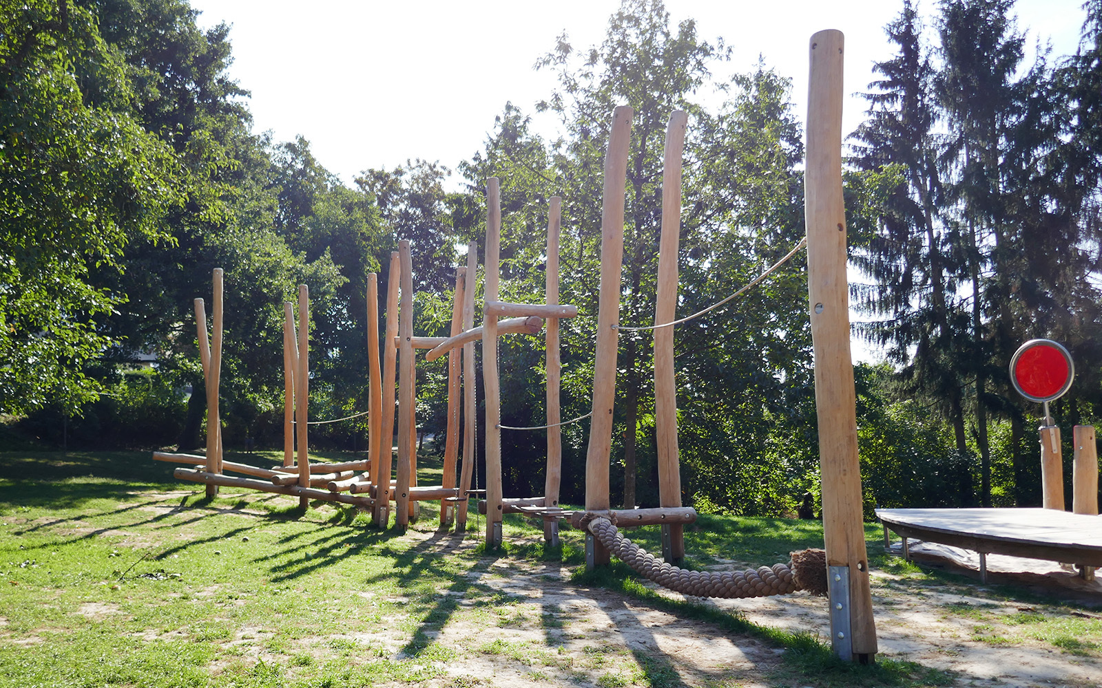 This playground is located on the Sulzbachwiese in Frankfurt, surrounded by large natural stones, made entirely of robinia wood and surrounded by greenery. Completely natural, the robinia wood playground blends into the area well, but nevertheless proves eye-catching with its light lollipops, which shine brightly on the ground when exposed to sunlight.