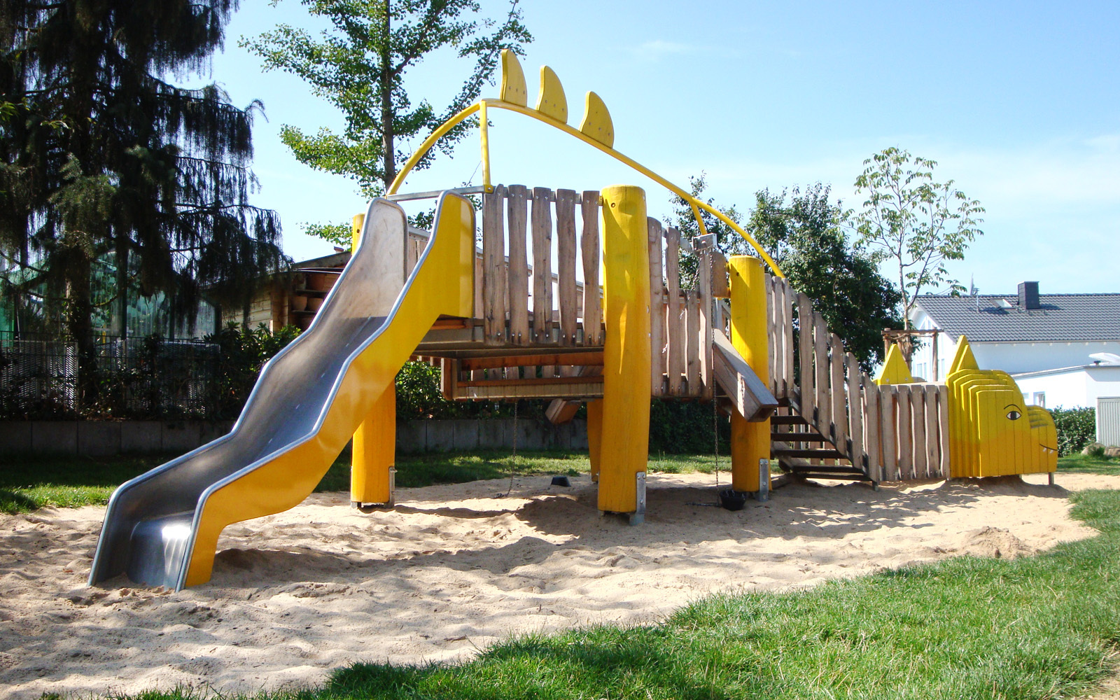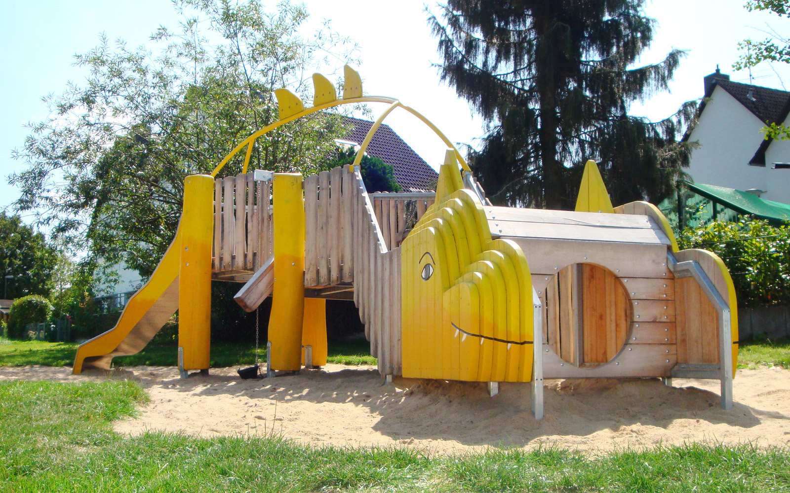 Der Spielplatz am Wettenbergring in Gießen hat einen neuen Mitbewohner. Hier hat ein kinderfreundlicher Drache sein neues Zuhause gefunden und lädt alle Kleinen zu ein paar aufregenden Stunden ein. Schwupps geht´s nämlich direkt in den großen Mund des Riesen. Von da aus gelangt man über einige Stufen in den dicken Bauch, in dem sich alle zu lustigen Sandspielen treffen, bevor es dann rasant auf dem Schwanz des Drachen abwärts geht. Und wenn es etwas ruhiger zugehen soll, schnappt man sich einfach eine Schaukel.