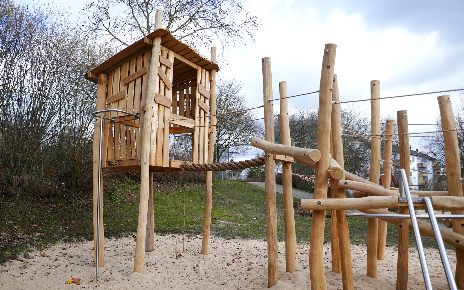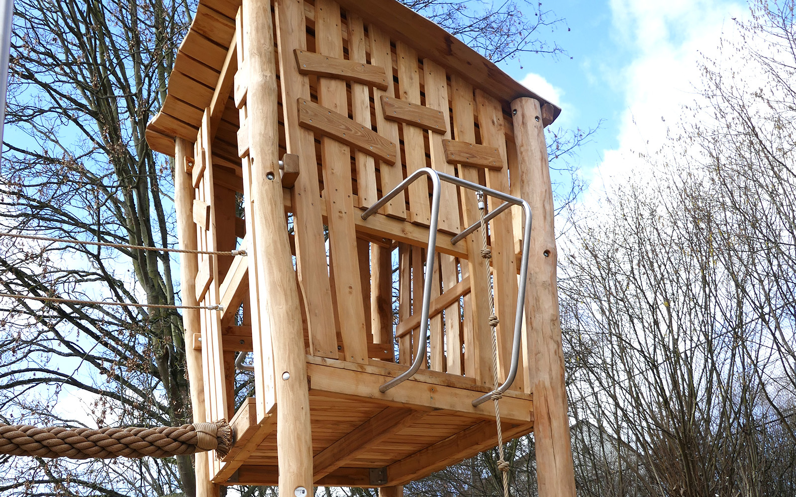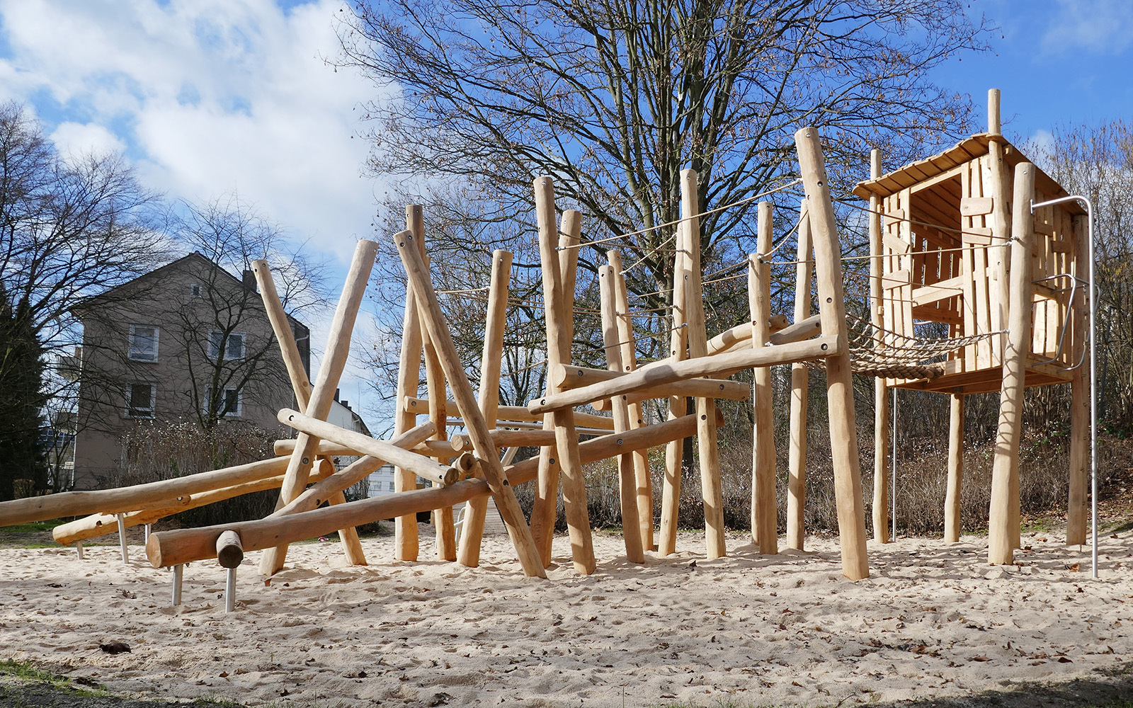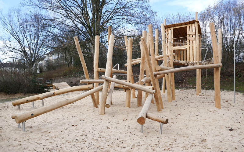 Sobald man das Balanciermikado erklommen hat, gelangt man über die Tampenbrücke zum Baumhaus, aus dem man den gesamten Spielplatz überblicken kann. Über die Rutschstange geht's anschließend wieder herunter. Nach dem aufregenden Klettererlebnis lässt es sich im Liege- und Verweilnetz herrlich entspannen.
