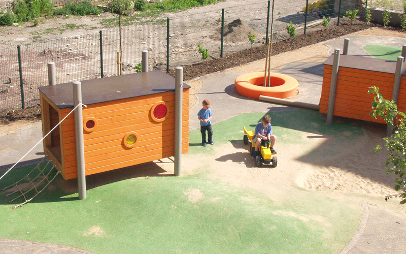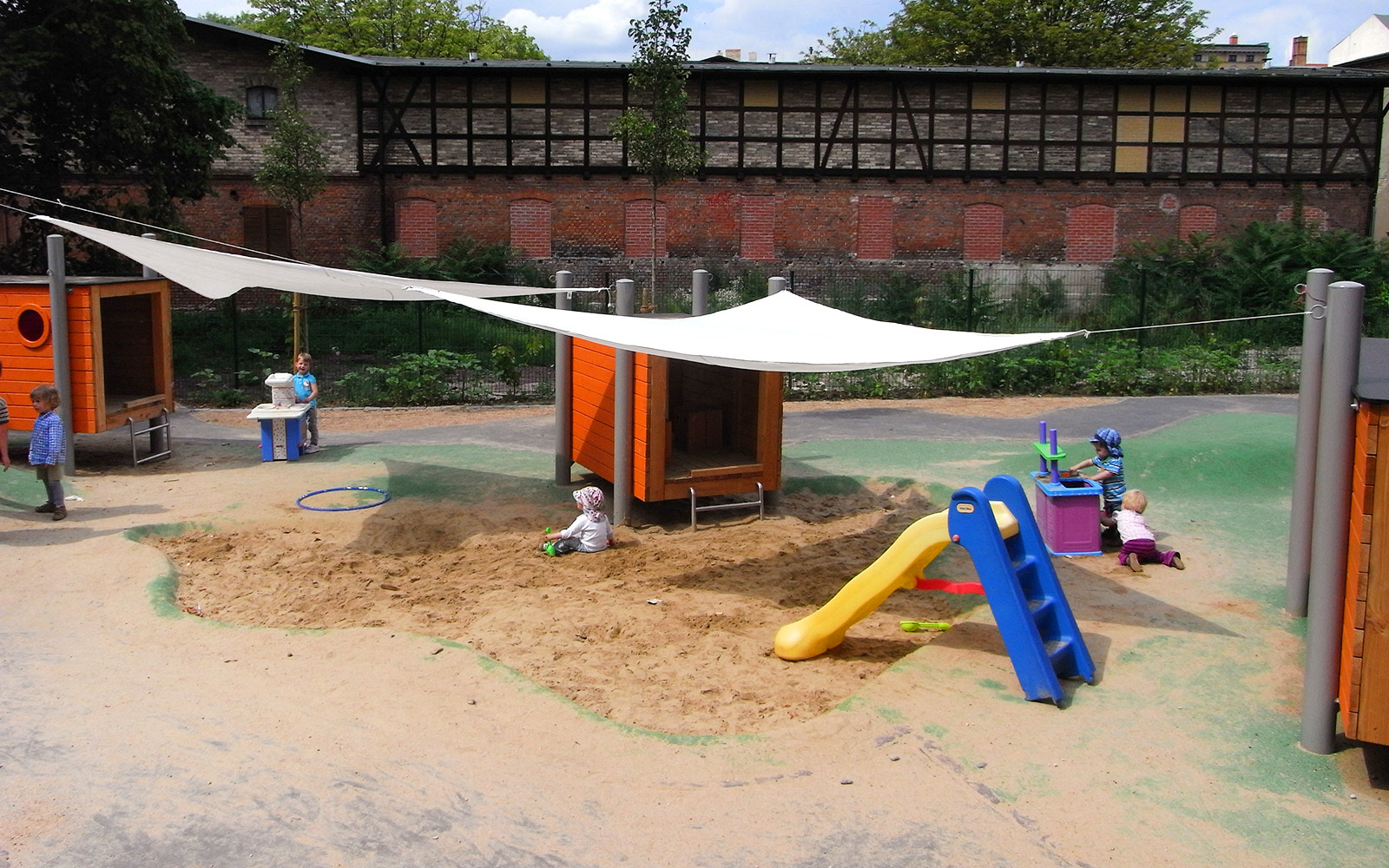 Gut behütet! Wer hat in seiner Kindheit nicht gerne Buden gebaut und in Höhlen gespielt. Es ist ein Grundbedürfnis beschützt zu sein. Diesem Wunsch werden diese Spielhäuser in der KITA gerecht. Zum Reinklettern, Wohlfühlen, Durchschauen und Rausgucken. Hier kann man getrost Kind sein und entdecken, seinen Schatz behüten und die Köpfe zusammenstecken.