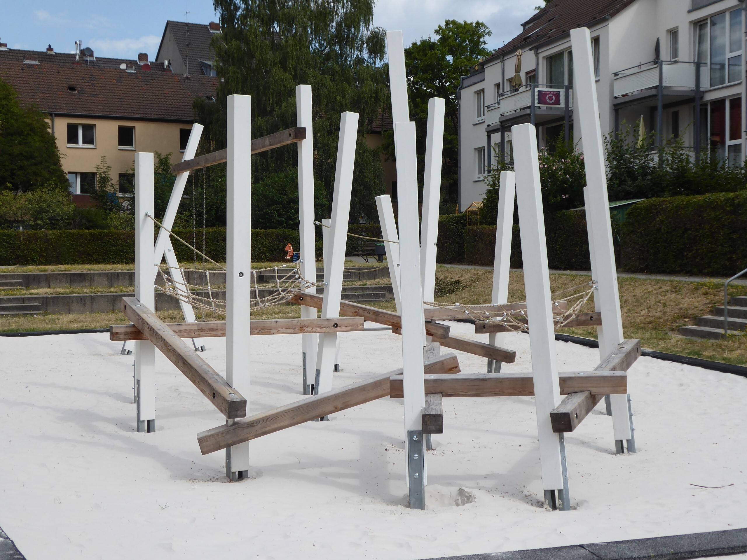 Zum Spielangebot zählt unter anderem eine Variante der Kletterlandschaft Kantholz, die in ihrer Ausführung an die Wünsche des Auftraggebers angepasst wurde. Anstelle von Eichenholz wurden hier Leimbinder aus Lärche verwendet. Das Lärchenholz - mit seinem ausgeprägten Farbunterschied zwischen Kern- und Splintholz - sorgt in Verbindung mit den weiß lackierten Standpfosten der Spielanlage für eine kontrastreiche und moderne Optik.