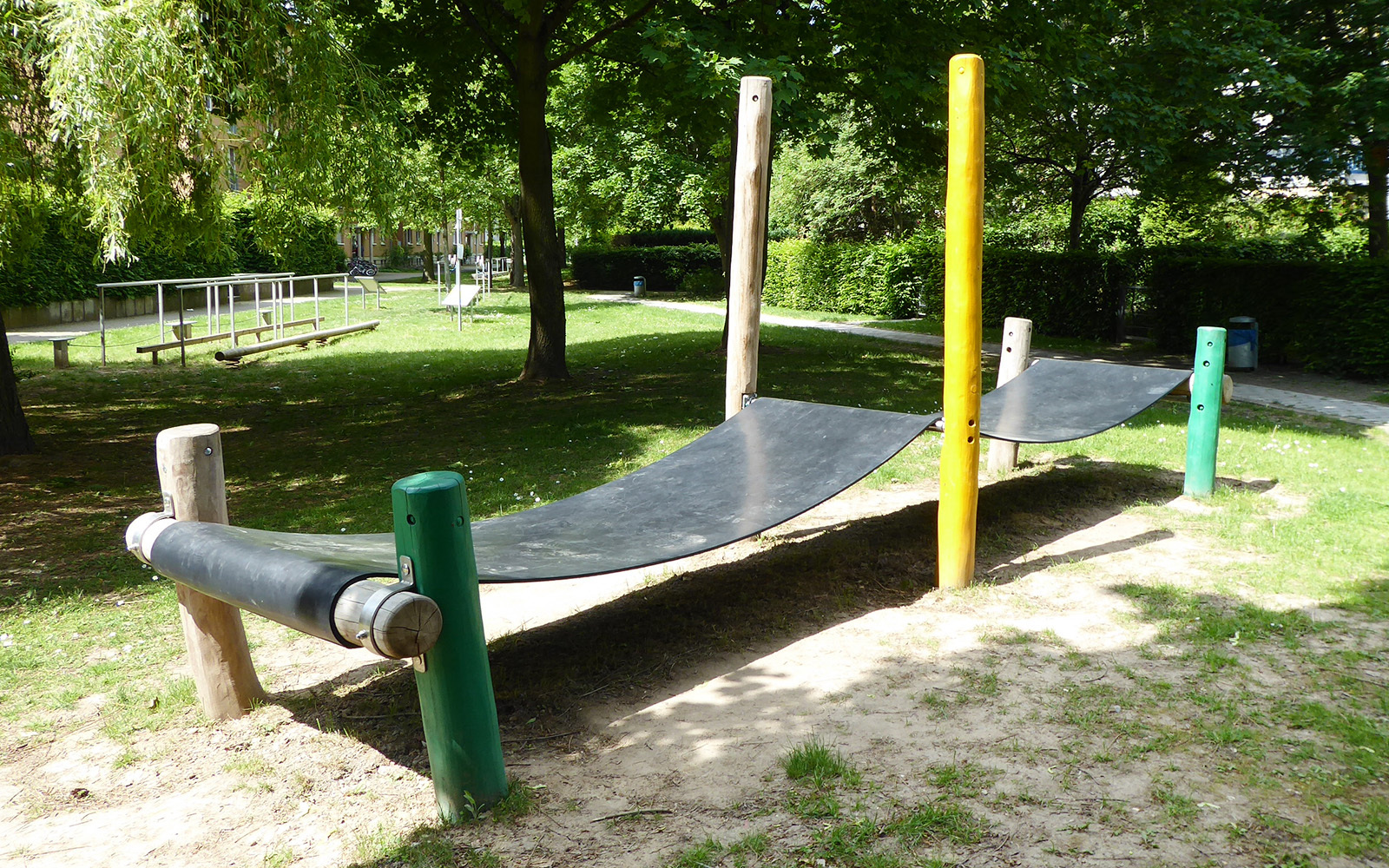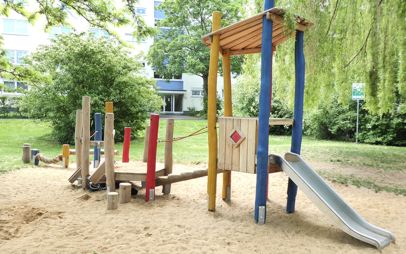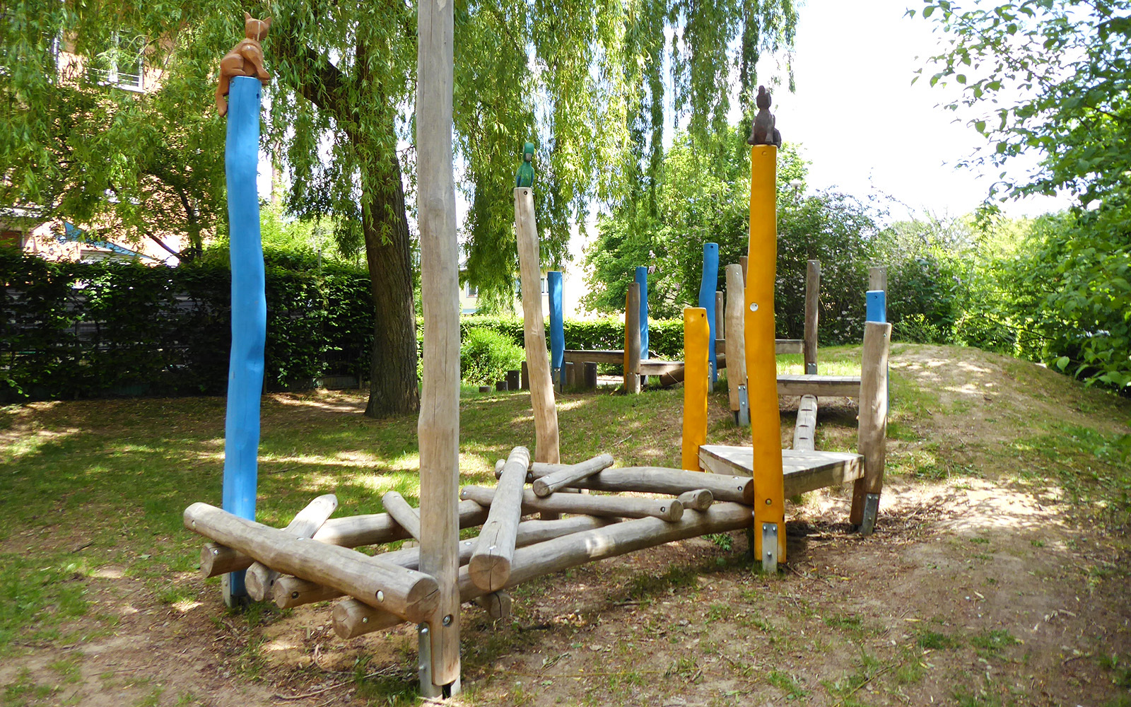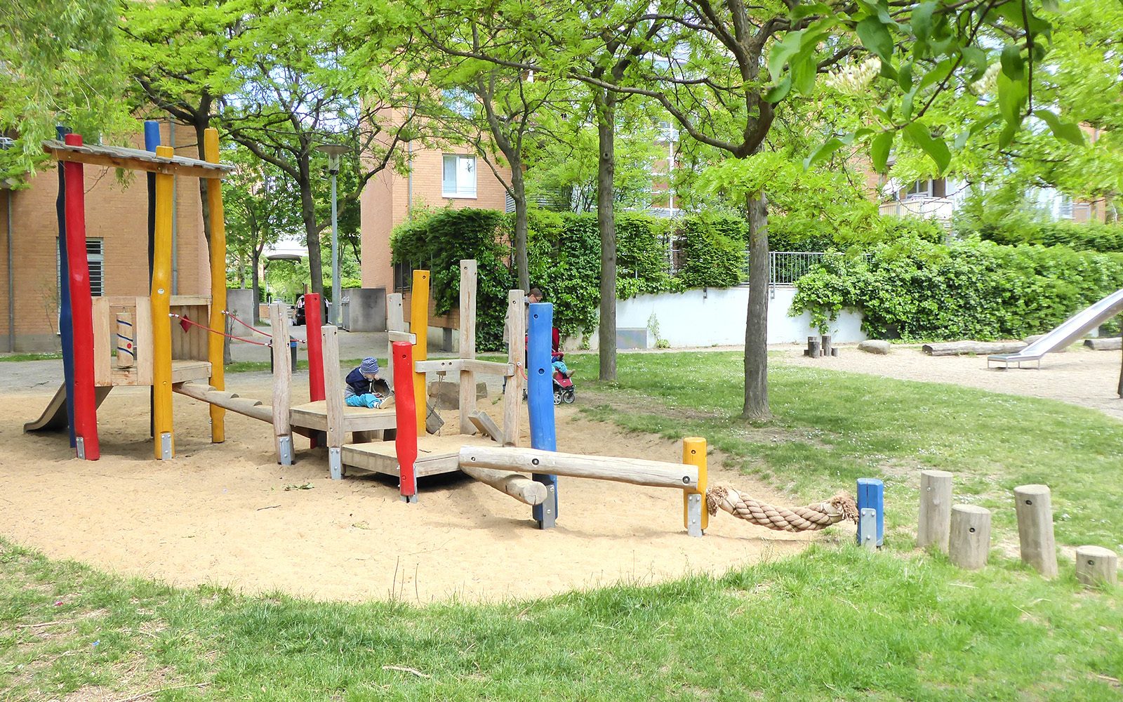 Zahlreiche Spielelemente wie z. B. der kleine Spielturm mit Balancieranlage und der sechs Meter lange Gurtsteg laden die kleinen Besucher des Spielplatzes zum sofortigen Klettern, Rutschen, Spielen und Entdecken ein. Über die Balancierwimmelei gelangt man einen kleinen Hügel hinauf, den man auf der anderen Seite über kleine Balanicerpoller wieder hinuntergelangt. Ein Sandspielpodest und das Wipptierchen sorgen für weitere abwechslungsreiche Spielmöglichkeiten.