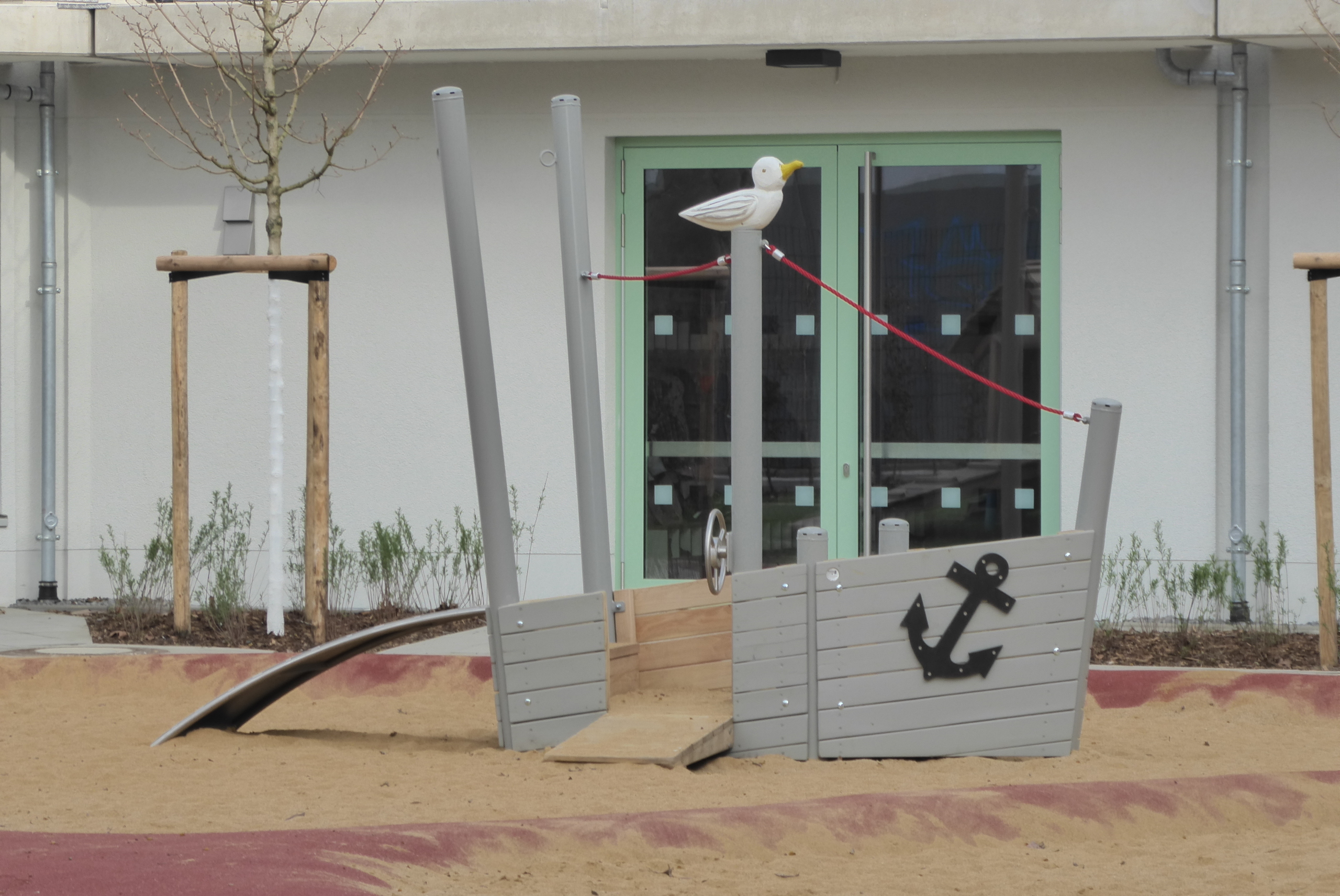 Der Kletterturm Hallbach, das kleine Piratenschiff und das Spielhäuschen bieten gerade den Jüngeren viele Anreize. Sie liegen im Kitabereich.
