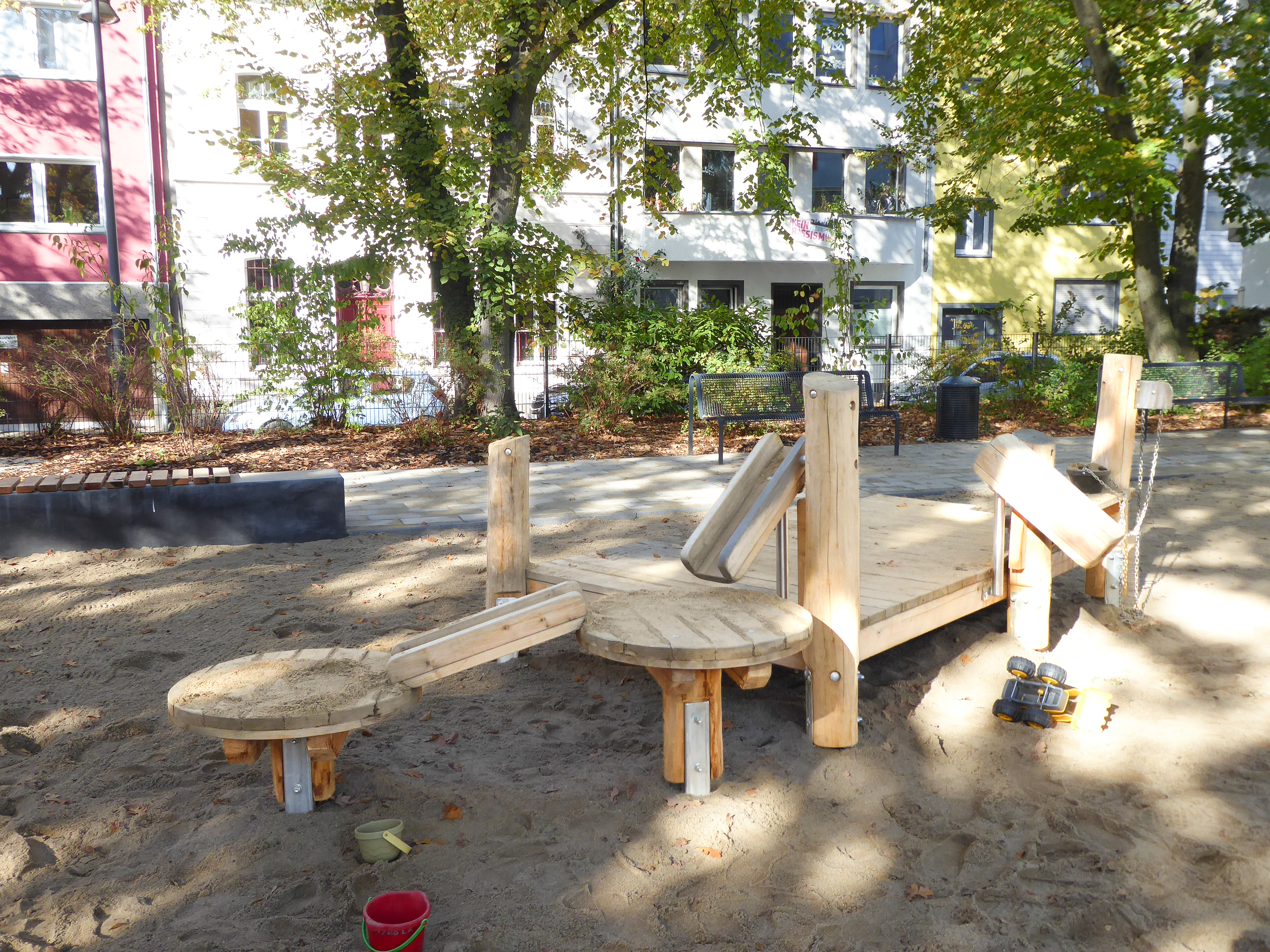 Unter den großen, schattenspendenden Bäumen ist außerdem eine Möglichkeit des Schaukelns und Matschens geschaffen worden.