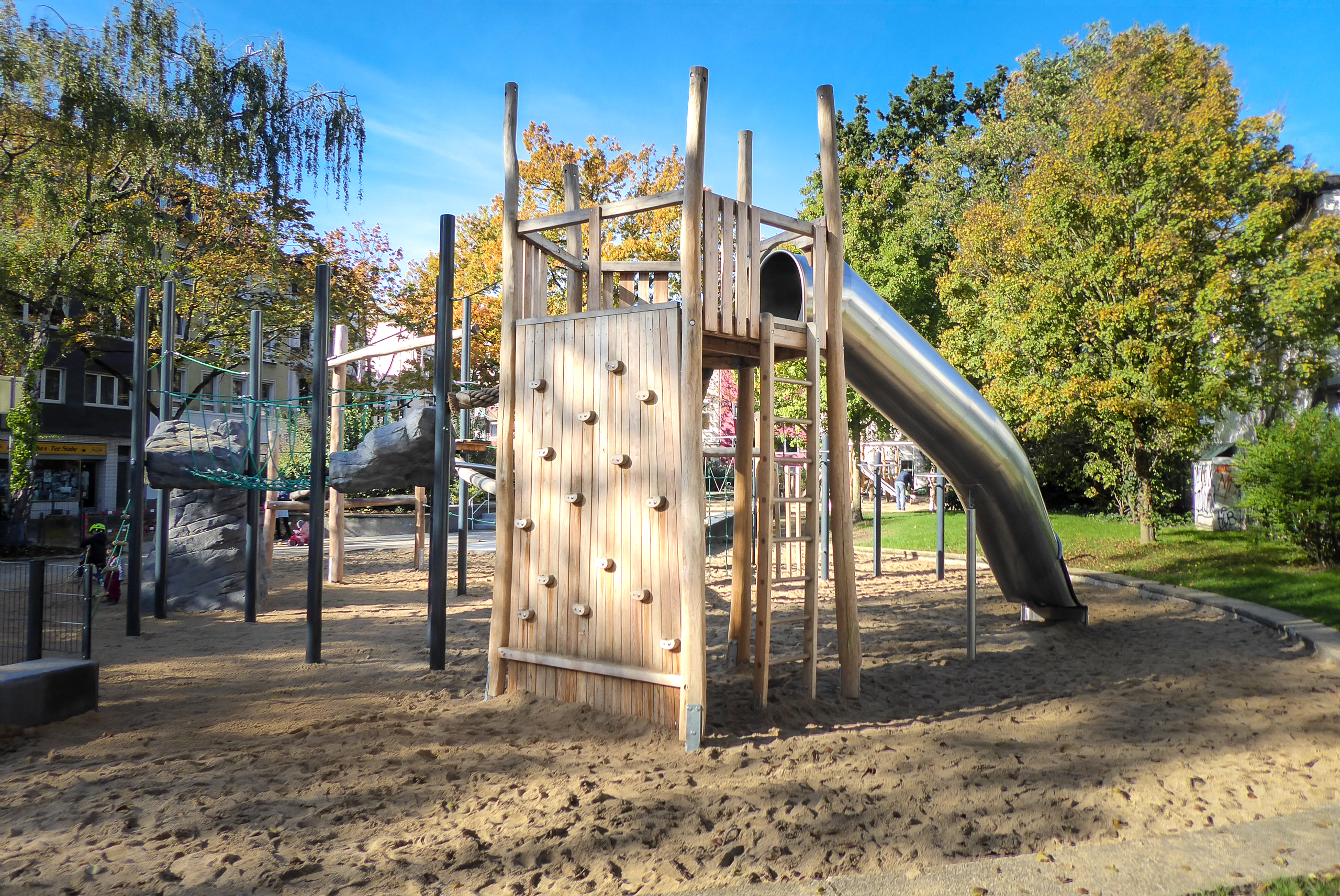 Das Büro Lang Landschaftsarchitektur hat eine herausfordernde und abwechslungsreiche Anlage geplant, auf der nach Herzenslust geklettert, gehangelt und balanciert werden kann. Am Ende des Kletterweges können die Kinder über die große Rutsche wieder runterrutschen und von vorne beginnen.