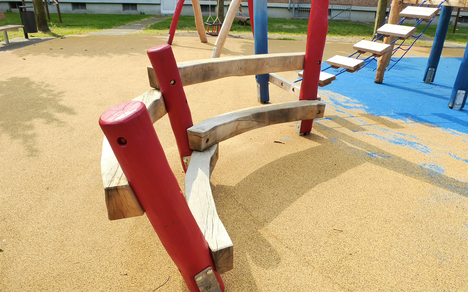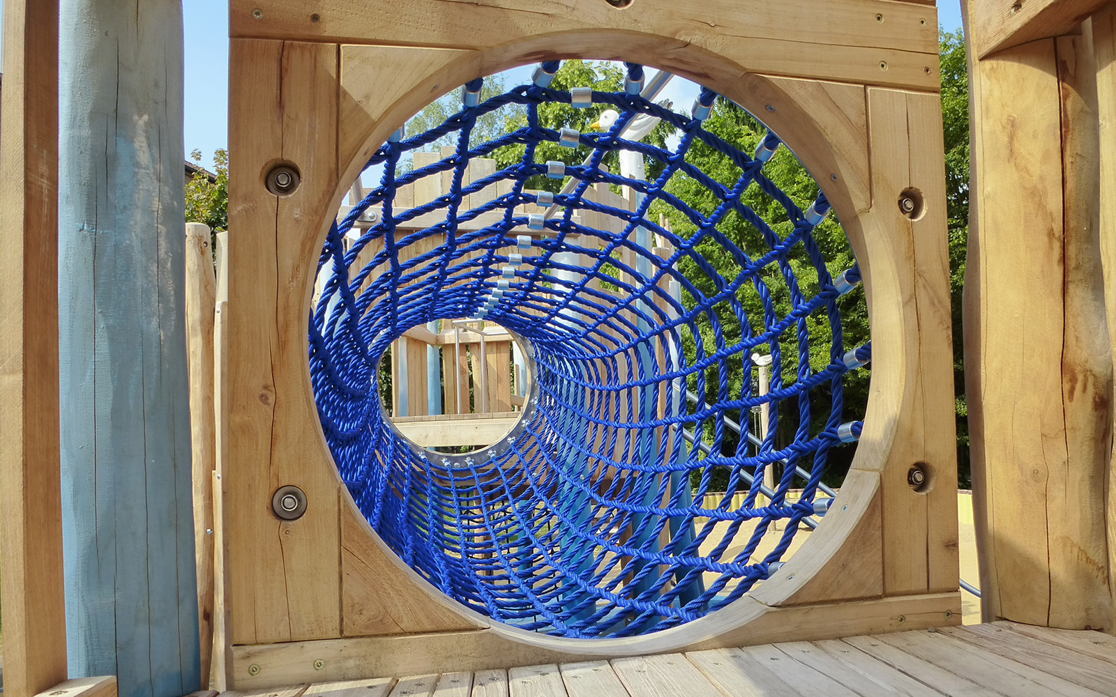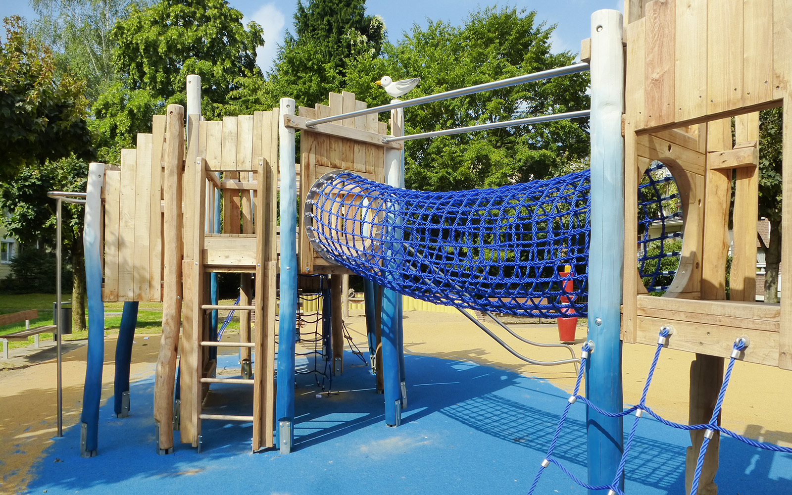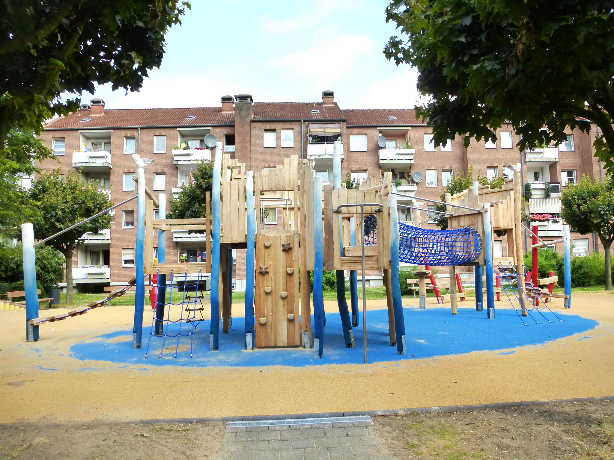 In einem Kölner Wohngebiet ist eine neue Spielanlage zum Klettern und Toben fertiggestellt worden. Die Anlage wurde direkt über einer Tiefgarage montiert. Der Platz ist wie eine abenteuerliche Wasserburg gestaltet und bietet auf mehreren Holztürmen vielfältige Spielmöglichkeiten. Die Vierecktürme sind ausgestattet mit Strickleiter, Sprossenleiter und einer Stangenleiter. Eingebunden sind auch eine Kletterwand mit Klettergriffen und Anbaupodeste mit einer Rutschstange.