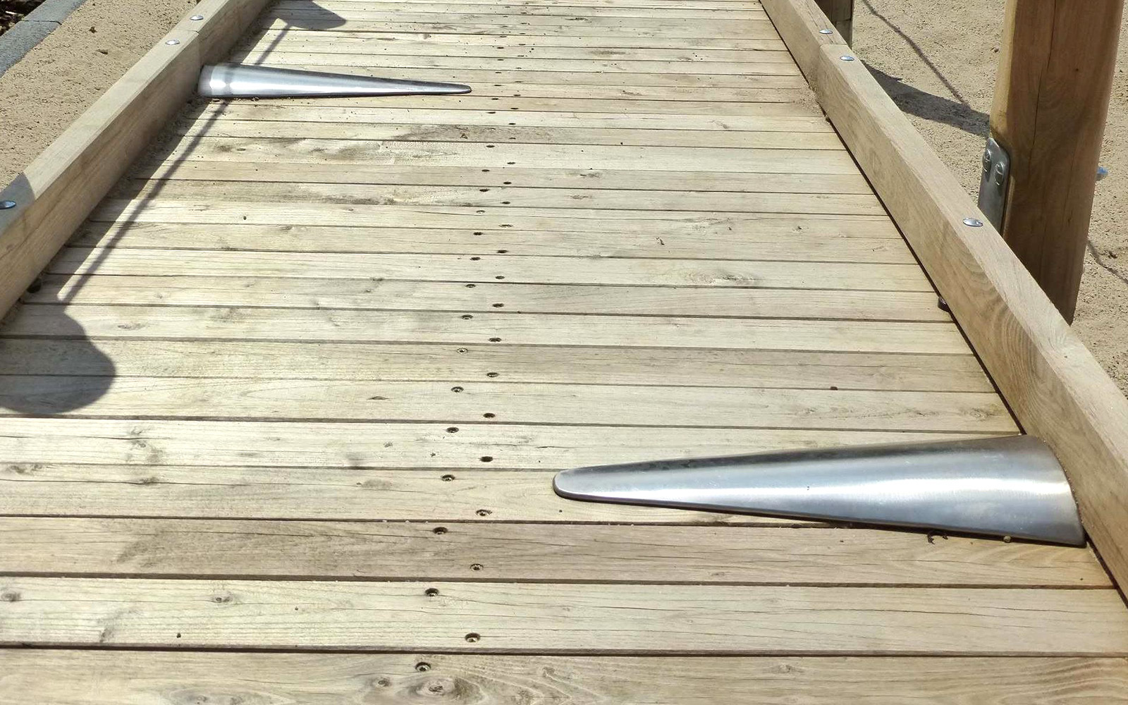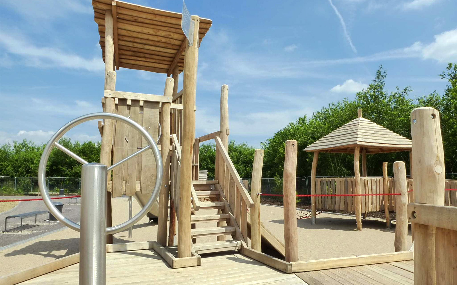 Der Kindheitstraum schlechthin: Einmal auf einem eigenen Holzschiff fahren, toben und spielen! Dieser Traum geht jetzt für Kinder mit und ohne Behinderung auf dem Spielplatz „Sürther Feld" in Köln in Erfüllung. Eines neues integratives Spielschiff schmückt den Platz, es kann entweder per Seilrampe, Kletterwand oder über den angeschlossenen Hafensteg bestiegen werden. Auf dem Schiff kann man sich als echter Kapitän fühlen, entweder beim Steuern des Stahlruders oder oben auf dem Ausguck-Turm. Über eine Rutsche kann das Schiff bei Seenot schnellstens verlassen werden. Viele weitere Entdeckungen lassen sich jedoch auf dem großzügigen Holz-Hafenpier erspähen, über ein System von Stegen kann man einen spannenden Rundgang machen. Ein spezieller Kai ermöglicht dabei das Beladen der Schiffe per Sandeimer und Schüttvorrichtungen. Die gesamte Anlage wurde für Kinder mit Behinderung oder Rollstuhl entwickelt und ist komplett barrierefrei. Gesäumt wird der Hafen von einer Doppelschaukel, einer Wippe und einer Seilbahn mit Rampen. Echtes Hafenflair mitten in der Stadt, dann mal „Leinen los!“.