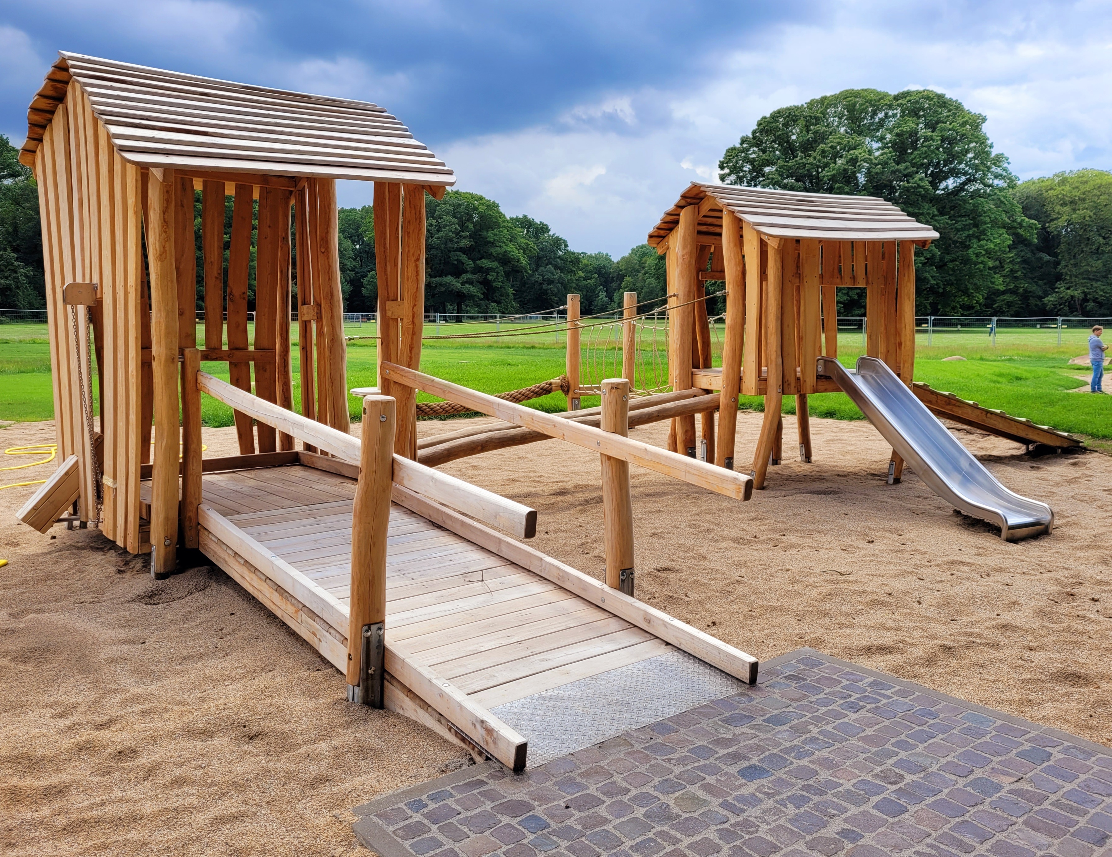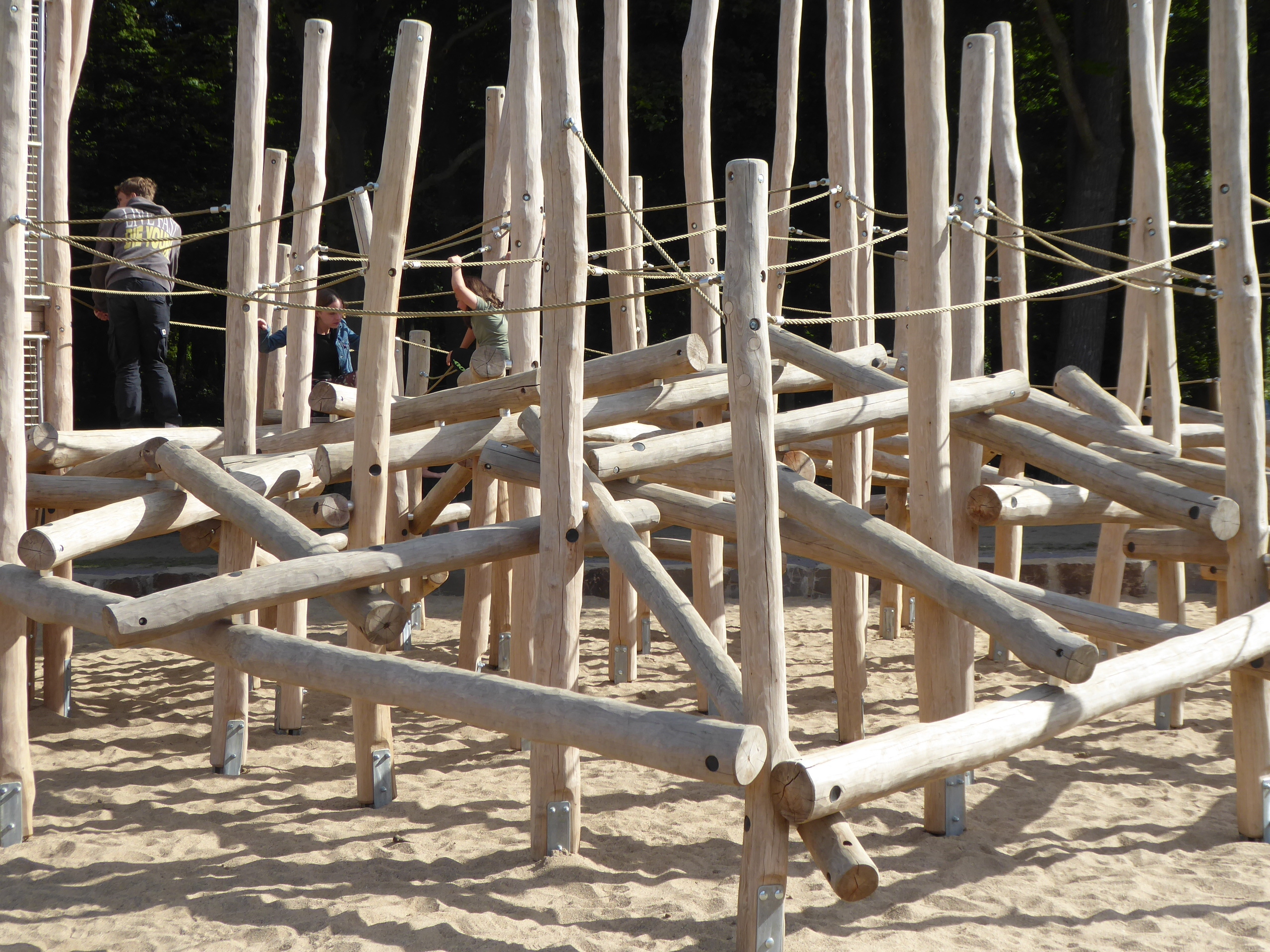 Der Stadtwald mitten in Krefeld ist ein beliebtes Ausflugsziel vieler Bürger, insbesondere von Familien. Der neu gestaltete Spielplatz nimmt das naturnahe Umfeld des alten Parks mit einem großen Balanciermikado aus Robinie mit Röhrenrutsche auf. Unter den Bäumen findet man einen Balancierparcours mit Seilen und Podesten zum Klettern, Chillen oder einfach um den Schatten zu genießen.