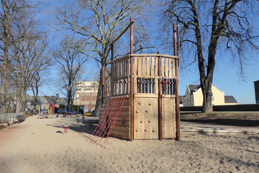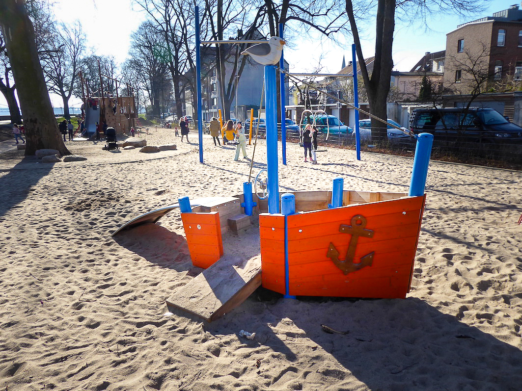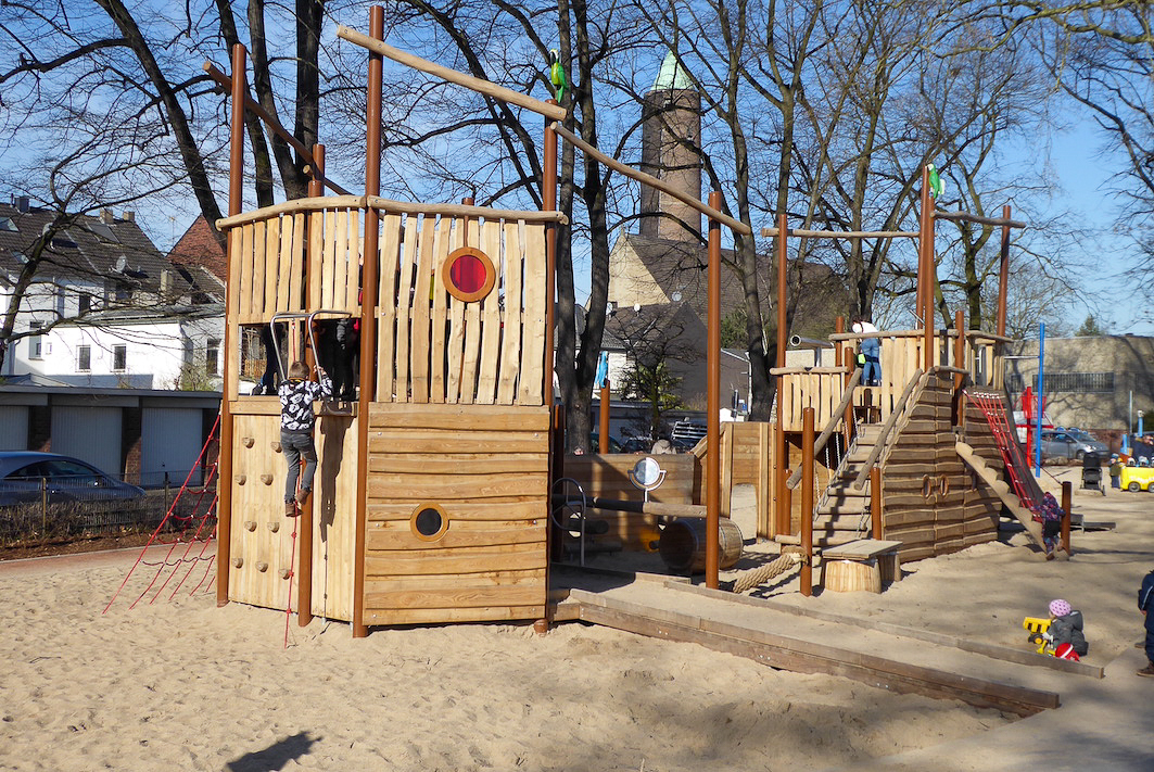 Ein großes barrierefrei zu erreichendes Schiff ist in Krefeld Uerdingen vor Anker gegangen. Das Schiff lädt zu Klettern in vielfältigster Weise ein: vom Heck bis zum Bug. Wackelbohlen, überlanges Guckrohr, eine Freifallrutsche und Papageien runden das Angebot am großen Schiff ab. Gesteuert wird es ebenerdig und via Morsespiegel kann von unten immer Spielkontakt gehalten werden. Das Rollenspiel setzt sich dann über den gesamten Spielplatz fort: Delphine, ein Mast mit Aussicht und ein weiteres kleines Schiff gehören auch noch zum Setting.