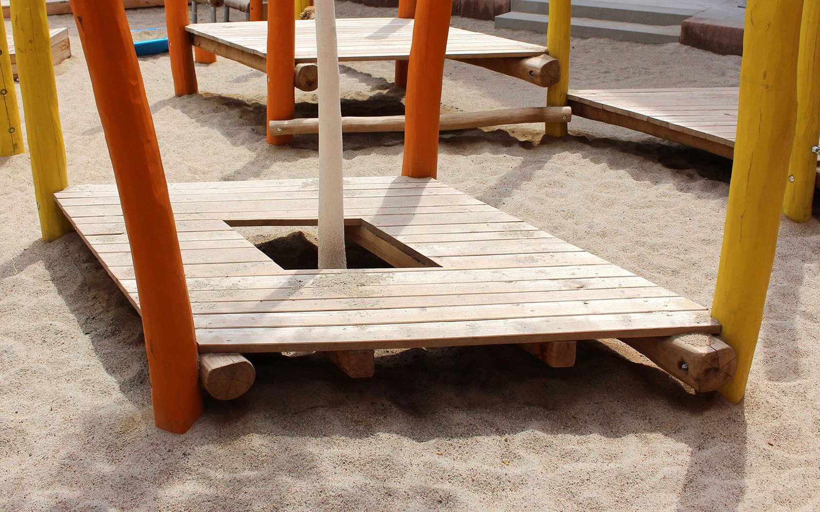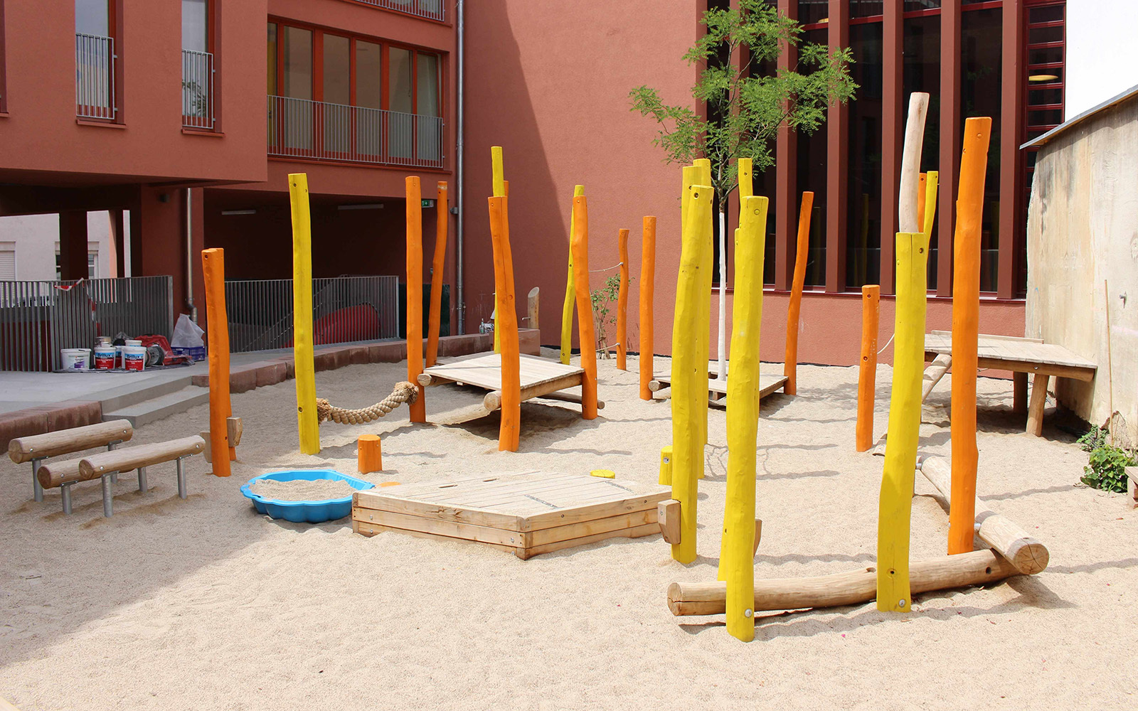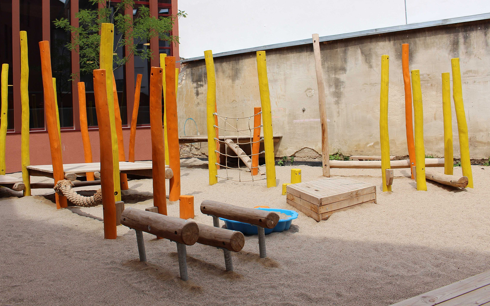 In den Seilen hängen, auf einem dicken Tau balancieren oder einfach mal ins große Netz gehen können die Kinder der Kita „Rappentor" in Lahr ab sofort auf ihrem schönen neuen Spielplatz im Innenhof. Und auch für all die, die lieber durch die Gegend flitzen, von Holzinsel zu Holzinsel springen oder im Meer aus schönem weißen Sand nach Herzenslust toben, ist hier auch mehr als genug Bewegungsfreiheit. So wird ein ganz normaler Kindergartentag schnell zum kurzweiligen Abenteuer voll Abwechslung, Phantasie und Spaß. Auf dieser Spielanlage gibt's alles, nur keine Langeweile.