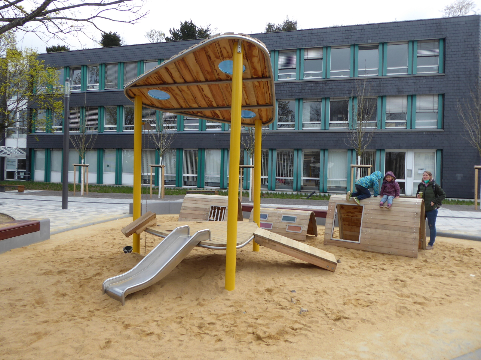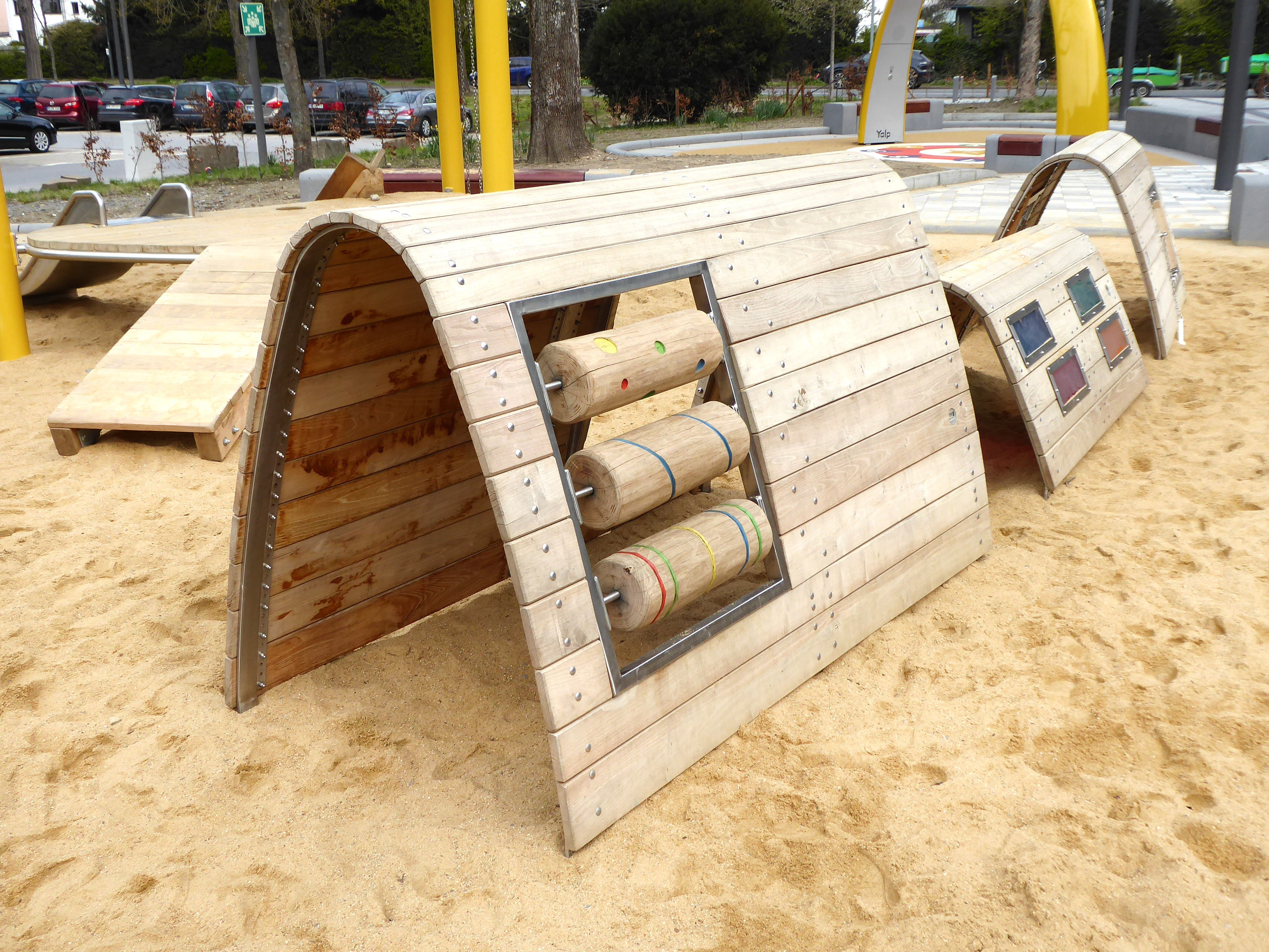 Zentral befindet sich das Spielhäuschen in fröhlichem Ginstergelb. Die Dachkonstruktion ist mit bunten Fenstern ausgestattet, die bei Sonneneinstrahlung Farben auf den Boden reflektieren, Auf dem Podest wird der Sand mit dem Sandaufzug von unten nach oben befördert und durch die im Boden eingelassenen Siebe fließt der Sand langsam wieder zurück zum Boden. Kleine Steinchen werden herausgefiltert – vielleicht ist ja ein Schatz dabei?
