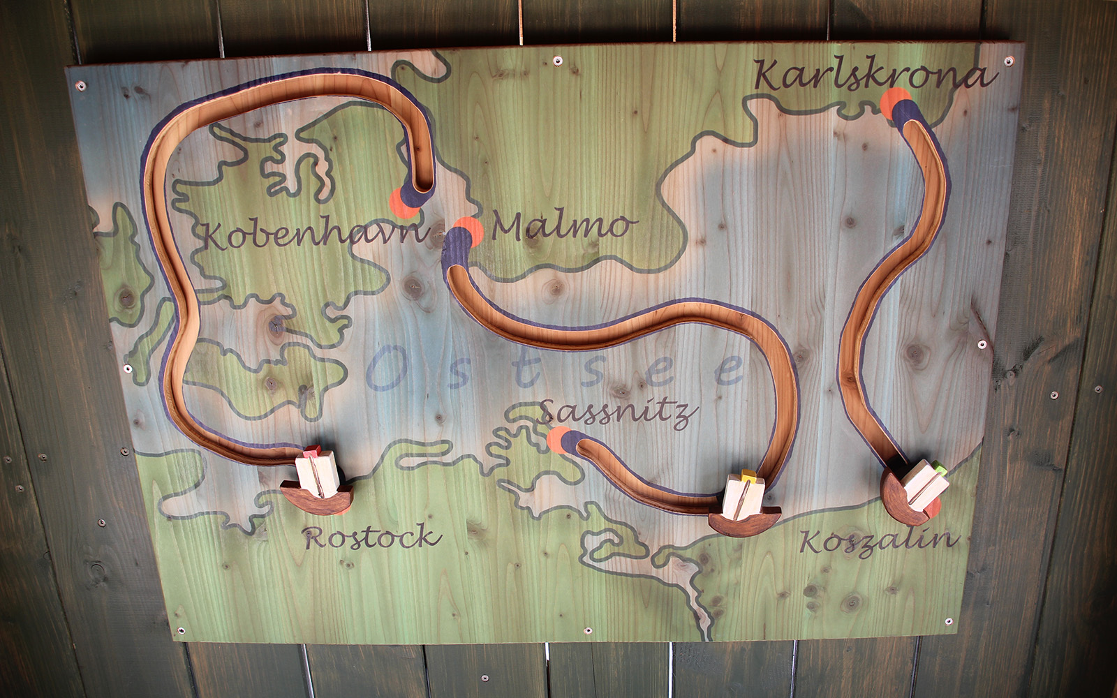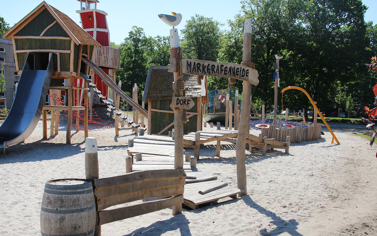 An alle Leichtmatrosen, Schiffsmädchen und Kapitäne: Auf der Spielanlage Markgrafenheide im Ostseeferienzentrum schlagen garantiert kleine Seemannsherzen höher. Ganz gleich, ob es nach Kopenhagen oder Malmö gehen soll, das Schiff findet dank Kompass und Steuerrad immer seinen Zielhafen. Und schwupps geht der Kutter vor Anker und die Mannschaft macht sich zum Landgang bereit. Auf dem hohen Leuchtturm werden die Besucher schon von weitem entdeckt, so dass im Dorf jetzt alles für eine riesige Willkommensfeier vorbereitet ist. Auf dieser Spielanlage steht ganz einfach phantasievolles Spiel im Fokus.
