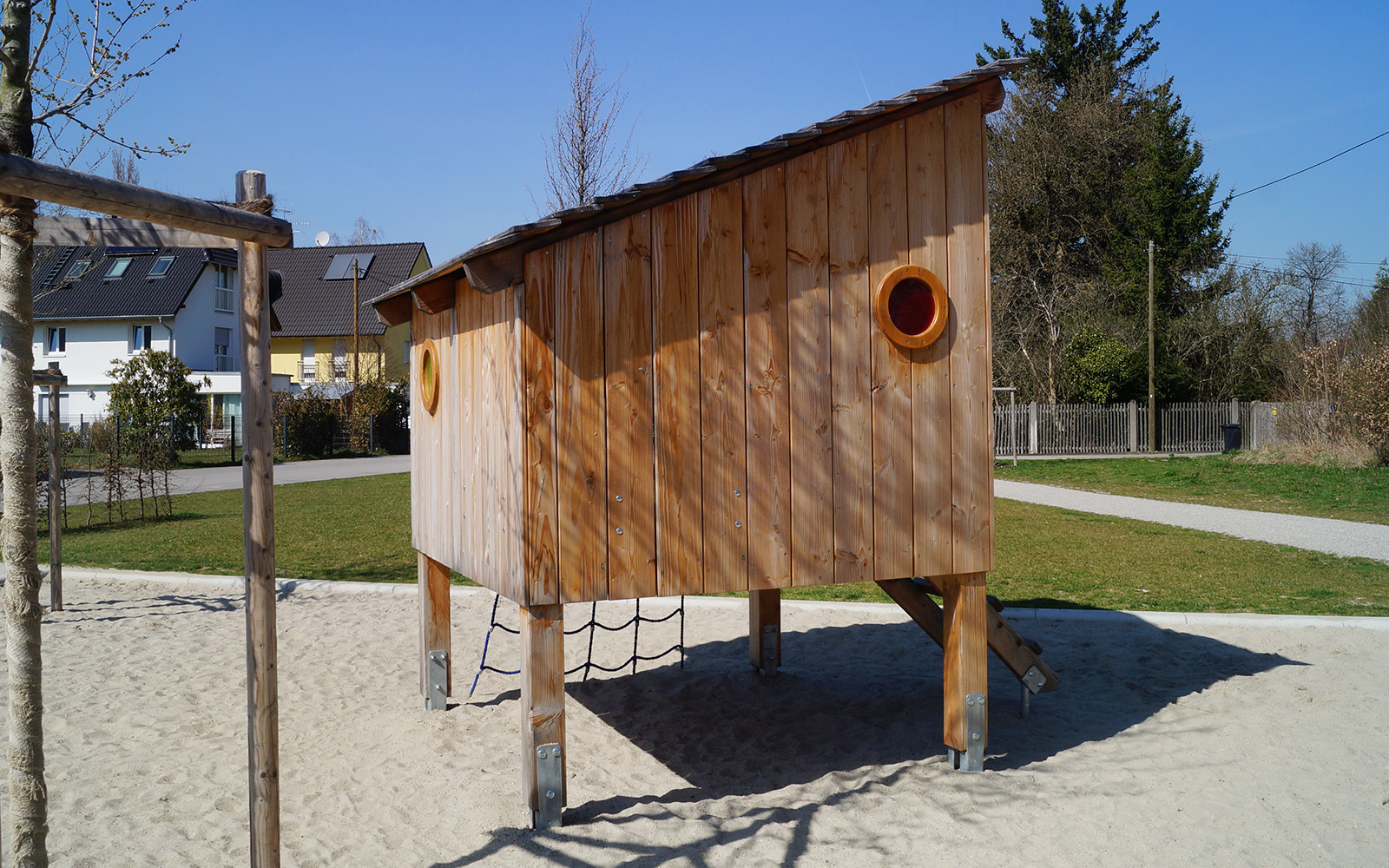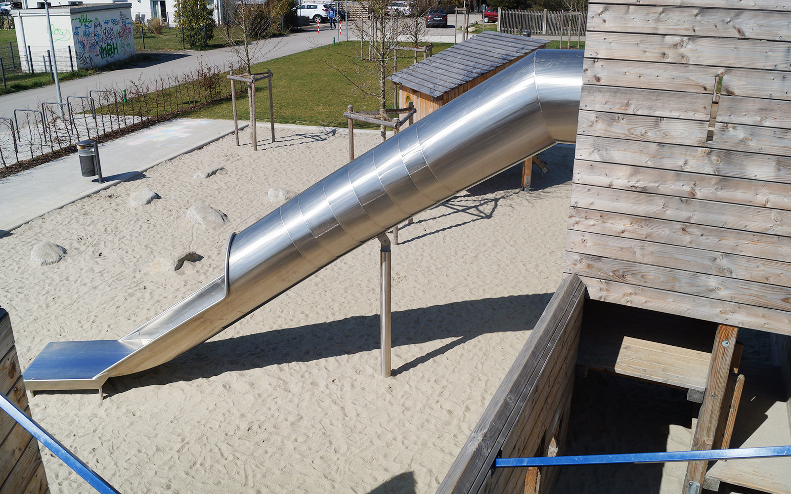 Einen wohnungsnahen Erlebnisspielplatz haben wir in München, Aubing-Ost, umsetzen dürfen. Der geradlinige Entwurf des Landschaftsarchitekturbüros Terrabiota wurde von uns mit Douglasienholz umgesetzt. Besondere Highlights sind die Boulderwand und die Seilschlucht, die beide zum Aussichtsturm mit Tunnelrutsche führen. Die angegliederte Nestschaukel, die Malwände, der Kreiselhügel und die beiden Hütten als Rückzugsräume runden das Spielensemble ab.