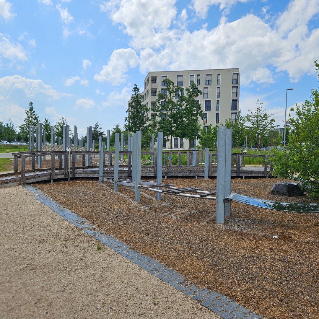 Der barrierefreie Spielplatz bietet vielfältige Spielmöglichkeiten für alle. Zahlreiche verschiedene Elemente bereichern den Platz, darunter eine barrierefreie Brücke, die so gestaltet wurde, dass sie für jeden zugänglich ist. Darüber hinaus gibt es Drehelemente und Trichtertelefone, mit denen man von einer Seite zur anderen kommunizieren kann.