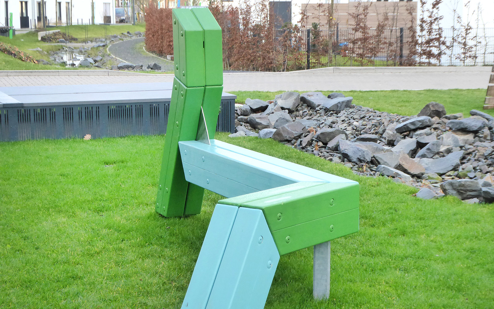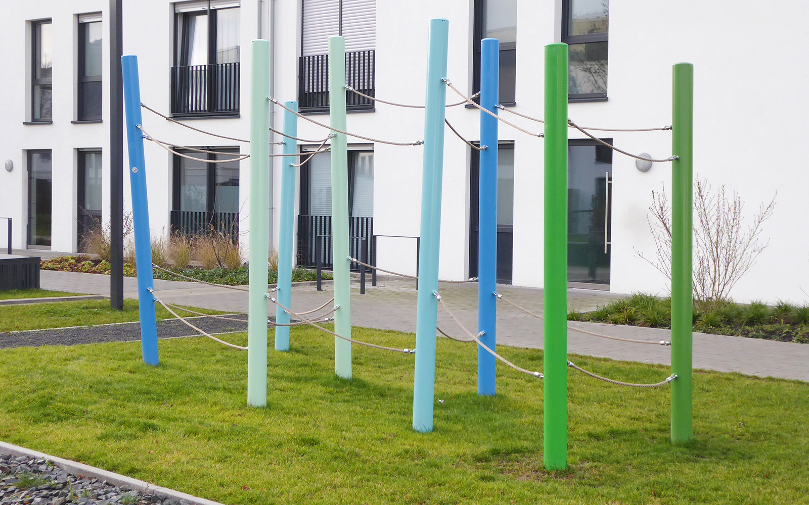 Alle Spielgeräte wie der Stangenkreisel, die Hängematte und die Sandspielanlage mit farbigem Lichtlolli entlang des Bachlaufs wurden auf einer Tiergarage montiert.