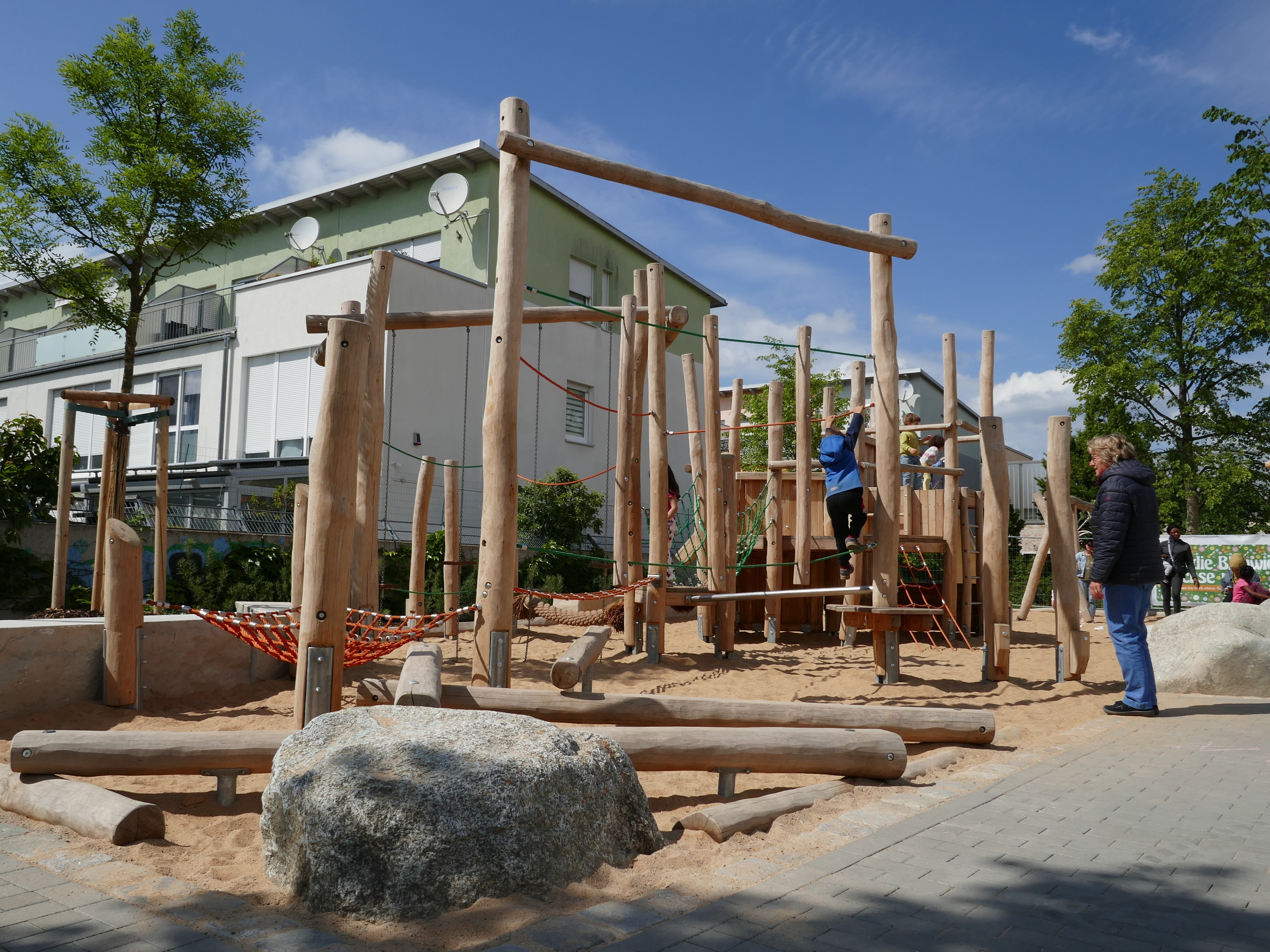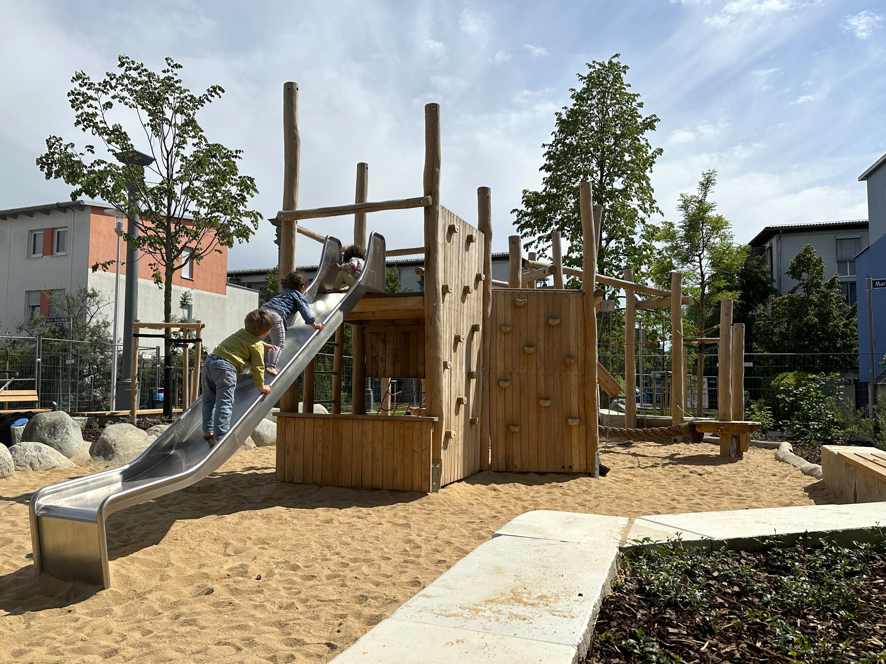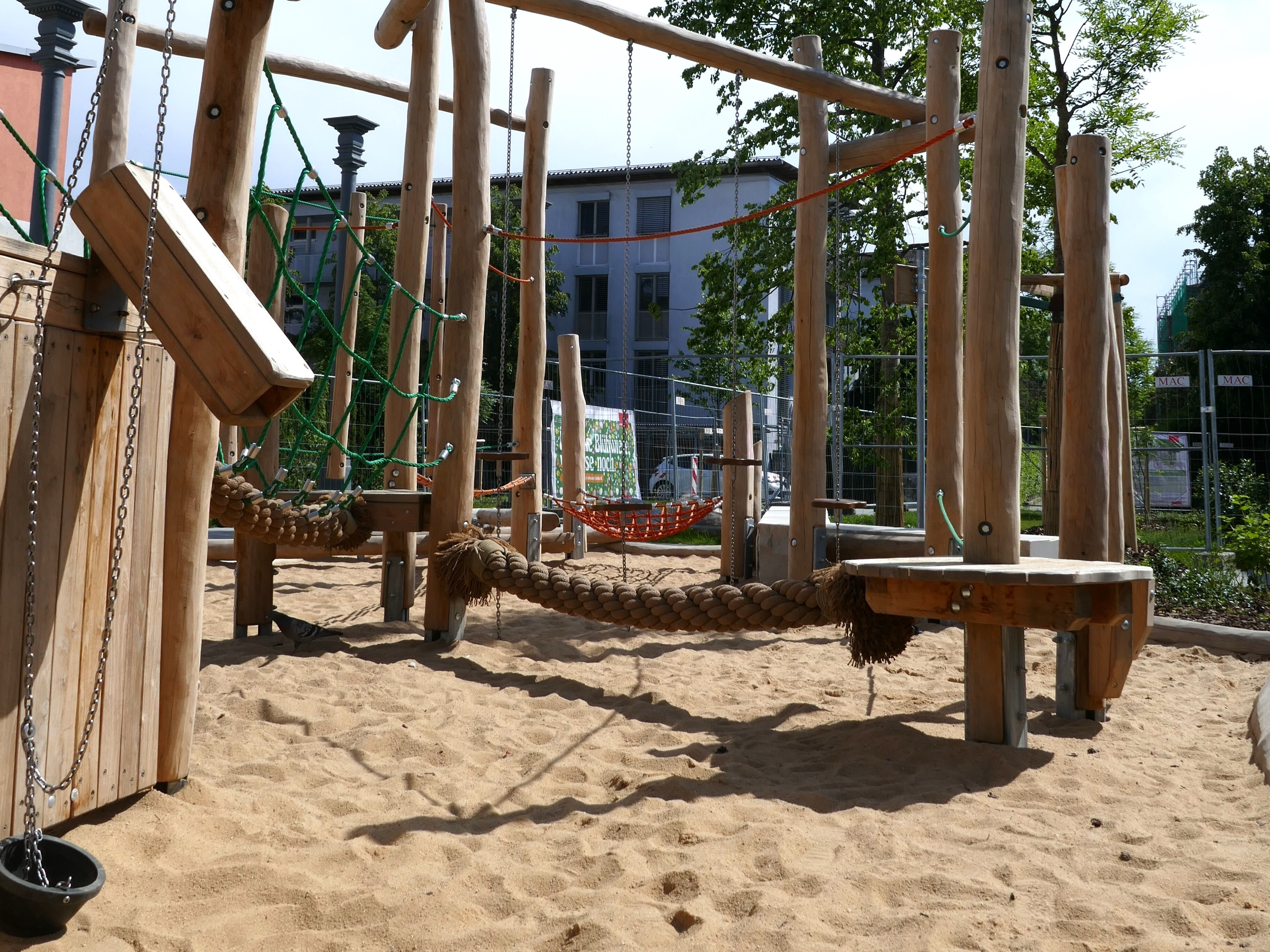 Im Stadtteil St. Leonhard/Schweinau in Nürnberg ist unter unserer Beteiligung ein solcher Ort des nachbarschaftlichen Miteinanders erfolgreich realisiert worden. Entstanden ist ein Spielplatz mit hohem Spielwert, der die Bedürfnisse aller Generationen abdeckt und zum generationsübergreifenden Spiel anregt. So bietet die weitläufige Spielkombination aus naturbelassener Robinie nicht nur Möglichkeiten zum Klettern und Rutschen für Kinder, sondern lädt große und kleine Spielplatzbesucherinnen und -besucher zum gemeinsamen Spiel mit dem Sandaufzug ein. Unterhalb der Rutsche verbirgt sich eine Theke, die zum Rollen- und Versteckspiel genutzt werden kann.