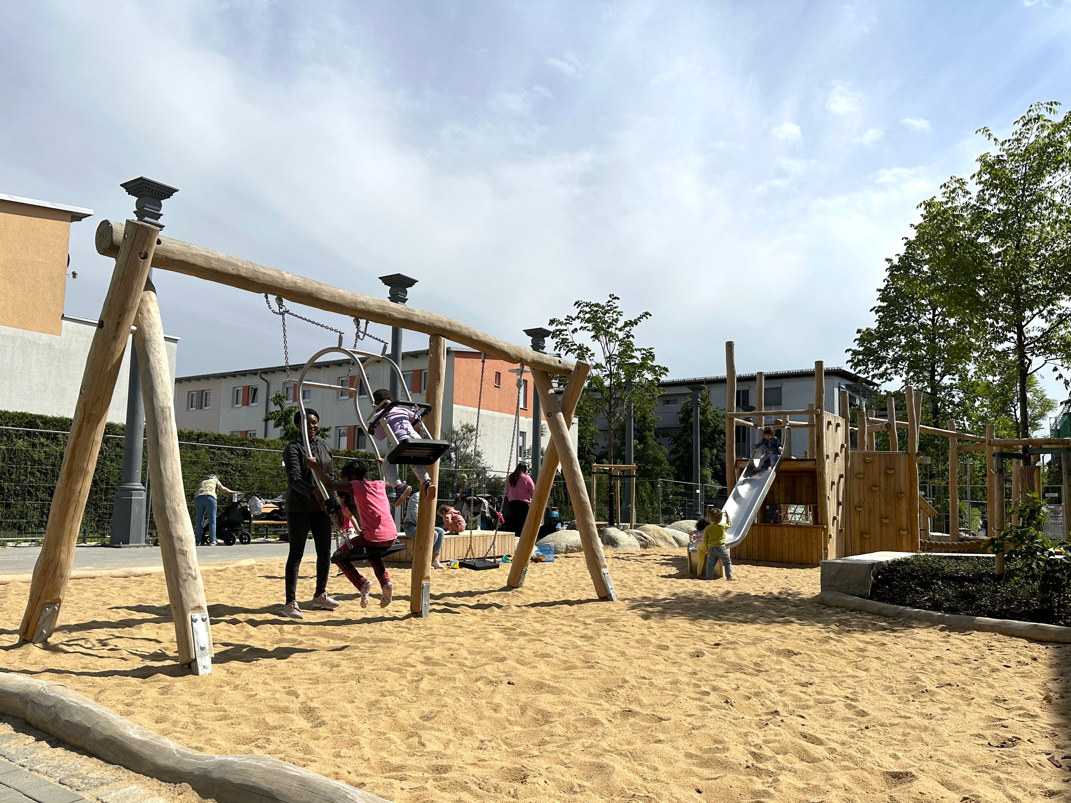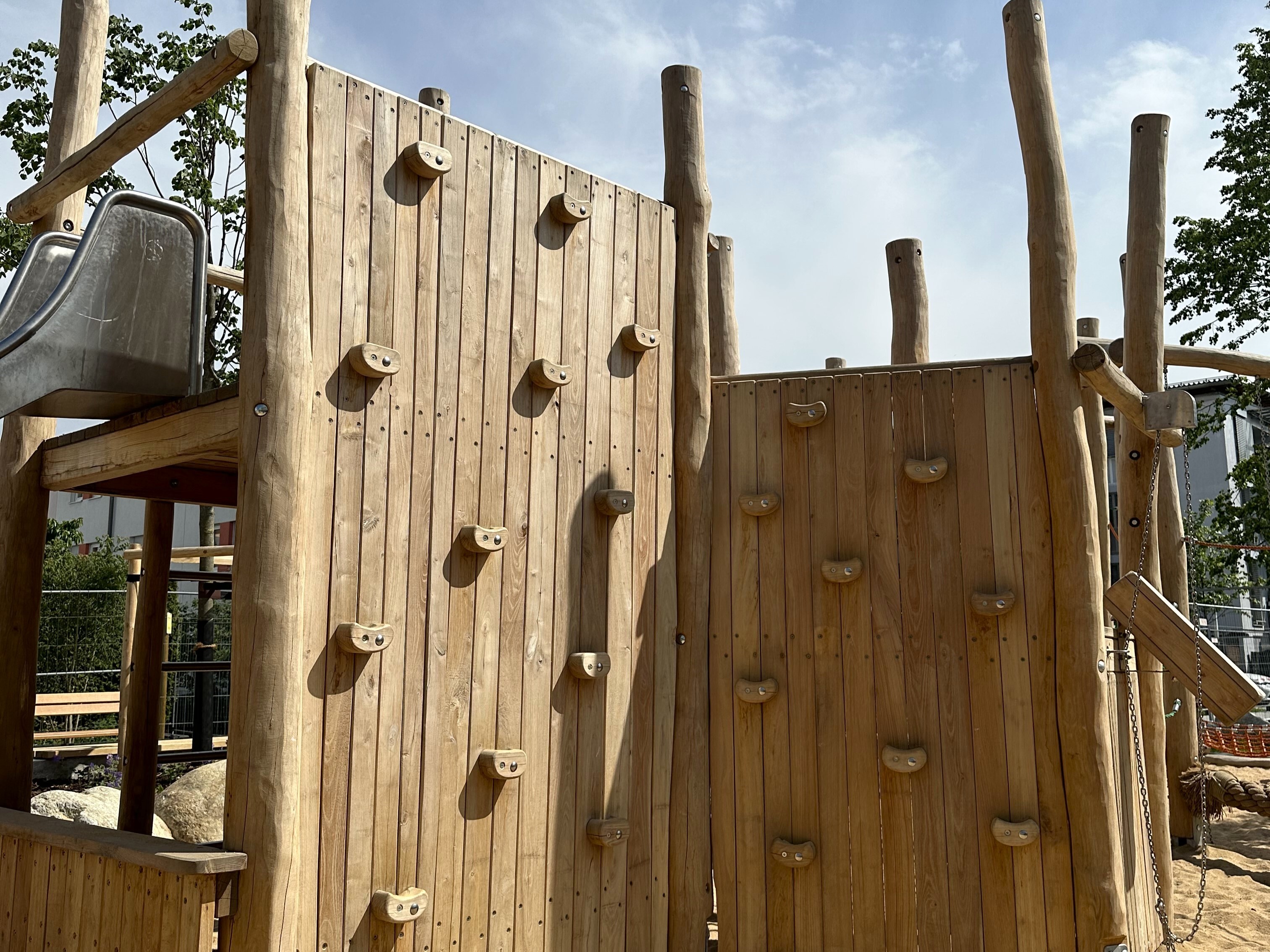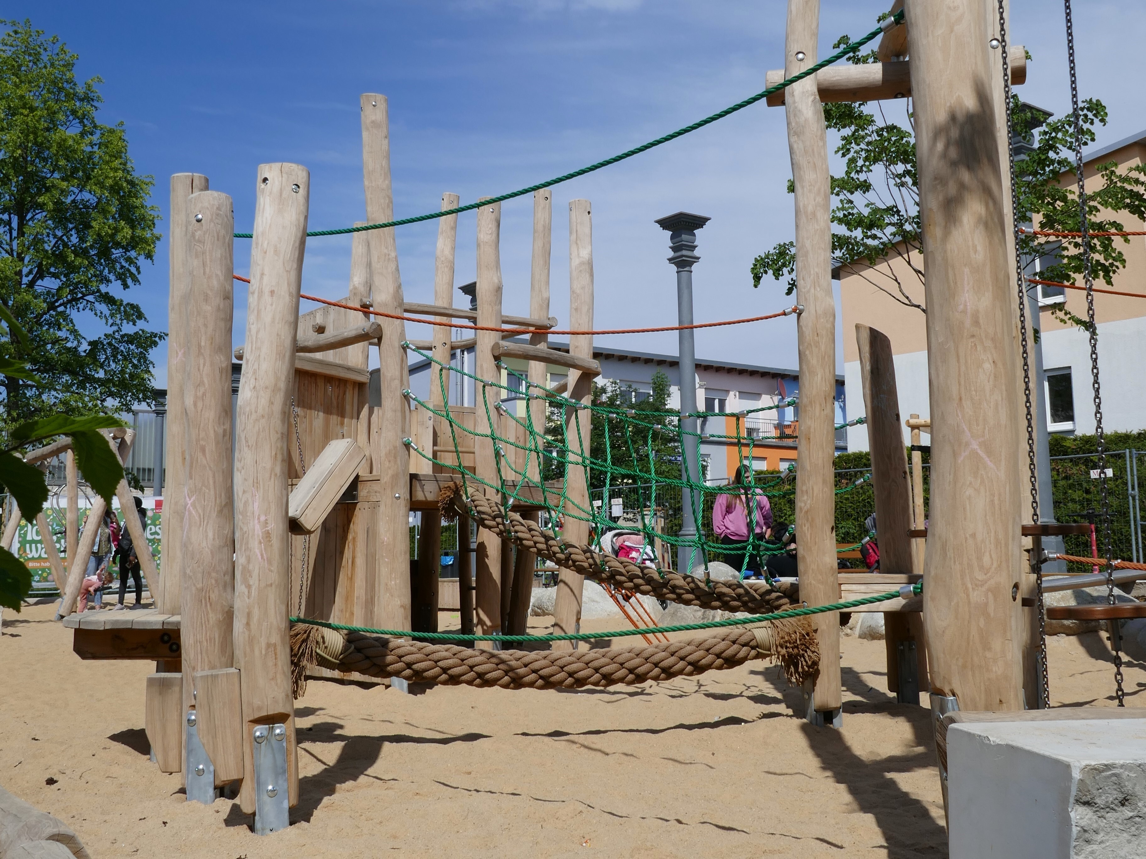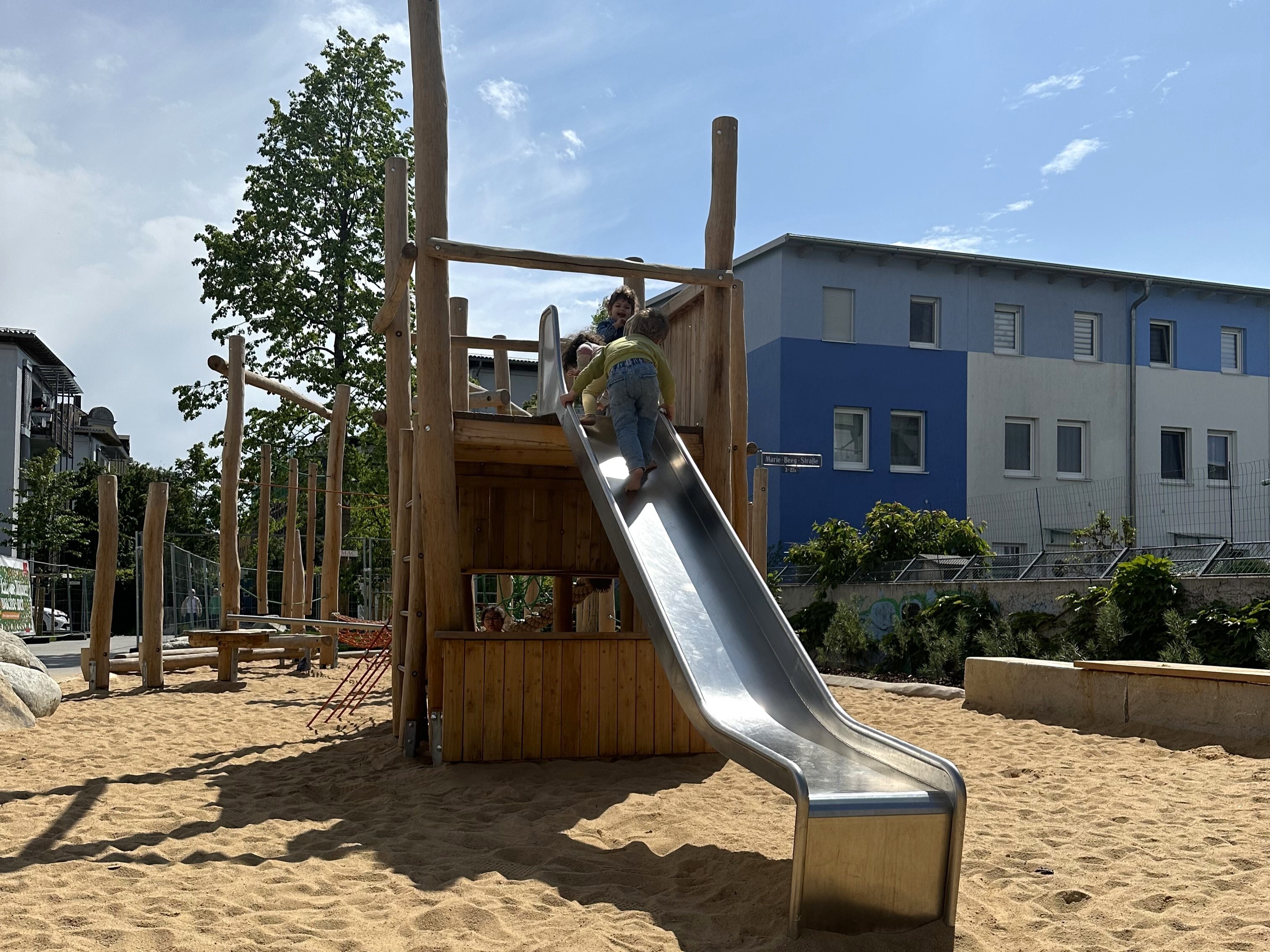 Im Stadtteil St. Leonhard/Schweinau in Nürnberg ist unter unserer Beteiligung ein solcher Ort des nachbarschaftlichen Miteinanders erfolgreich realisiert worden. Entstanden ist ein Spielplatz mit hohem Spielwert, der die Bedürfnisse aller Generationen abdeckt und zum generationsübergreifenden Spiel anregt. So bietet die weitläufige Spielkombination aus naturbelassener Robinie nicht nur Möglichkeiten zum Klettern und Rutschen für Kinder, sondern lädt große und kleine Spielplatzbesucherinnen und -besucher zum gemeinsamen Spiel mit dem Sandaufzug ein. Unterhalb der Rutsche verbirgt sich eine Theke, die zum Rollen- und Versteckspiel genutzt werden kann.