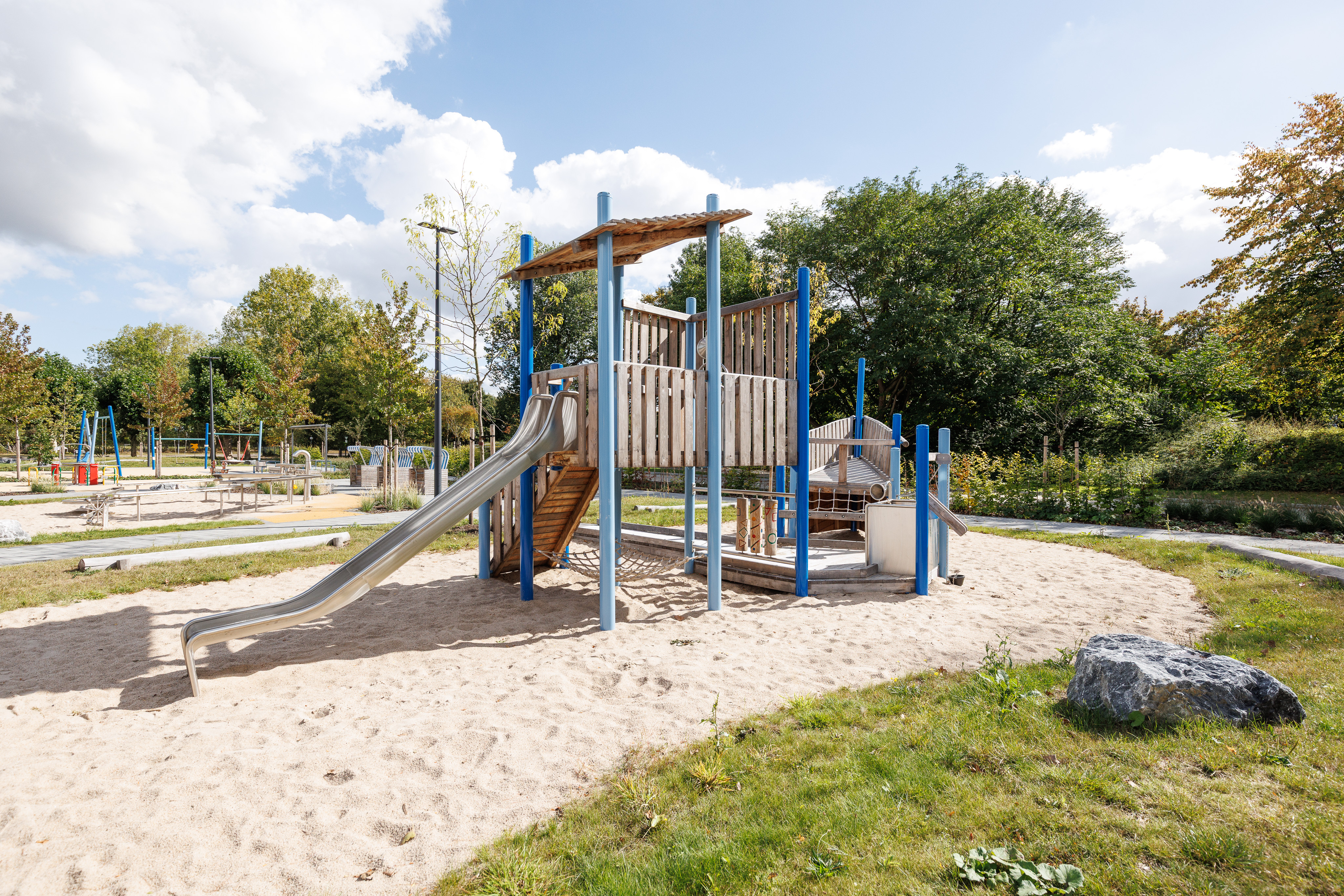 Das neue Spielschiff wurde bewusst barrierearm gestaltet: breite Rampen, gut erreichbare Spielbereiche und klar erkennbare Strukturen ermöglichen es auch Kindern mit körperlichen Einschränkungen, aktiv am Spiel teilzunehmen. Unterschiedliche Ebenen und ertastbare Materialien bieten zusätzliche Sinnesreize und fördern eigenständiges Erkunden.