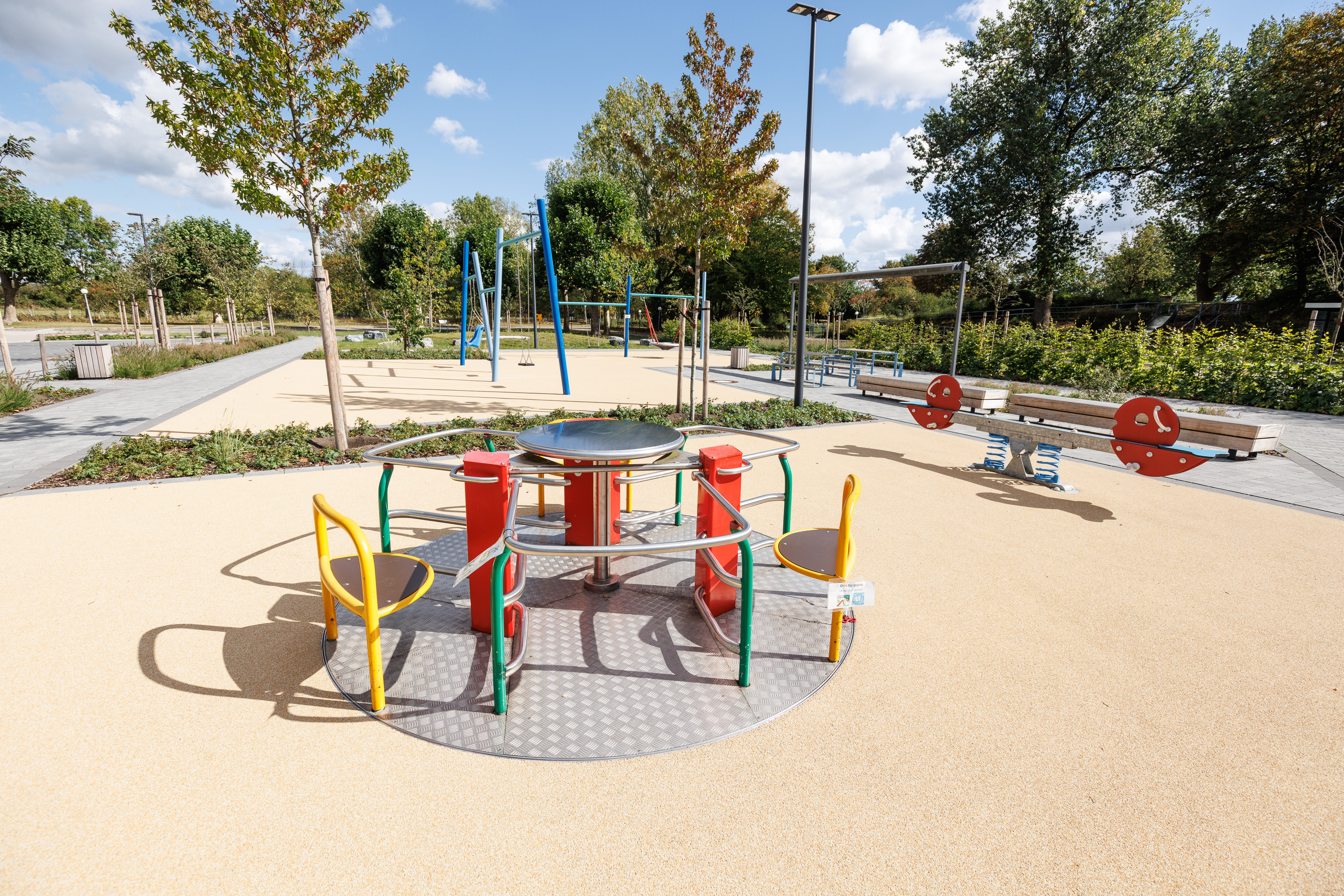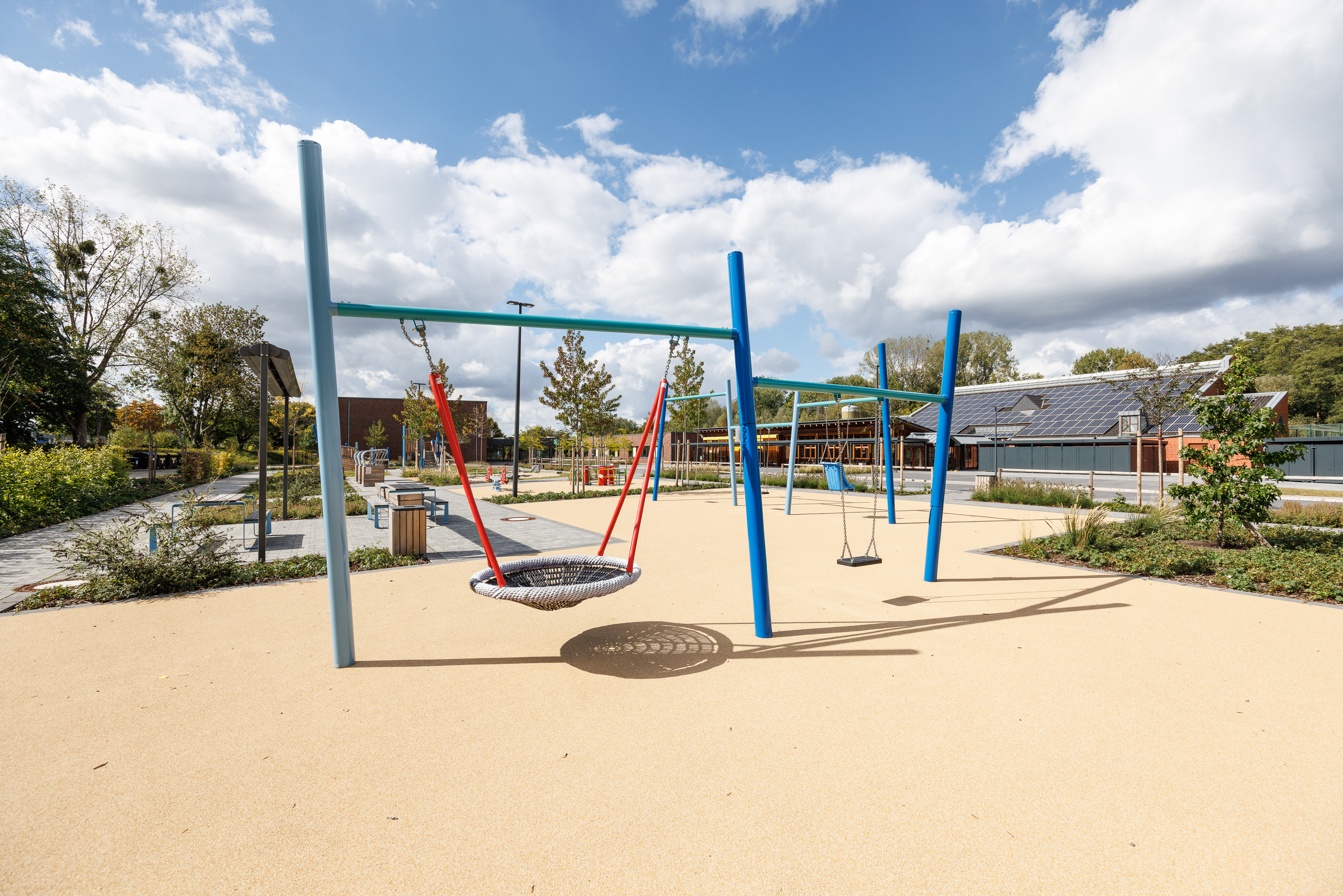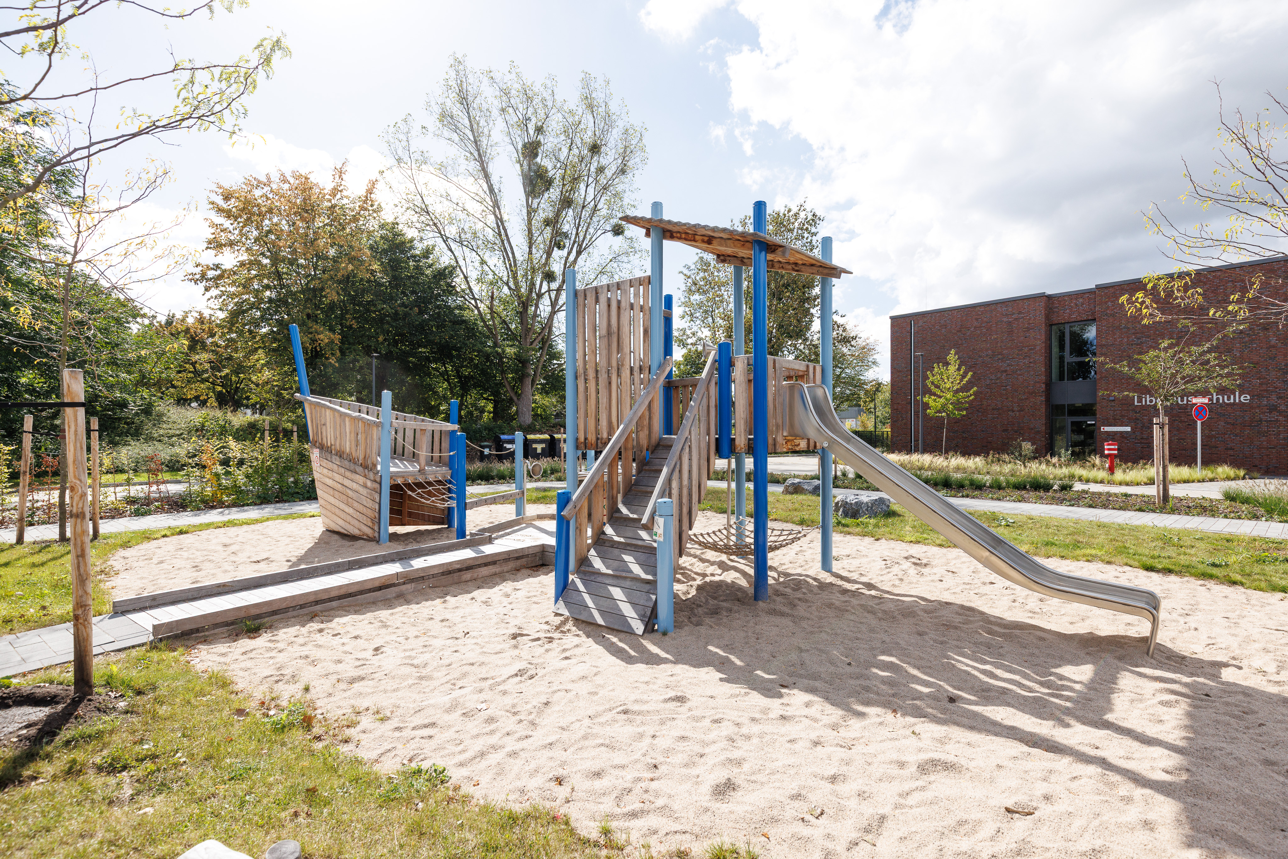 Auf dem Schulhof der LWL-Liboriusschule in Paderborn ist eine moderne inklusive Spiellandschaft entstanden, die allen Schülerinnen und Schülern – unabhängig von motorischen oder sensorischen Fähigkeiten – vielfältige Spiel- und Bewegungsmöglichkeiten eröffnet.