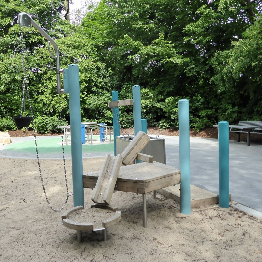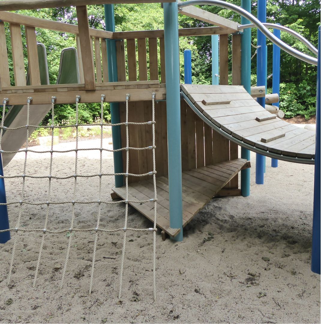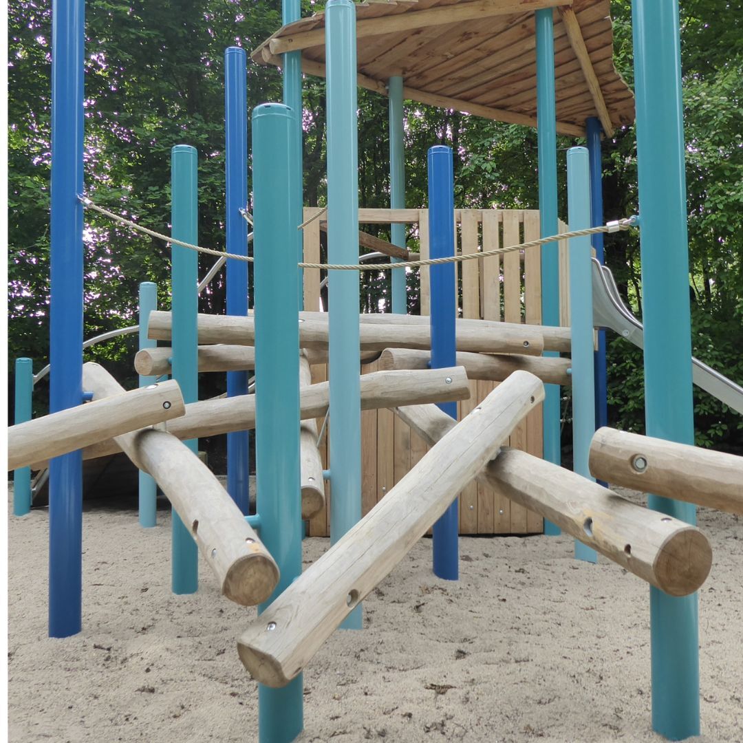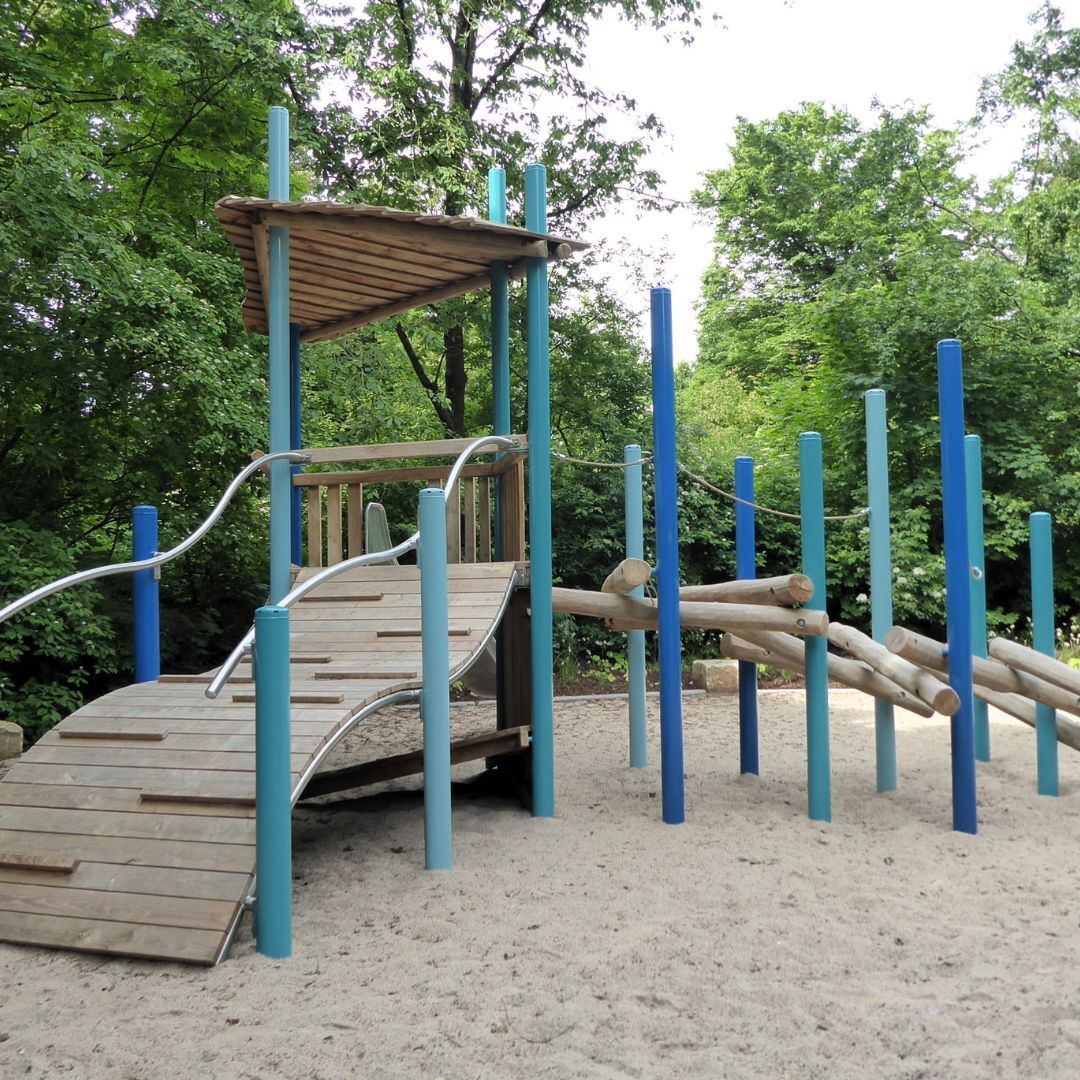 Der Turm Utrecht mit einem wilden Kletteraufstieg und einer großen Wellenrampe fällt den Besucher*innen sofort ins Auge. Das Rollstuhlfahrer-Karussell und die unterfahrbare Sandspielanlage ermöglichen auch Kindern mit Einschränkung mitzuspielen.