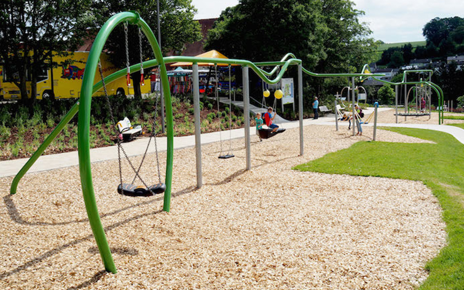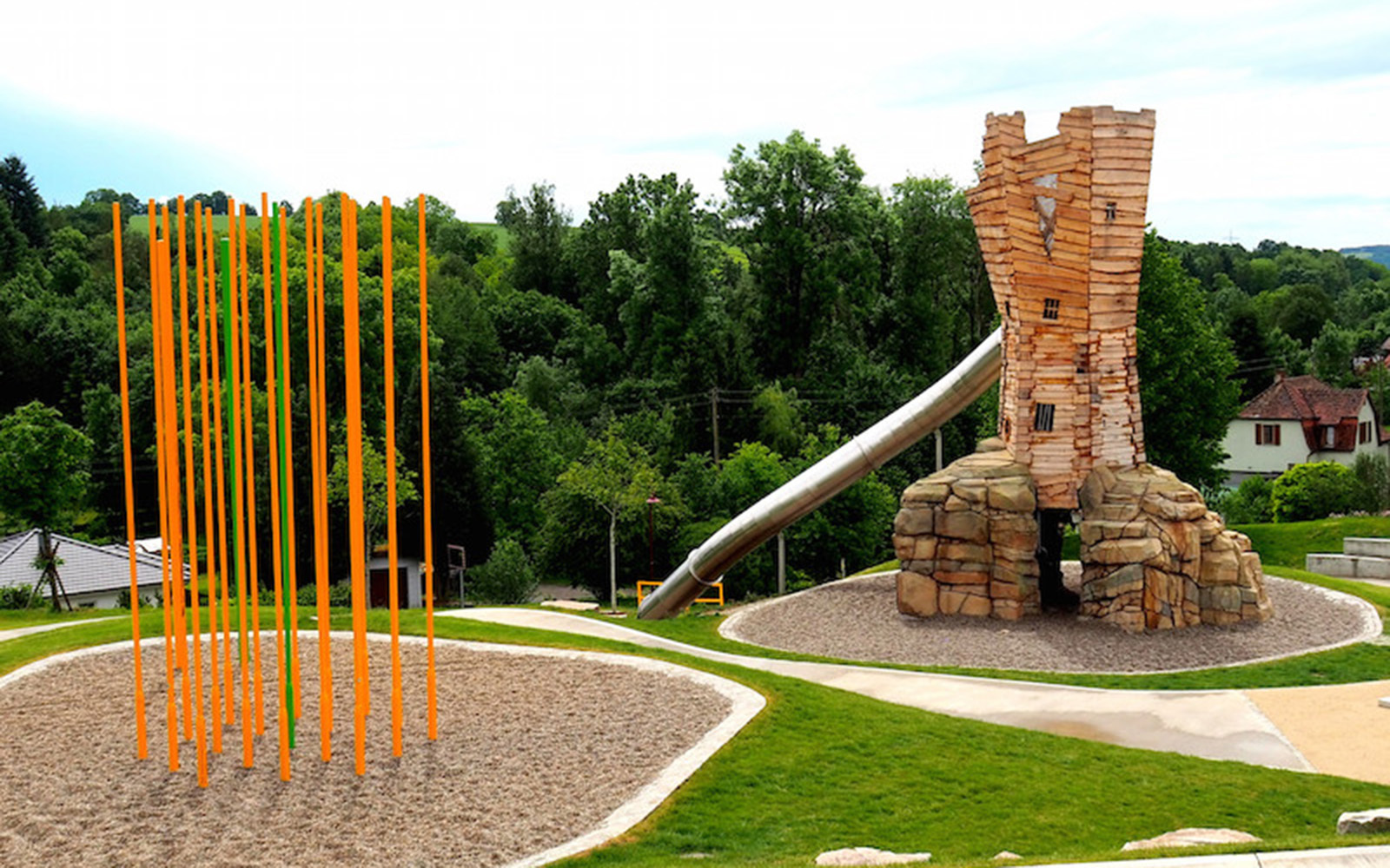 Die bereits seit einem Jahr eröffnete 7.000 Quadratmeter große alla hopp!-Anlage in Ravenstein wurde vom Landschaftsarchitekturbüro Hink geplant. „Die Anlage beinhaltet einen zentralen, den Hang hinabschwingenden Weg aus Ortbeton, der unter dem Motto „Der Weg ist das Spiel" die Verbindung zwischen den einzelnen Objekten und Elementen herstellt“, erläutert Architekt Michael Hink. Ausgehend vom Schlossparkplatz, dem Ausgangspunkt dieses Weges, gelangt der Besucher über eine Treppe auf eine Schaukelpromenade mit verschiedensten, über ein Stahlrohr miteinander verbundenen Schaukelmöglichkeiten und einer schönen Aussicht über das Gelände und die Landschaft. Ein weiteres Highlight ist der „Ruinenturm“ aus Stahl und Holz, der über dem gesamten Platz thront und mit seiner langen Röhrenrutsche und seinem bekletterbaren Felsen Lust auf Bewegung und Perspektivwechsel macht.