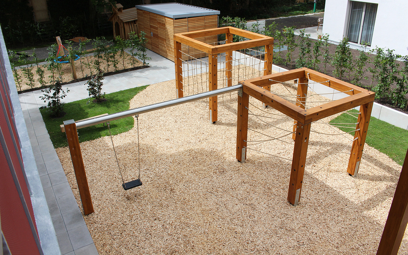 In Deutschland entsteht gerade viel neuer Wohnraum und somit auch neuer Spielraum. In Stuttgart am Killesberg ist in einer neuen Wohnanlage ein Spielplatz entstanden, der die gerade moderne Architektur der Neubauten aufnimmt und auf engem Raum viele Spielmöglichkeiten bietet. Vom abgetrennten Kleinkindbereich über spannende Kletterkuben zur klassischen Schaukel über eine sonnengeschützte Rutsche lässt dieser Spielplatz nichts vermissen.