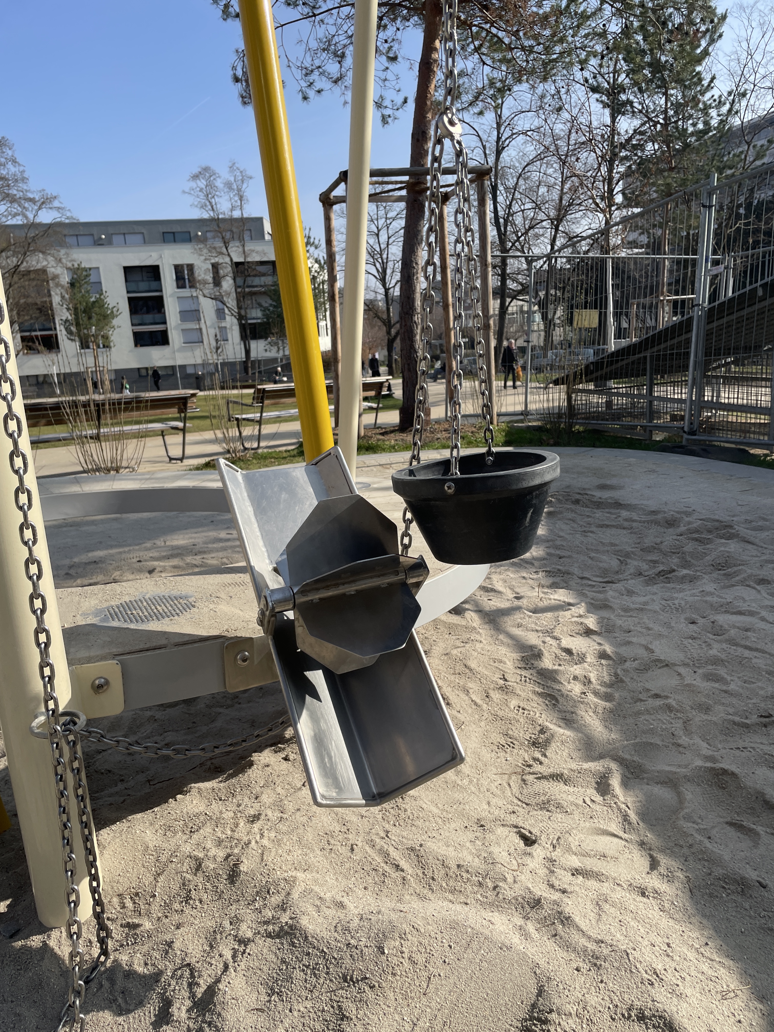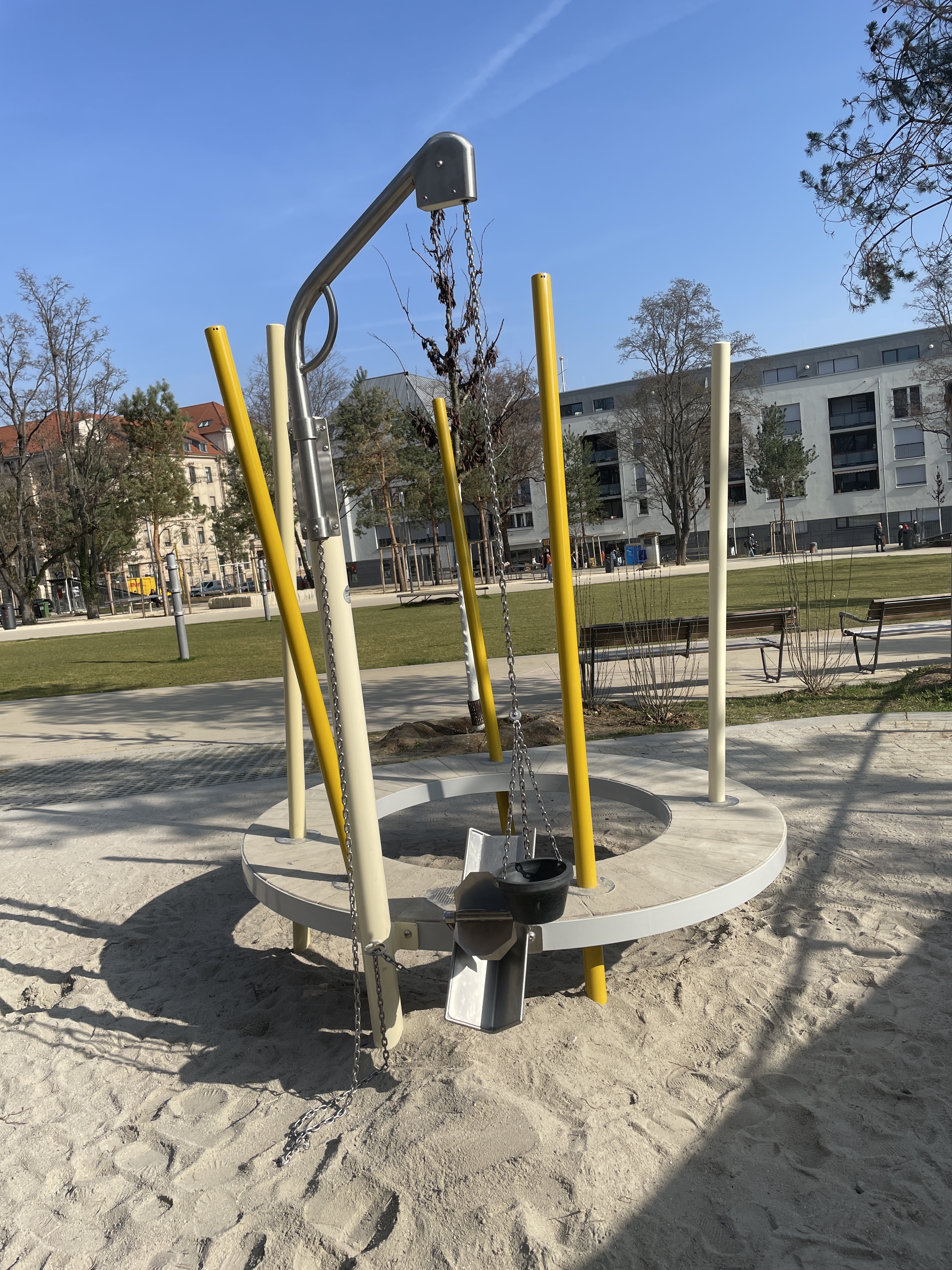 Ein zentraler Bestandteil der Neugestaltung umfasst die Spielsandfläche, die gezielt für Kleinkinder angelegt wurde. Diese wurde nun um ein Ringspiel-Sandspielpodest sowie einer Doppeltorschaukel ergänzt. Dabei bietet die Sandspielkombination den Kindern mit einem drehbaren Sandaufzug, Sandsieb und einer Sandrinne mit Sandrad vielfältige Spielmöglichkeiten.