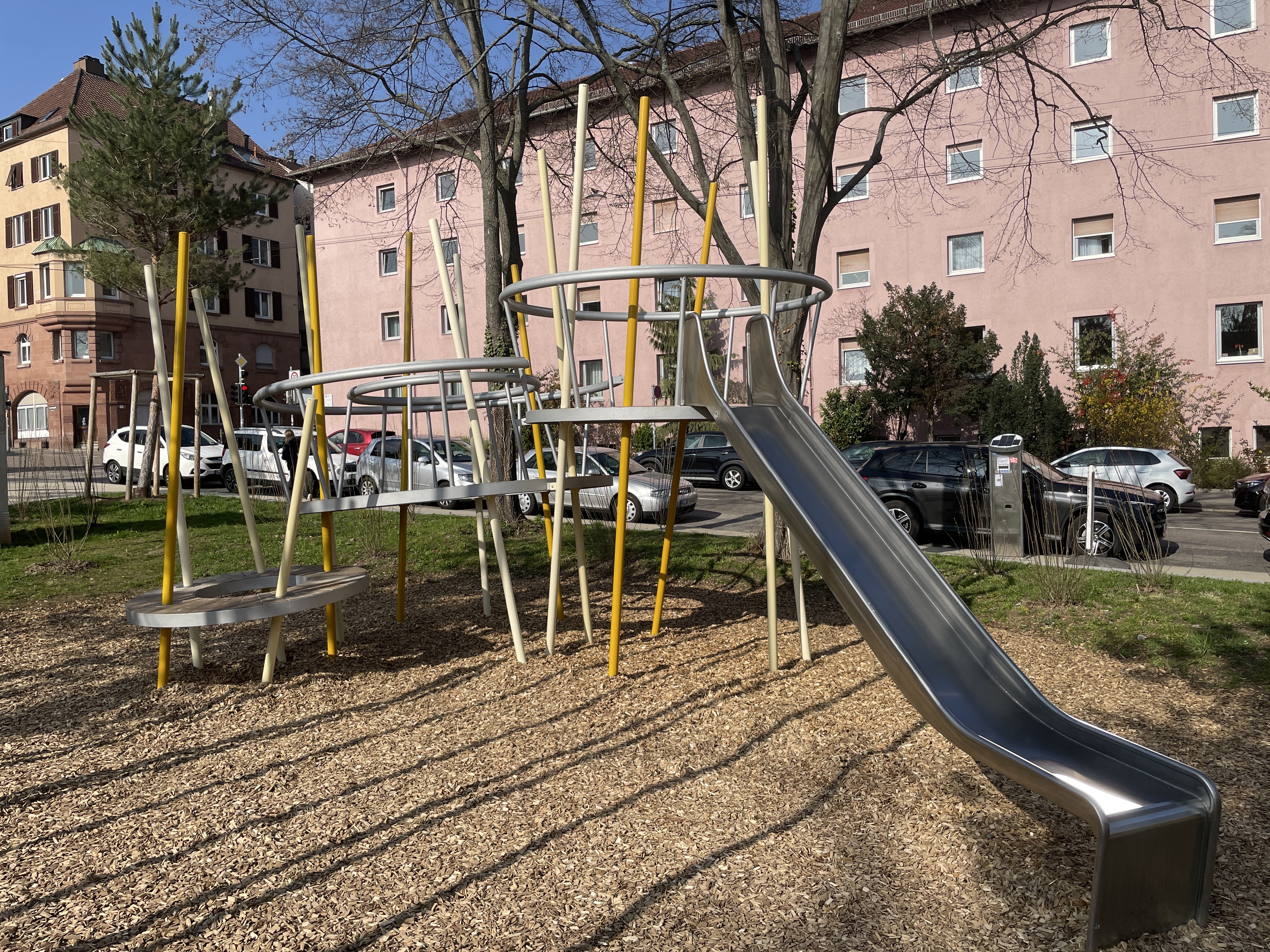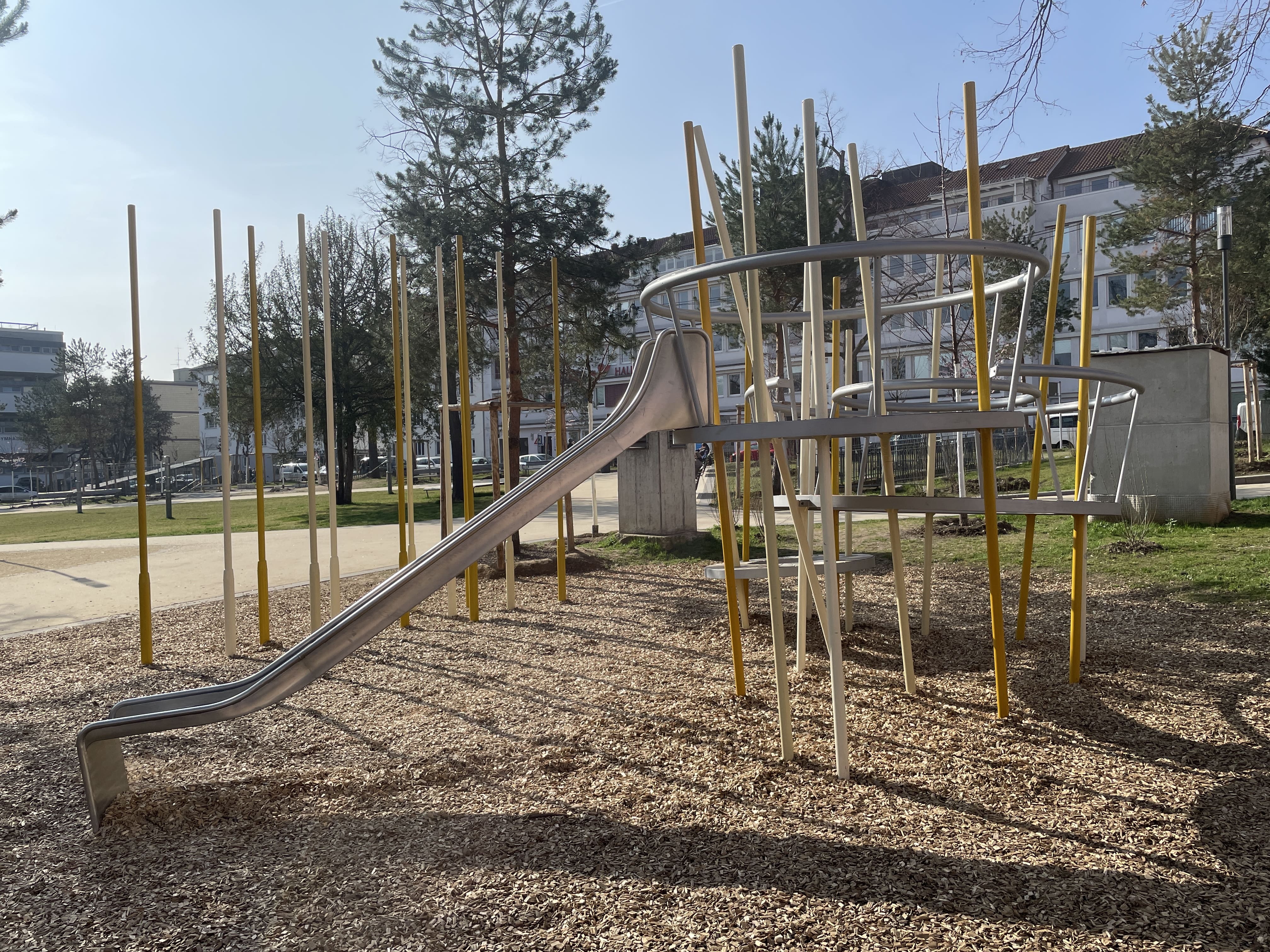 Für die älteren Kinder stehen jetzt ein Ringspiel mit drei unterschiedlich angeordneten Podesten und einer Kastenrutsche aus Edelstahl zur Verfügung. Zusätzlich gibt es 12 Mikado-Kletterstangen die für spannende Abenteuer und viel Bewegung sorgen sollen.