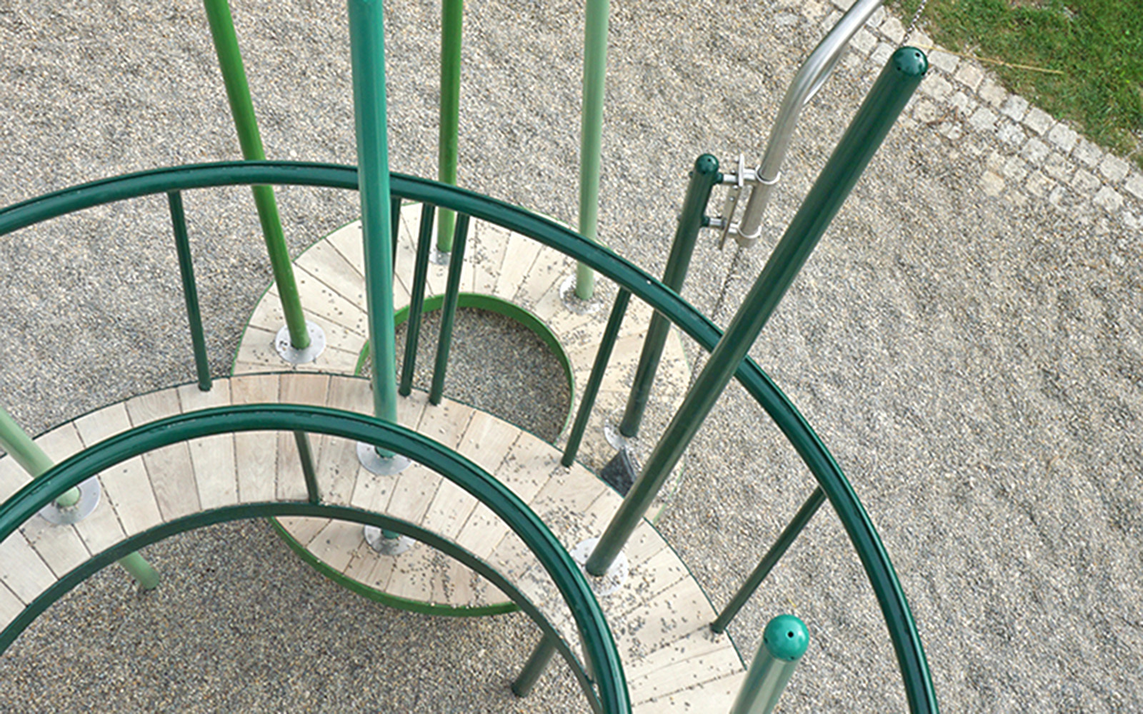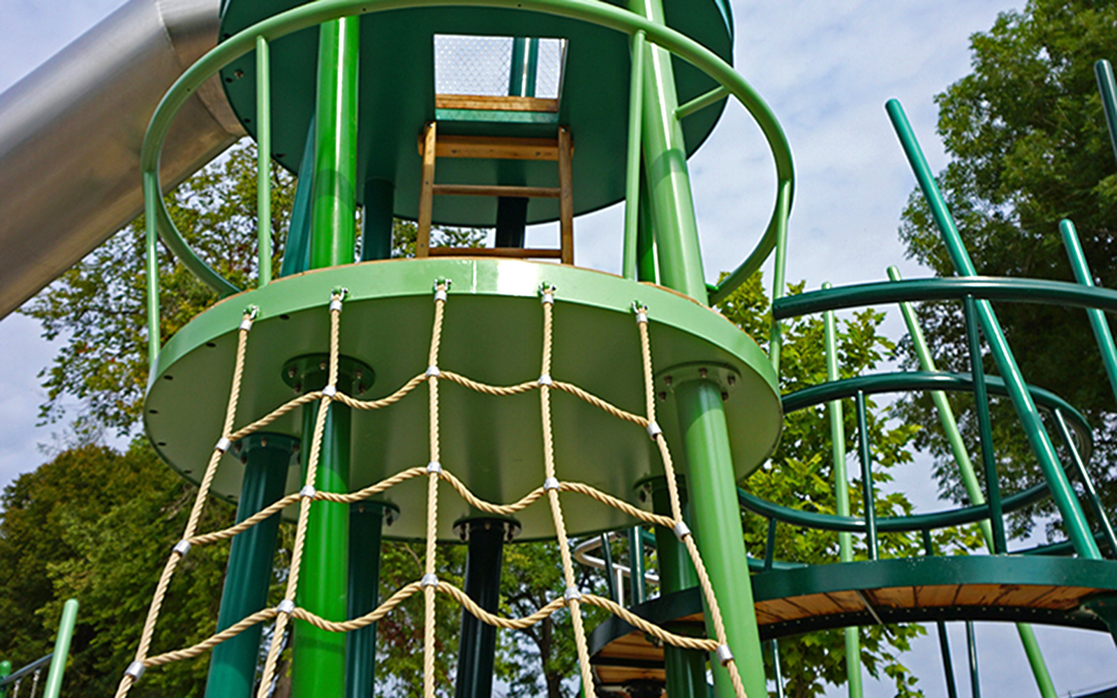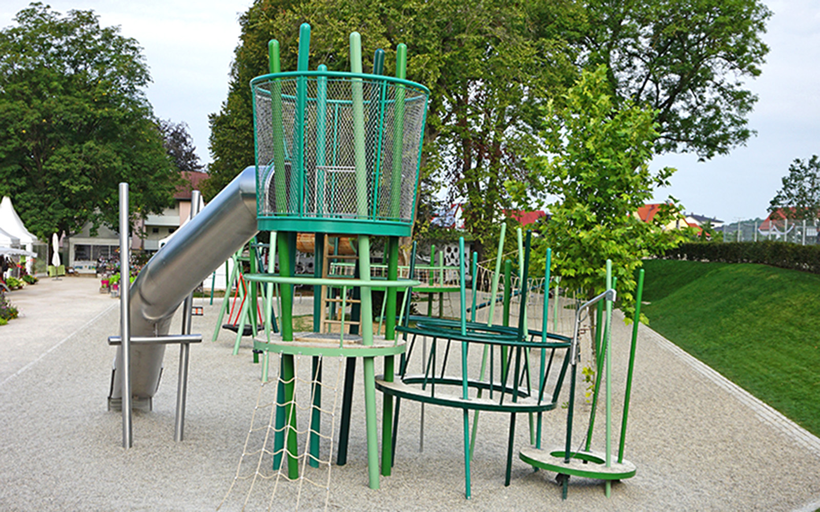 Ein Kletterturm, dessen Podeste rund sind und auf unterschiedlicher Höhe versetzt zueinander angeordnet wurden, symbolisieren Baumscheiben. Von „Baumscheibe“ zu „Baumscheibe“ geht es kletternd nach oben und abwärts kann es über Tunnelrutsche, Rutschstange, Kletternetz oder Leiter gehen – je nach gewünschtem Schwierigkeitsgrad. Zum Einsatz kommende Brüstungsnetze sind aus Edelstahl.