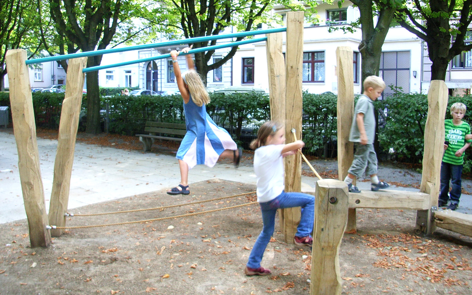 Ein Höhlenlabyrinth mit hohen Wänden hat am Anfang einen Aussichtsturm mit einem verzweigten Aufgang. Das urbane Sandspiel besteht aus drei Sandinseln mit Trocken- und Nassbereichen, belebt durch eine Wasserpumpe mit Rinnensystemen. Alte Eichenbalken, grob zugehauen, sind labyrinthartig mit teilweise beweglichen schrägen Balken, Rohren und Seilen verwoben. Einen „beruhigten“ Aufenthaltsbereich und Rückzugspotential für Erwachsene und Kinder bietet die Familiensitzgruppe.