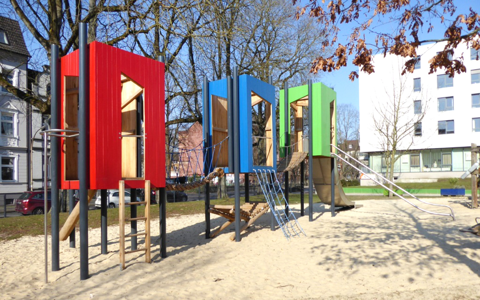 In Witten gibt es drei neue farbenfrohe Kistentürme. Bereits 2005 entwickelten wir im Rahmen der Landesgartenschau Leverkusen die ersten Kistentürme, die seitdem in unterschiedlichster Farb- und Materialkomposition bei uns immer wieder gerne eingeplant und gebaut werden. Verschiedenste Auf-, Ab- und Übergänge, die Möglichkeit des Chillens unterhalb und die Kombination mit unterschiedlichsten Rutschen (hier eine Freifallrutsche) machen die geradlinigen und dennoch verspielten Kistentürme zu einem spannenden Spielgerät.