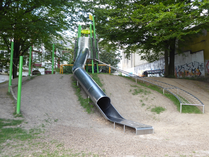 In Wuppertal-Höchsten ist am Friedrichsplatz eine eindrucksvolle Spielanlage entstanden, die Kinder auf mehreren Ebenen zum Entdecken, Klettern und Rutschen einlädt. Im Zentrum steht ein markanter Rutschenturm mit einer langen Tunnelrutsche, der schon von weitem sichtbar ist und zum Abenteuer lockt. Die Kombination aus robustem Edelstahl, farbigen Akzenten und vielfältigen Aufstiegsmöglichkeiten macht das Spielgerät zu einem Highlight des Spielplatzes.